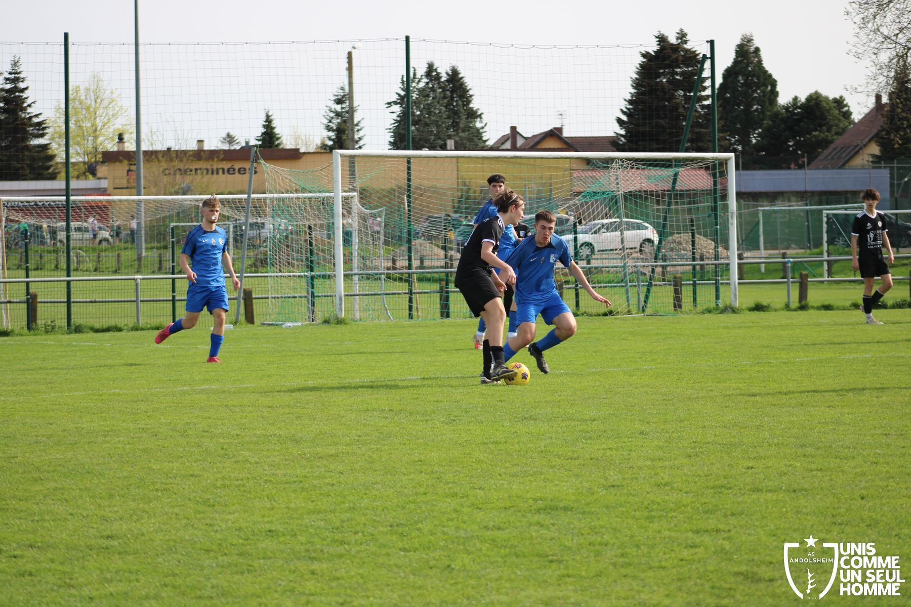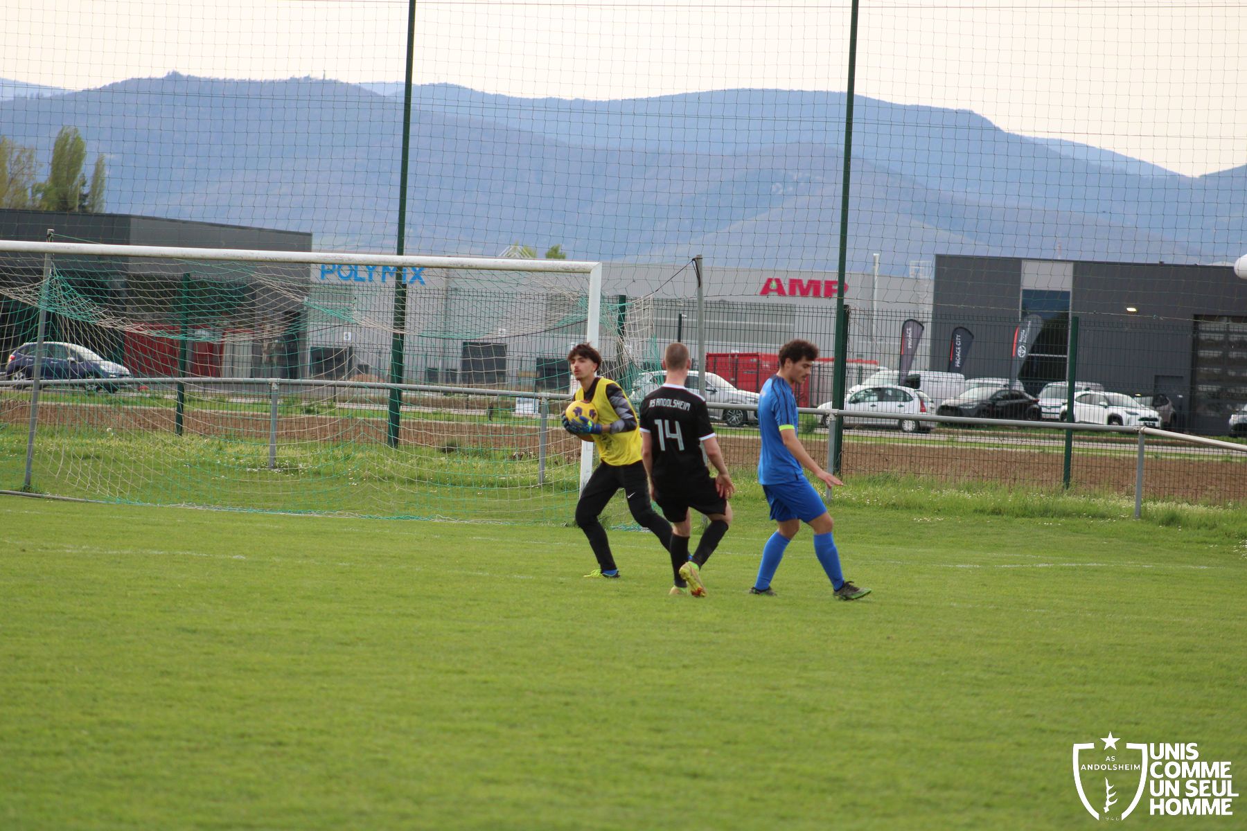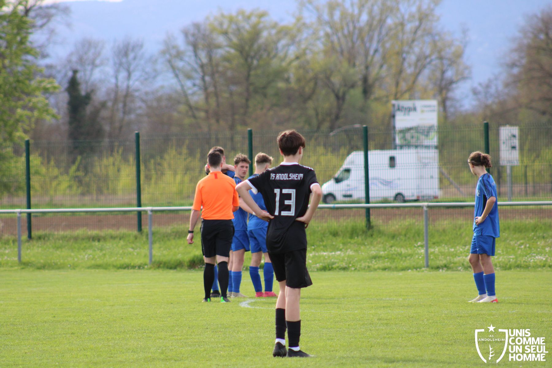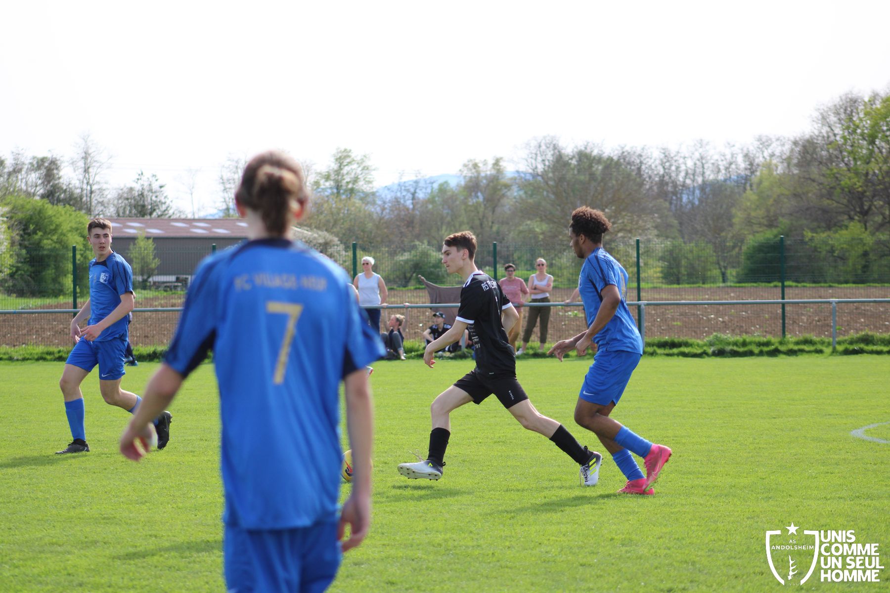 Nos verts se battent avec énergie, mais le jeu est trop désorganisé. Village-Neuf pousse avec leur foot un peu physique mais pas brutal. Mais c'est Andolsheim qui égalise suite à une perte de balle de nos adversaires au milieu de terrain. Kenan R. en profite pour placer une belle frappe croisée des 20 m.