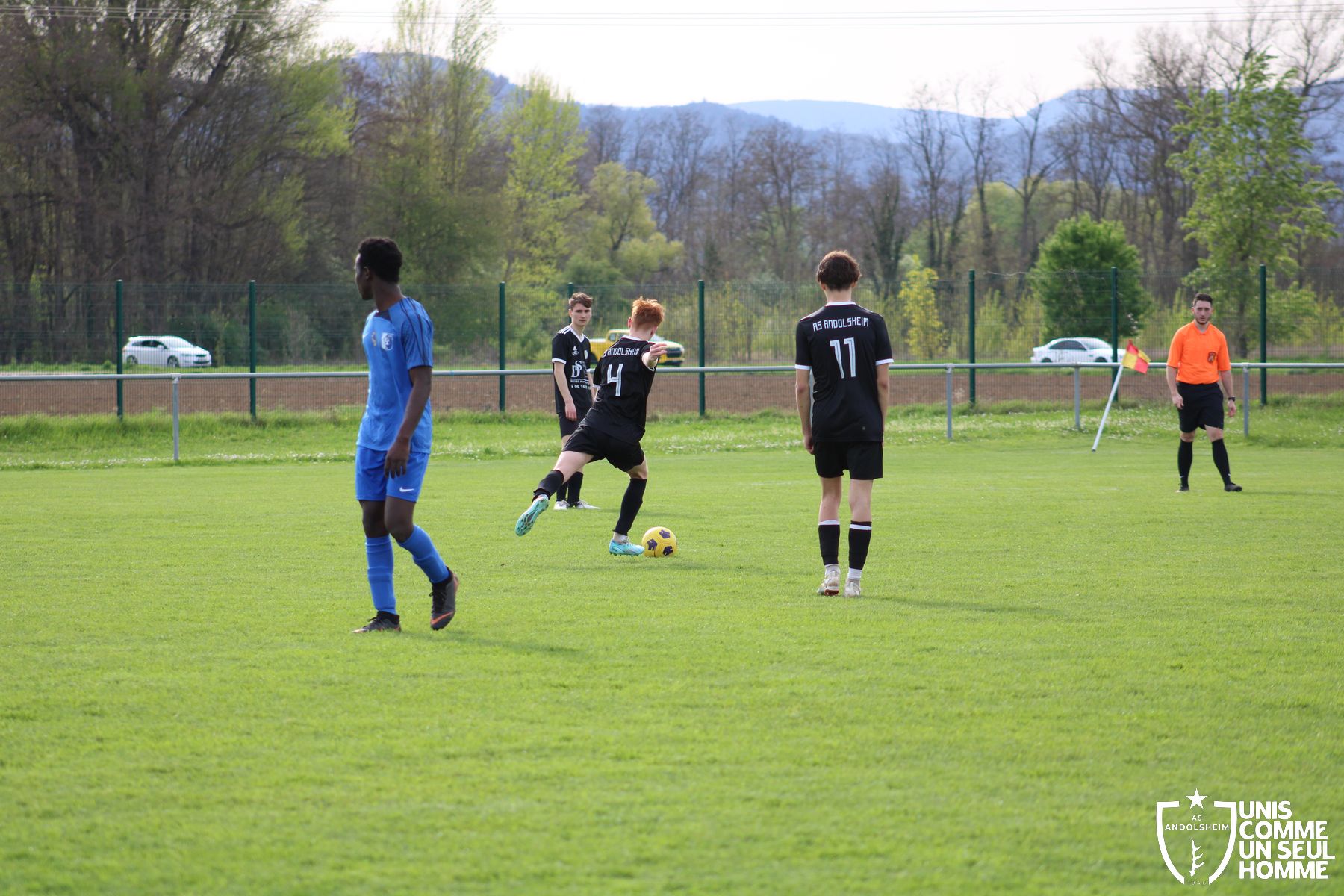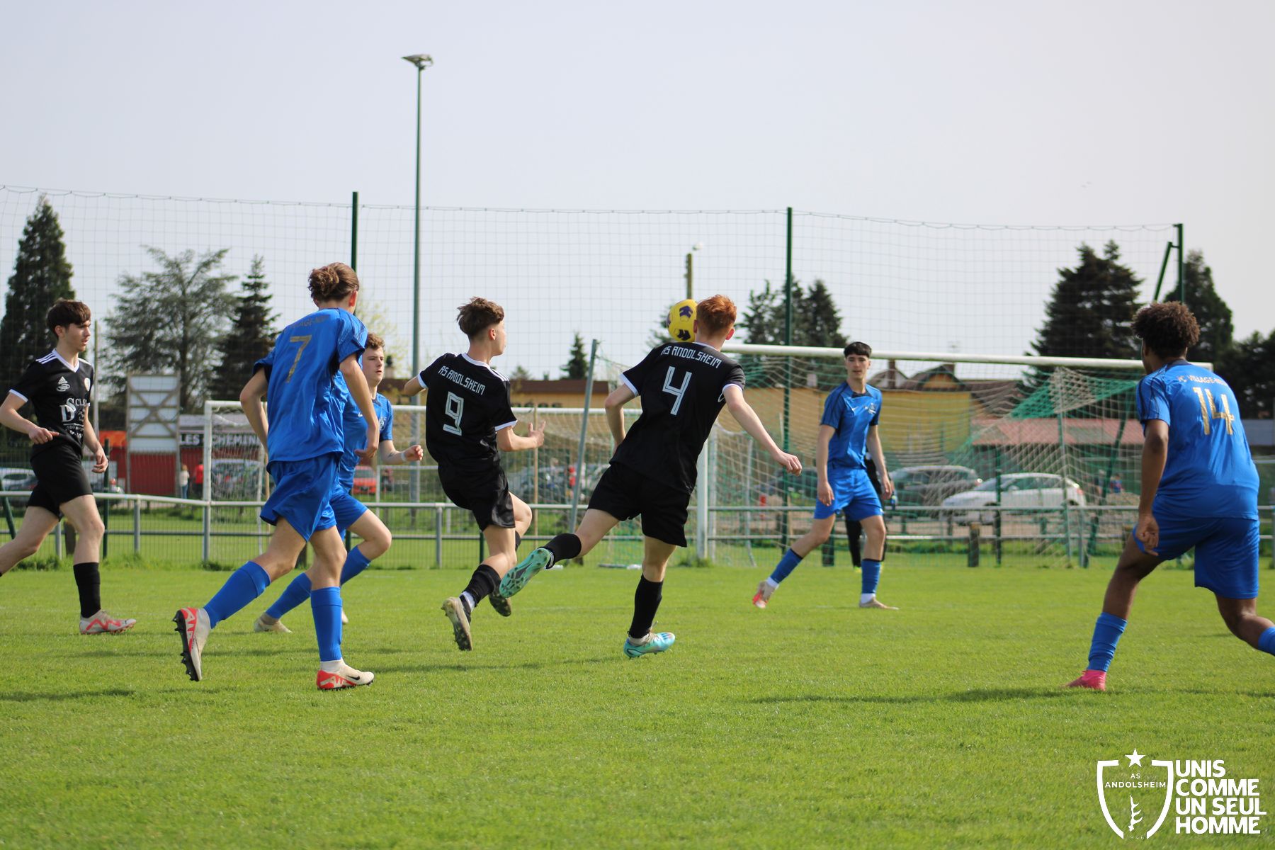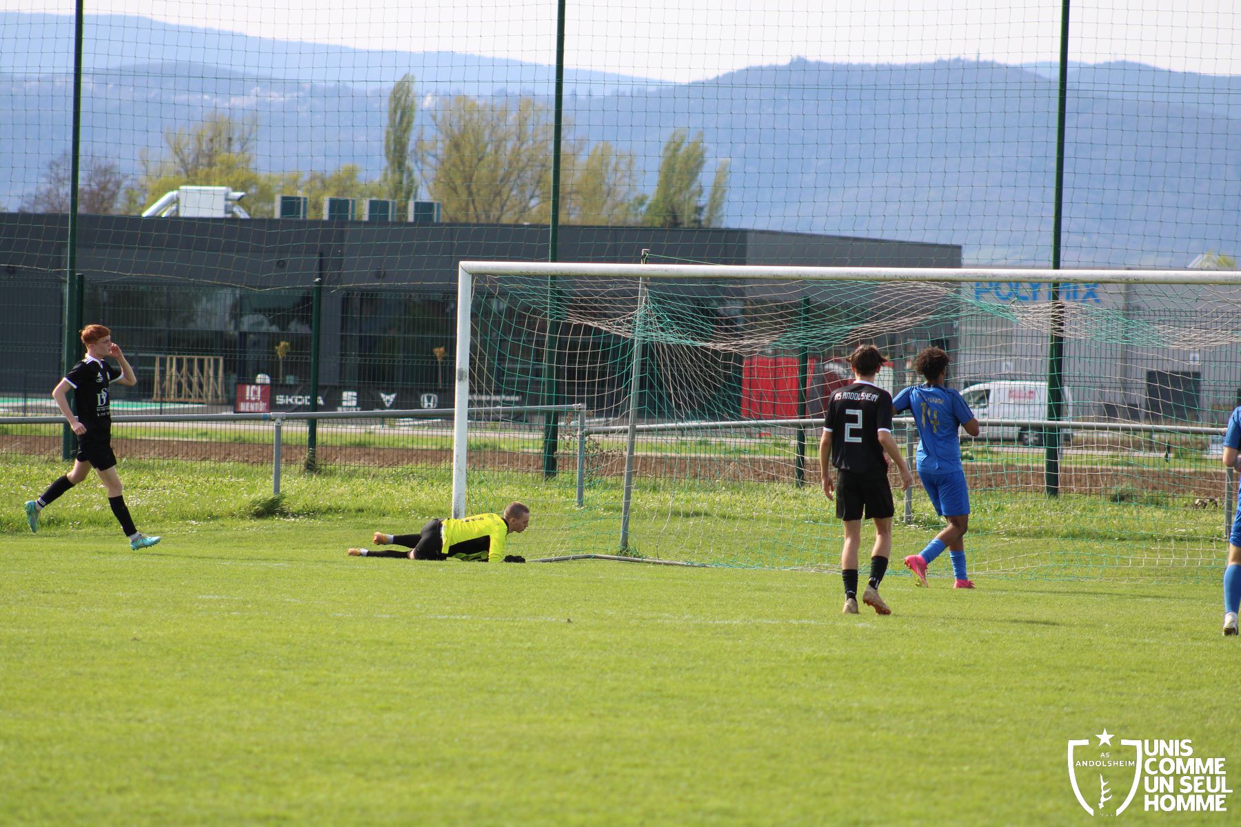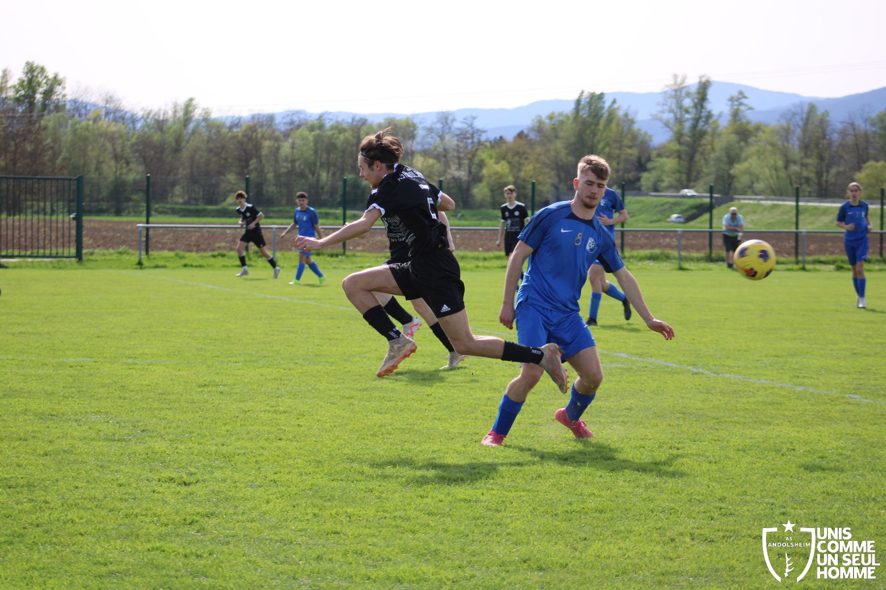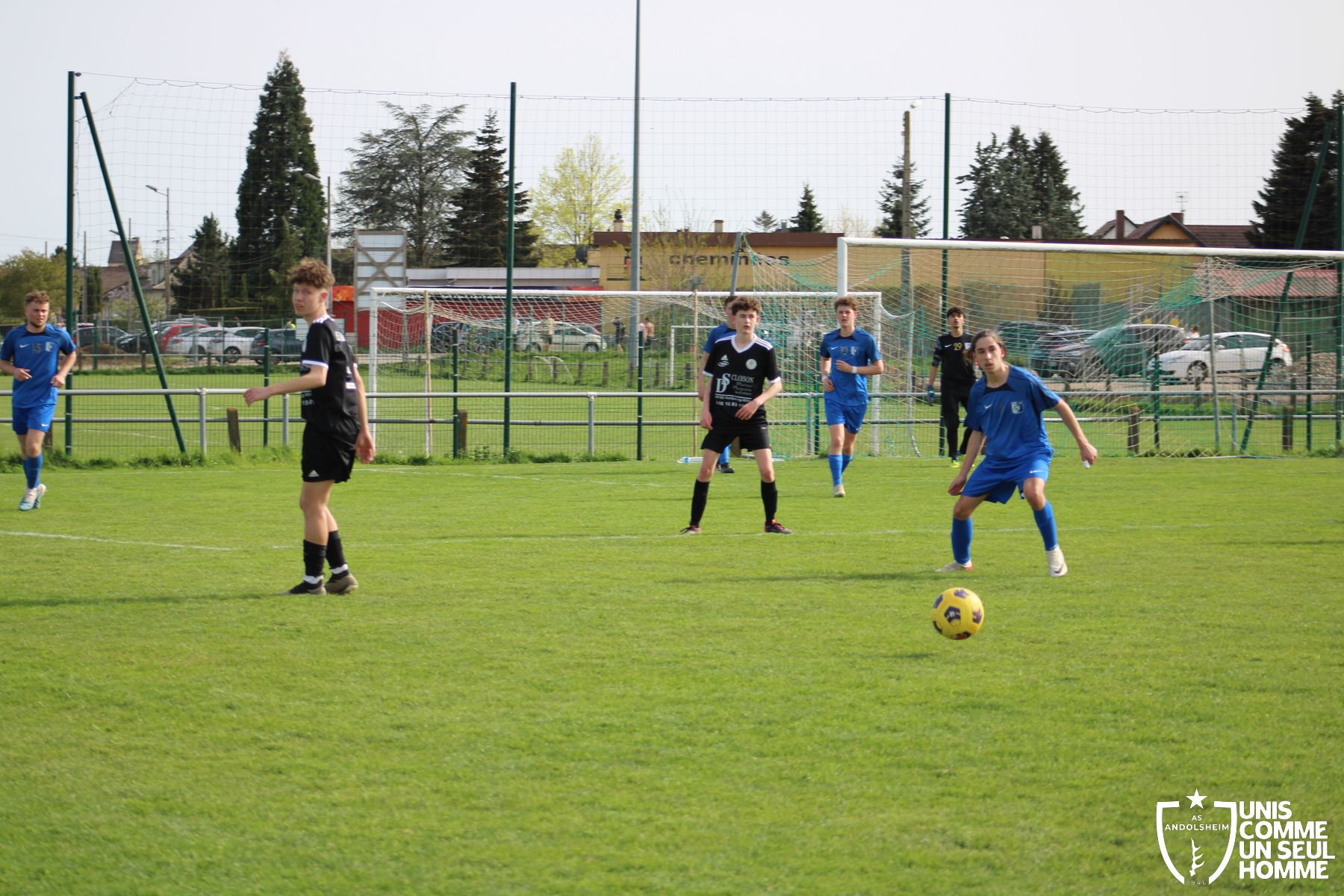 Nos verts se battent avec énergie, mais le jeu est trop désorganisé. Village-Neuf pousse avec leur foot un peu physique mais pas brutal. Mais c'est Andolsheim qui égalise suite à une perte de balle de nos adversaires au milieu de terrain. Kenan R. en profite pour placer une belle frappe croisée des 20 m.