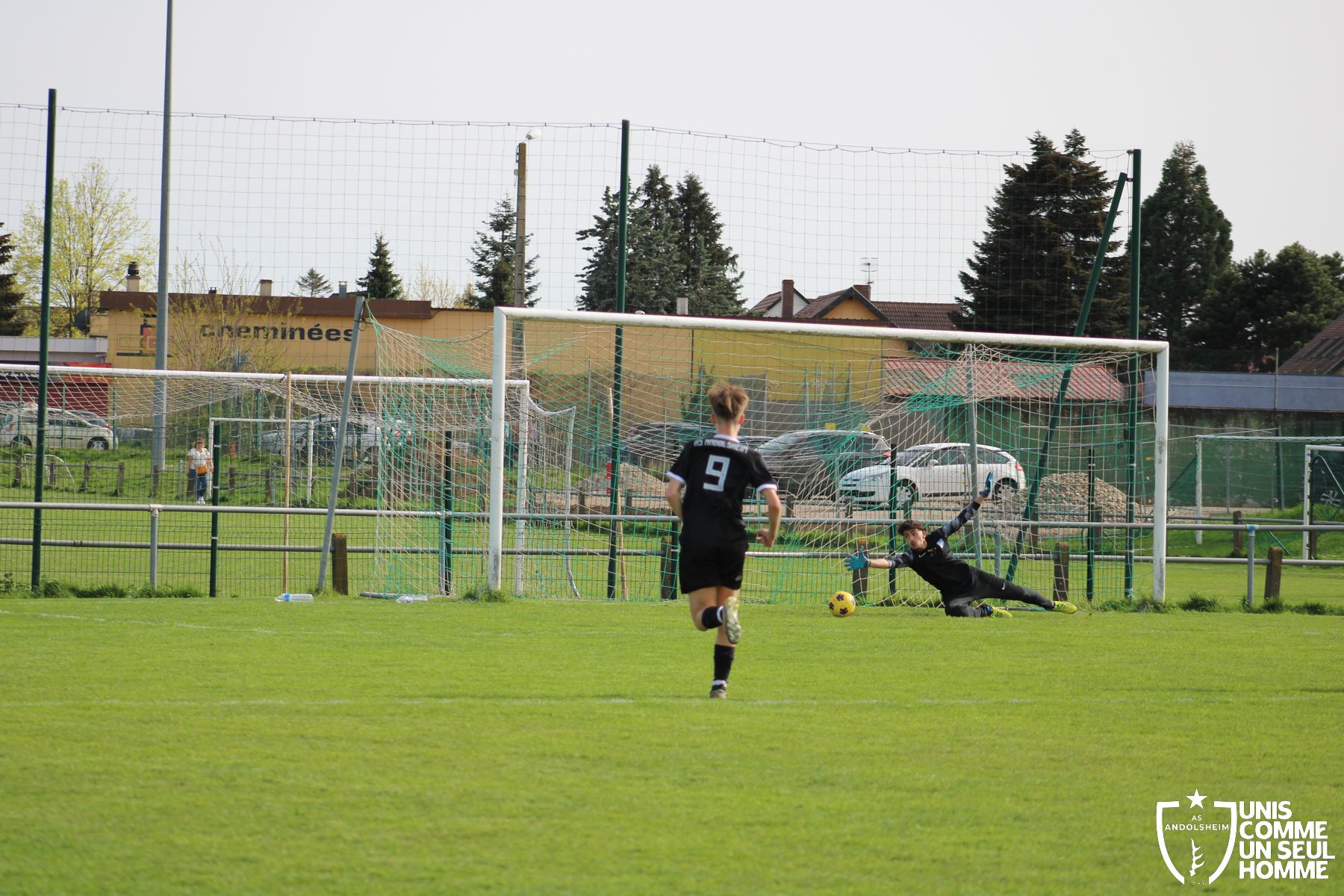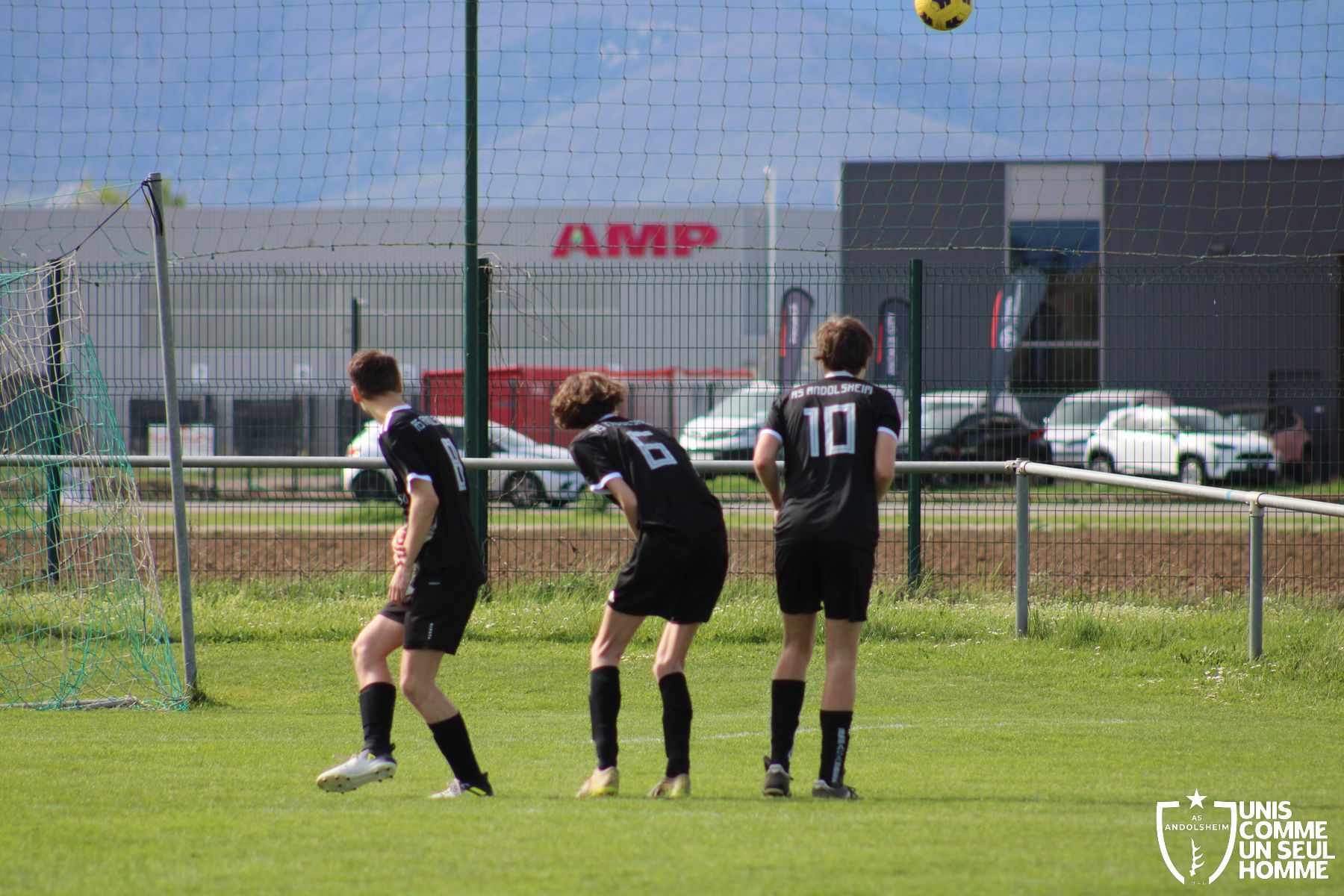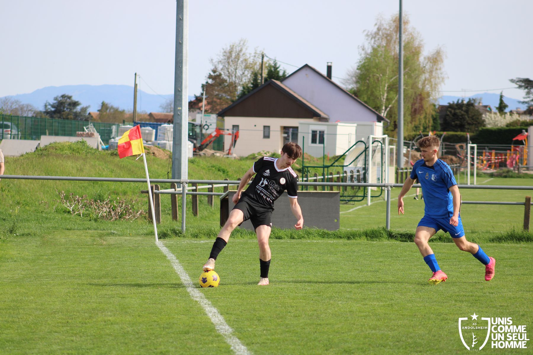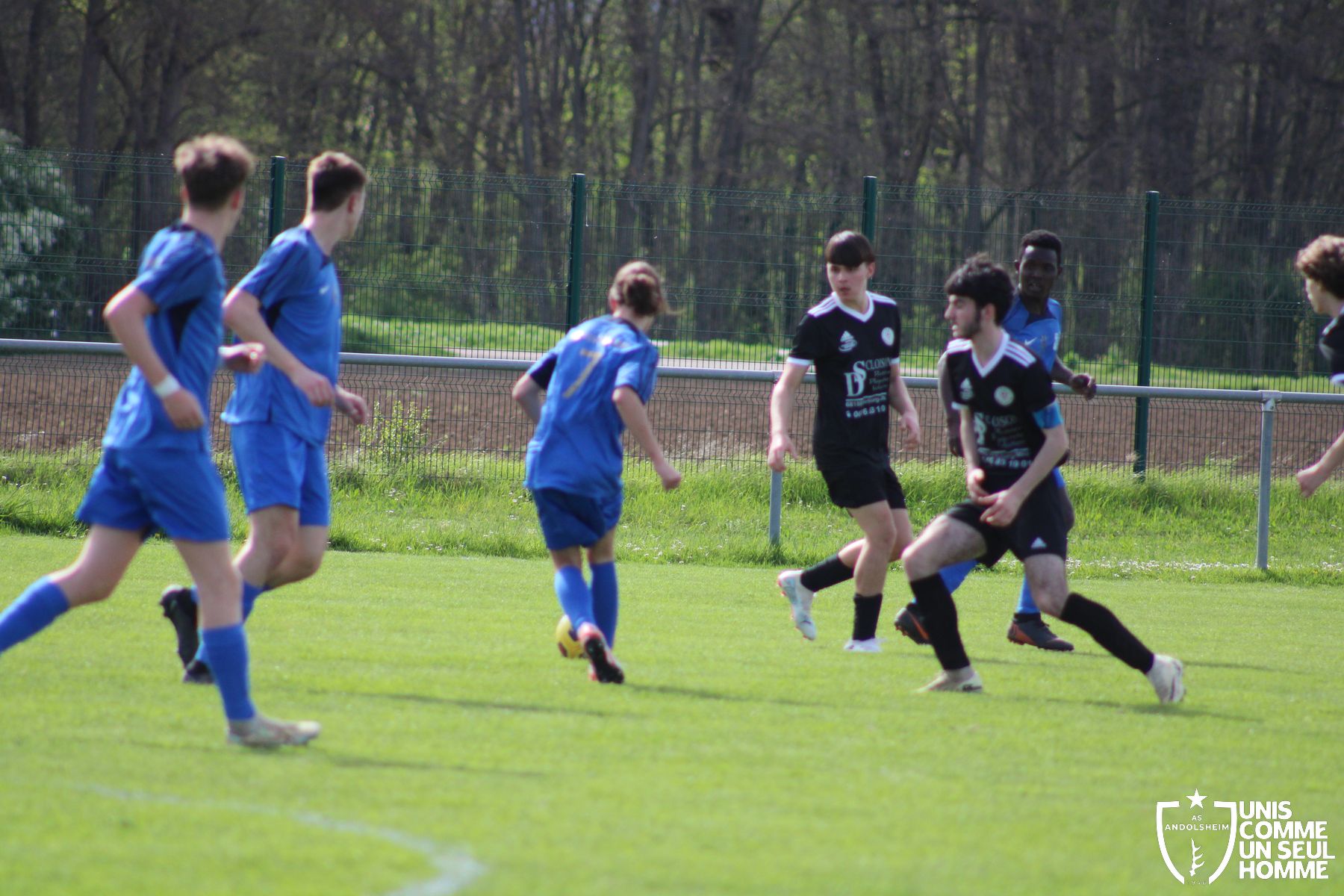 Nos verts se battent avec énergie, mais le jeu est trop désorganisé. Village-Neuf pousse avec leur foot un peu physique mais pas brutal. Mais c'est Andolsheim qui égalise suite à une perte de balle de nos adversaires au milieu de terrain. Kenan R. en profite pour placer une belle frappe croisée des 20 m.