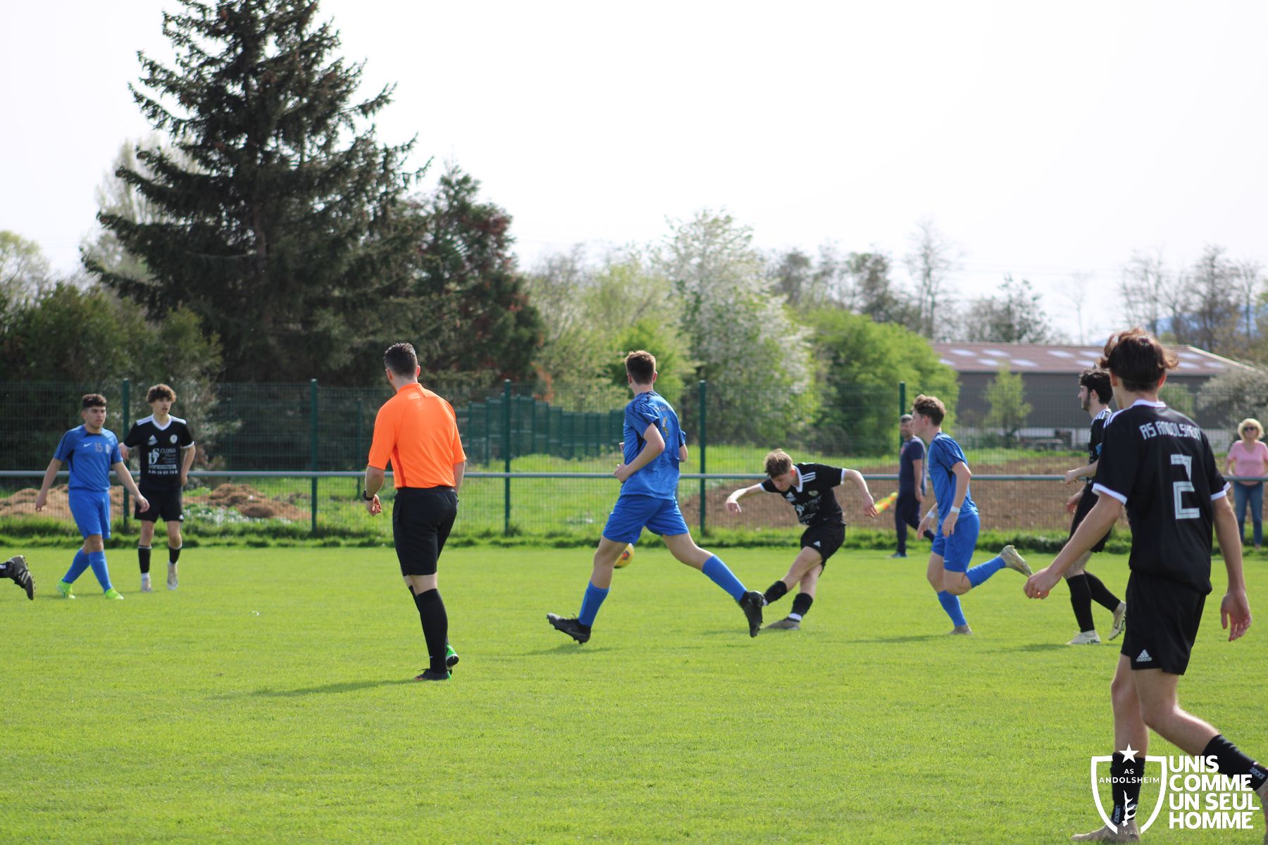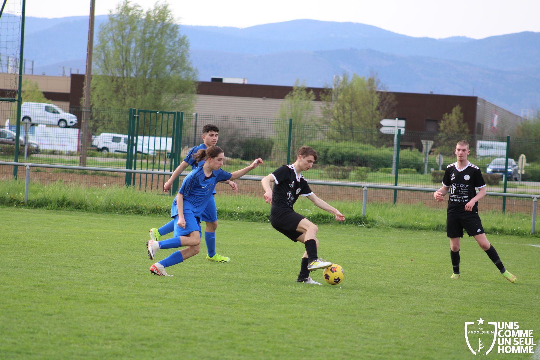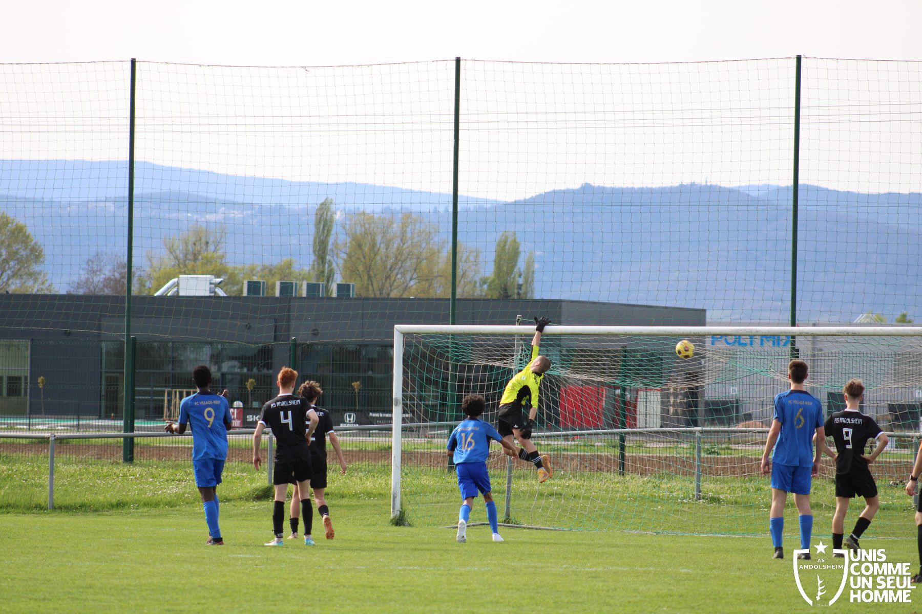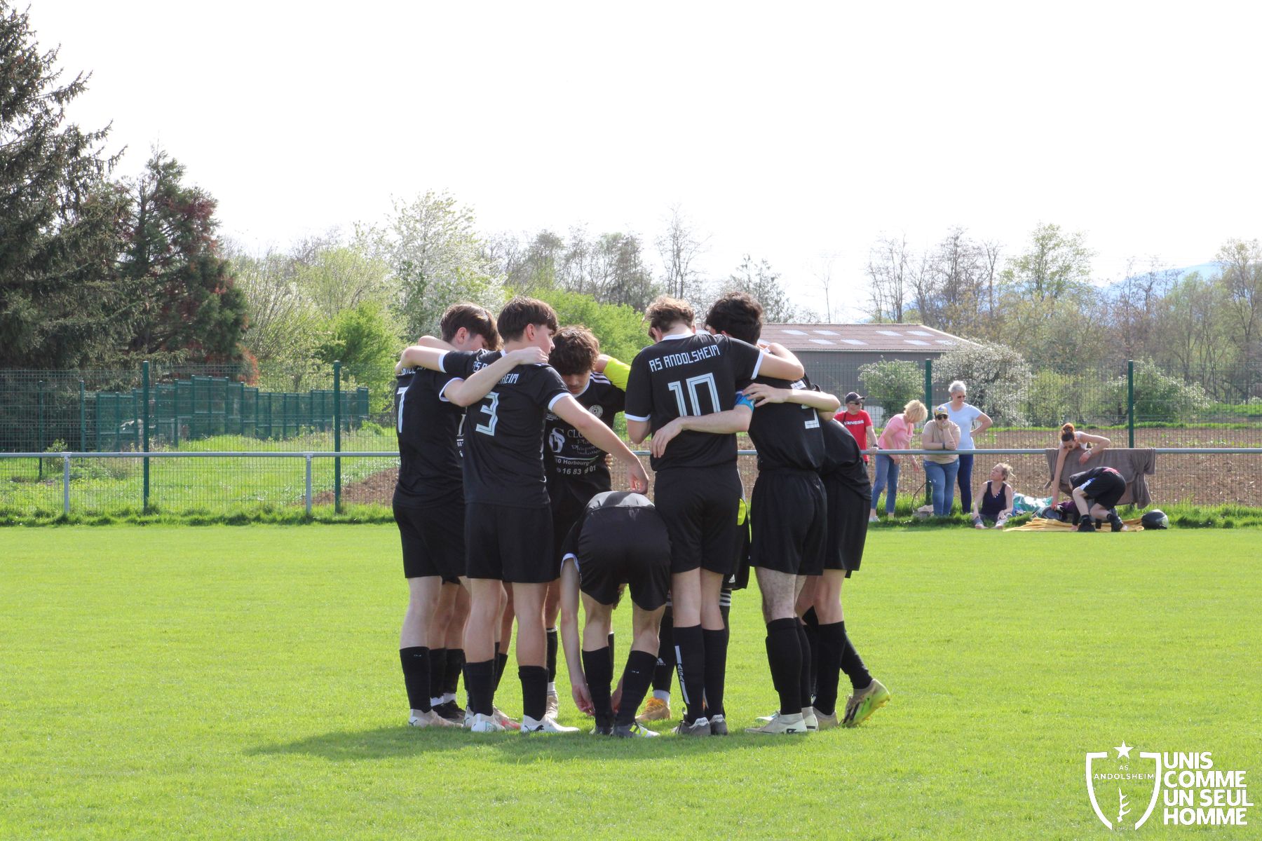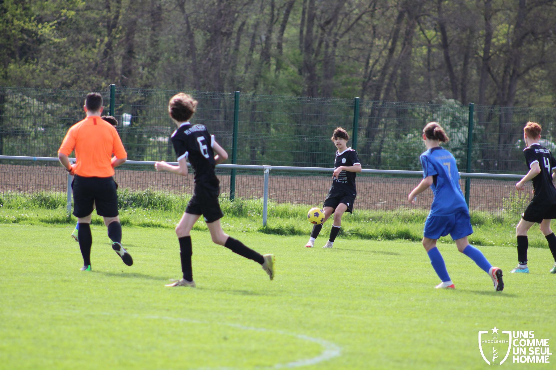 Nos verts se battent avec énergie, mais le jeu est trop désorganisé. Village-Neuf pousse avec leur foot un peu physique mais pas brutal. Mais c'est Andolsheim qui égalise suite à une perte de balle de nos adversaires au milieu de terrain. Kenan R. en profite pour placer une belle frappe croisée des 20 m.