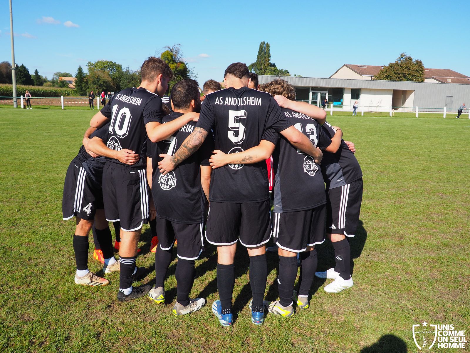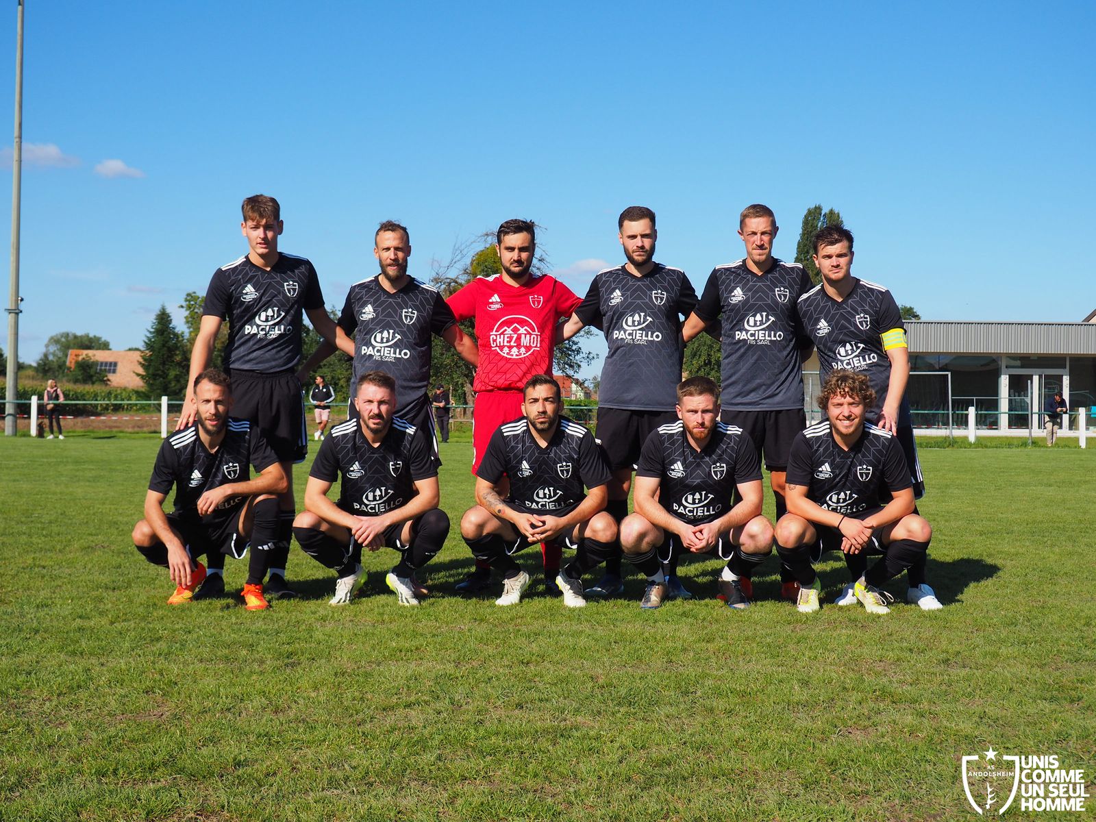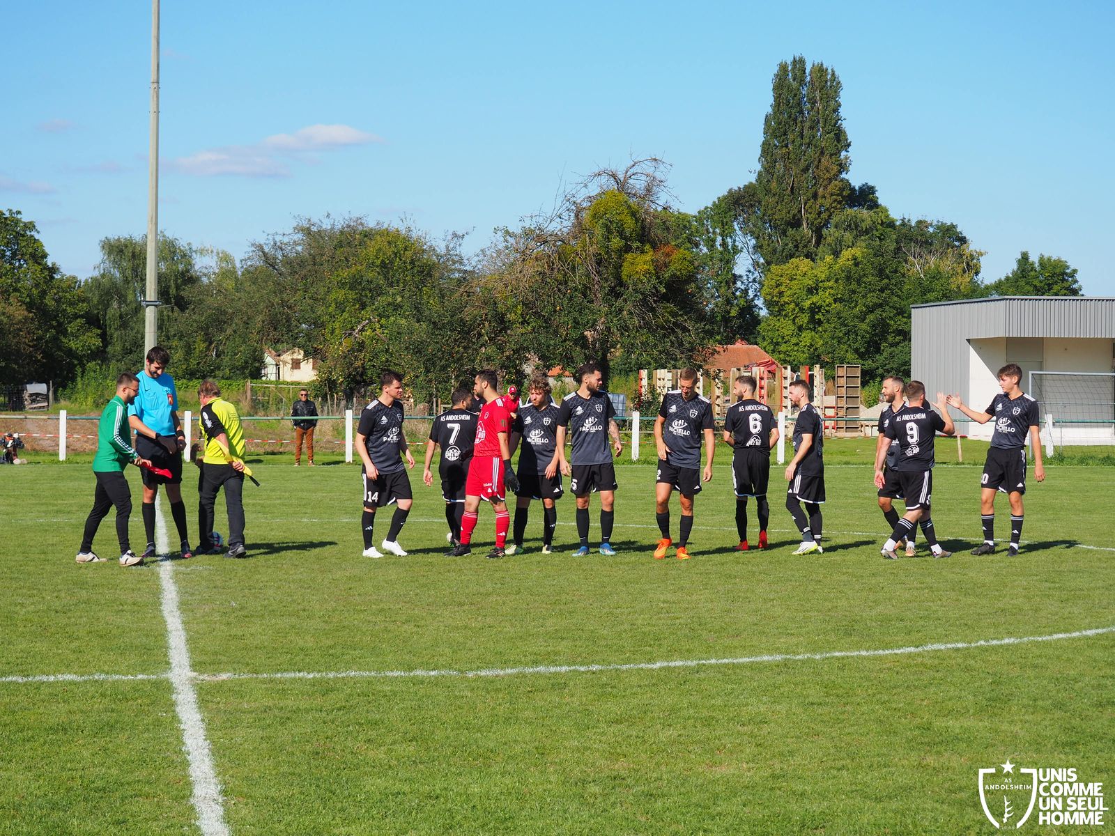 En ce dimanche frais, mais ensoleillé, notre équipe fanion visite le Football réuni JEBSHEIM MUNTZENHEIM pour le second tour de la coupe d’Alsace. Damien remplace Vince dans les buts, Serge est remplacé par Émilien au drapeau de touche, le soleil du Ried remplace la pluie de Wintzenheim. On note également que c’est le premier match officiel du jeune Kaïs en équipe seniors une , bienvenue à lui !