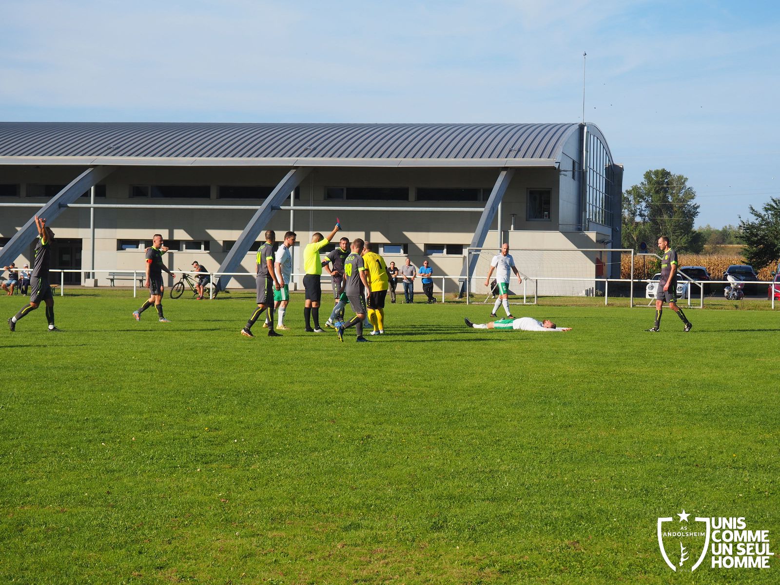 Seconde période. Le FCVO réagit en marquant trois but entre la 51e et la 69e minute. Alerte ! Le score est passé à 3 – 4 en quelques minutes ! … On fait re-rentrer Mika de toute urgence. Quand il y a le feu, on appelle le pompier en chef ! Mika et toute l’équipe parviennent enfin à éteindre l’incendie : plus de buts ! En revanche, l’incendie des cartons, et de toutes les couleurs, s’il vous plaît, est inextinguible. Les locaux ne finissent donc pas à onze, mais ils ont effectué une belle remontada et nous leur souhaitons une belle continuation en D3. Et pour l’ASA : qualification pour le 4e tour de la coupe d’Alsace, merci et à bientôt !