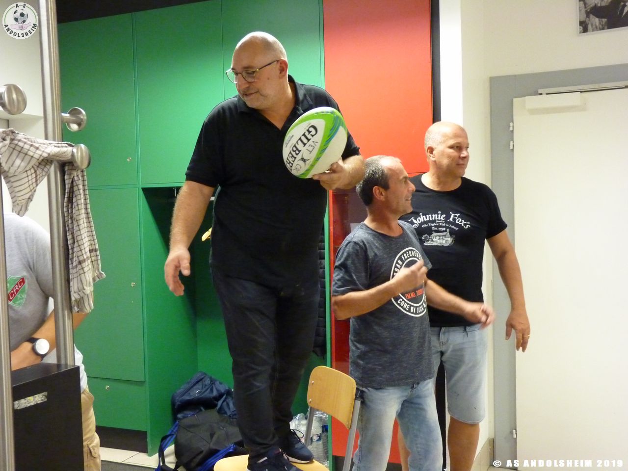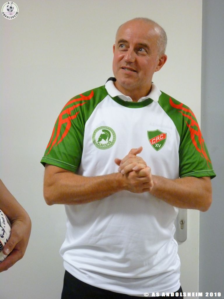 C'était autour de Hugues de prendre la parole et remercier les différents acteurs du CRC, avec Spacky ils ont remis des écharpes de l'ASA, il y eu un échange de ballon entre le rond et l'ovale avec les dédicaces des joueurs… Bravo à tous!