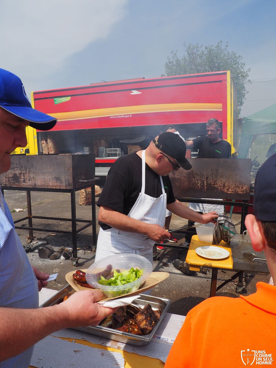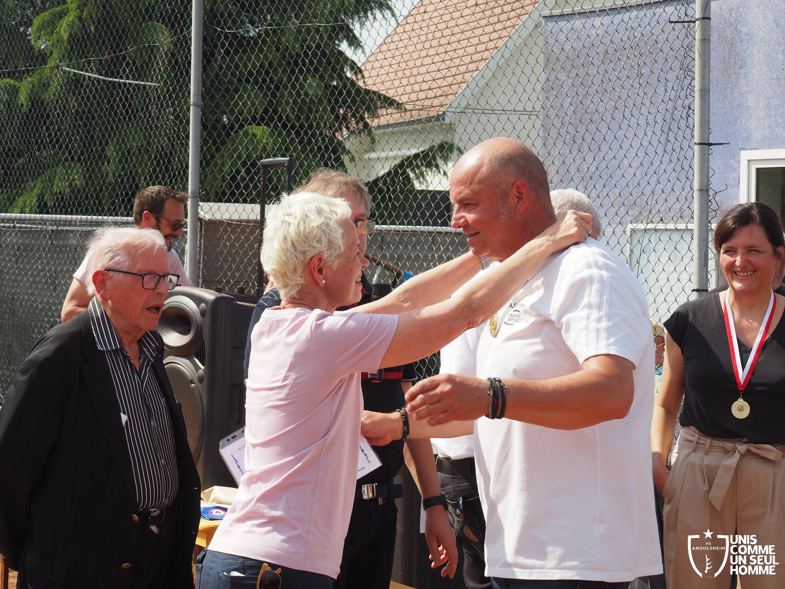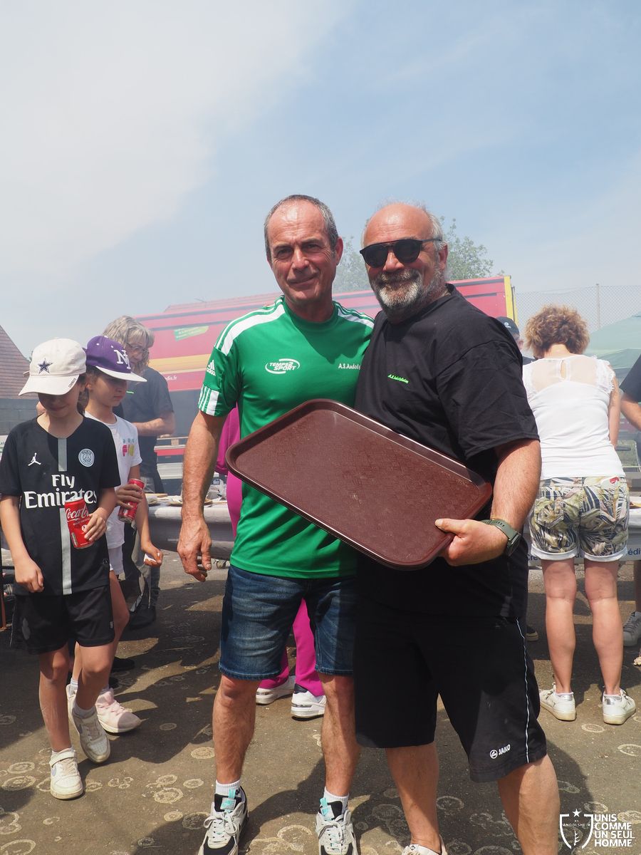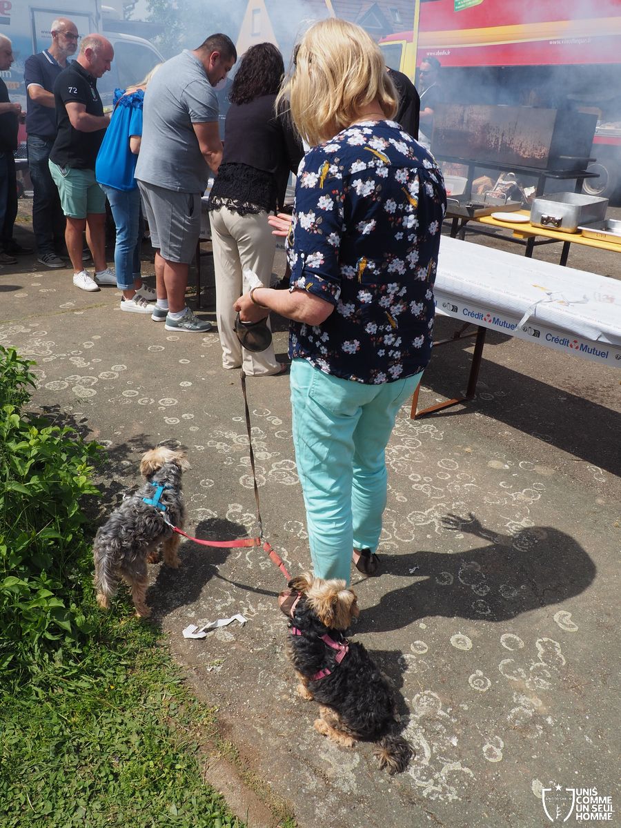 L’ambiance est à son comble dès le début du repas, sous un soleil radieux, mais le point d’orgue est encore à venir… La fédération française des médaillés de la jeunesse, des sports, et de l’engagement associatif, la FFMJSEA, nous honore de sa présence. Son président Rolland Sutter va en effet décorer de la médaille du bénévolat 3 courageux bénévoles, et notamment Christelle et notre président Franz. Notre chère Christelle, aussi étonnée qu'émue, mérite bien cette reconnaissance, comme notre président, et tous deux ont pu parader, médaille au cou, dans une ambiance digne des Jeux olympiques. Bravo à Christel et Francis !