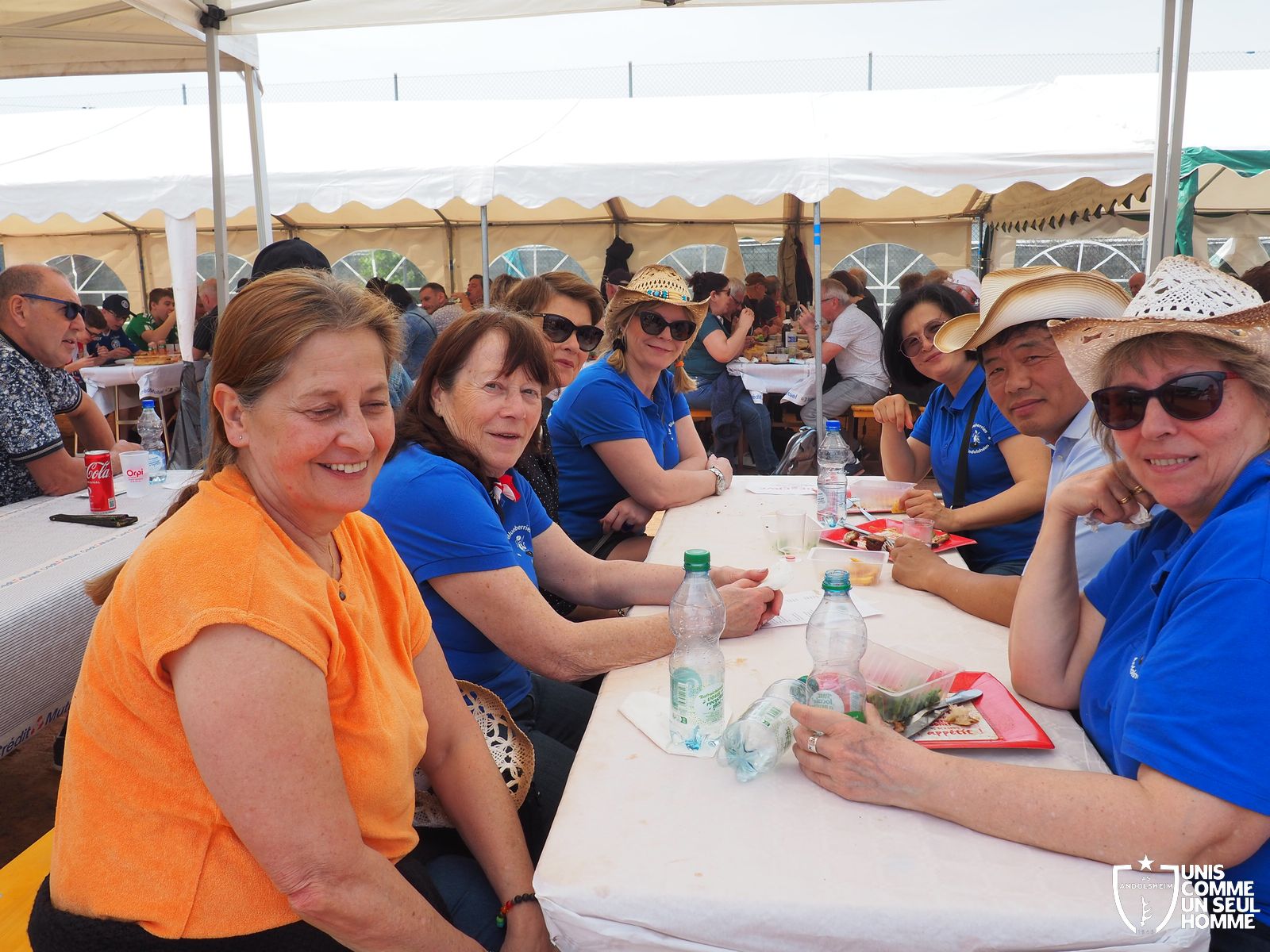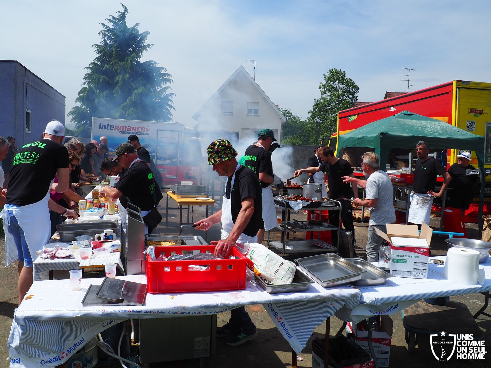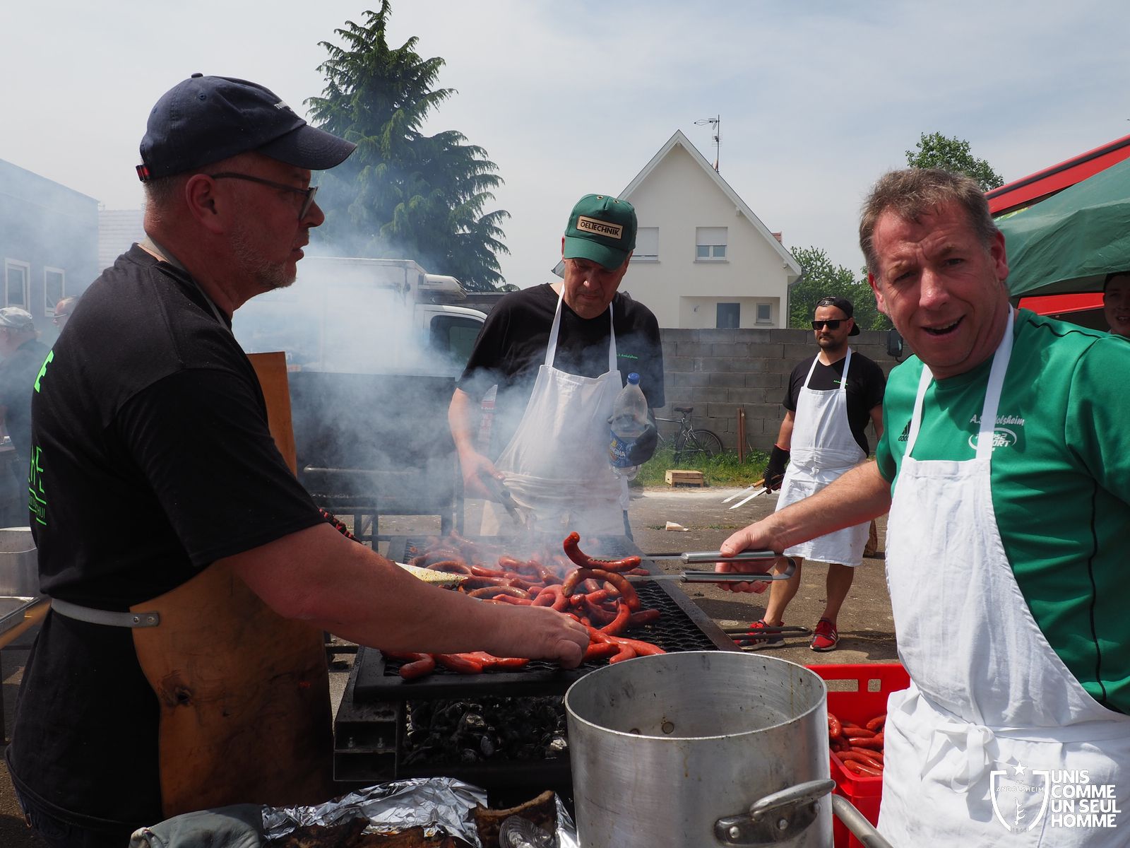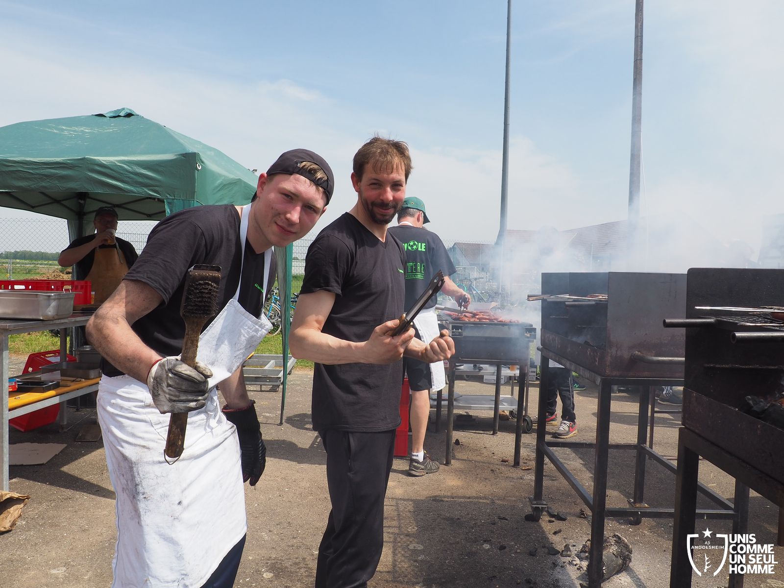 En ce mercredi 1er mai l’ASSOCIATION SPORTIVE d’ ANDOLSHEIM organise au stade de l’Ill sa traditionnelle Garden Grill Party. Tous les bénévoles de l’ASA sont mobilisés pour proposer côtelettes, ribs, saucisses blanches, merguez, frites, salades, sandwiches, desserts et boissons diverses, voire carrément alsaciennes. Le public est nombreux, joyeux, et satisfait. On note la présence de l’intégralité du Conseil municipal, autour du maire Christian Rebert, et la participation chaleureuse du groupe de danse américaine les "BLUEBERRIES". Cette sympathique formation du village nous avait déjà régalé avec son entrainante chorégraphie western et country lors de manifestations précédentes.