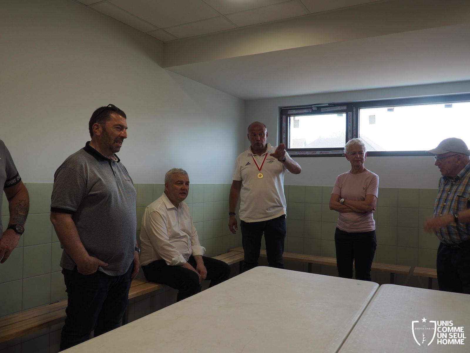Ce n’est pas fini : Brigitte KLINKERT, Eric STRAUMANN, Christian REBERT et d’autres officiels ont pu visiter le complexe sportif en cours d’achèvement, guidés par notre Président, pour constater notamment le parfait état de fonctionnement des douches automatiques… En effet, un officiel, dont nous tairons le nom, incrédule, s’y est aventuré…Et a manqué de peu la douche automatique !