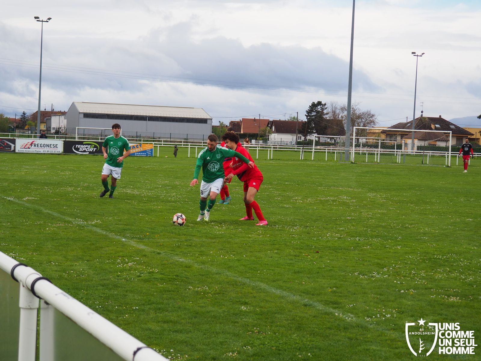 Début de rencontre. Domination rouge. Vince réalise un arrêt réflexe de dingue à la 14e. Et il arrêtera un penalty à la 40e : encore un grand match de notre portier ! … Mais les locaux, qui jouent le maintien, sont survoltés. Ils ont même fait appel à des renforts U18 qui évoluent en R2. Certains formés à Ando d’ailleurs… C’est de bonne guerre. Et ça paye : les croisés ouvrent le score à la 23e minute. Chaque point est important pour l’ASA et Gilles Laganne le sait : il motive les verts qui vont ressusciter dans ce match… Quoi de plus normal en ce lundi de Pâques et sur le stade de la Sainte-Croix ! Nos garçons vont marquer 4 fois entre la 31e et la 74e minute. Joshua Paret, auteur d’un triplé il y a 2 semaines, marque un but et inspire Maxime Pasquier… qui en marque 3 et ce n'est pas un poison d’avril ! …. Et on peut dire que l’ASA a fait son MAX !
