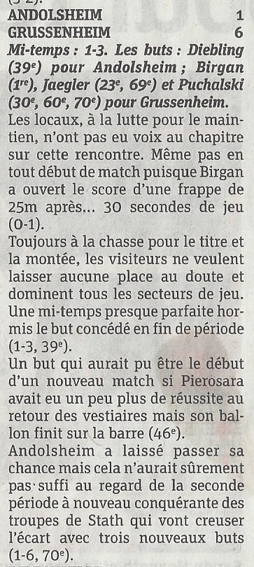 Bref Grussenheim par sa qualité a indéniablement montrer l'étoffe de la meilleur équipe du groupe ... L'équation pour les verts quand à eux est simple, pour éviter d'être la pire équipes du groupe : 2 victoires s'imposent pour conclure et éviter la descente.