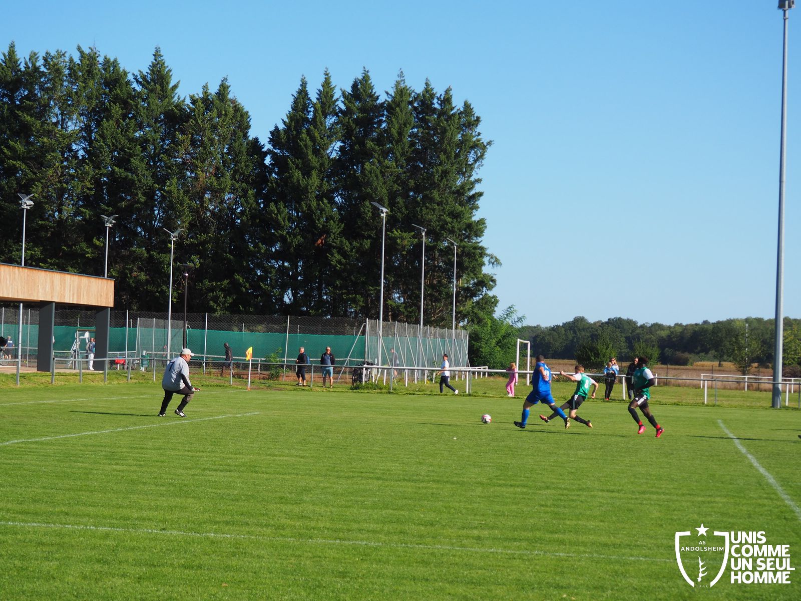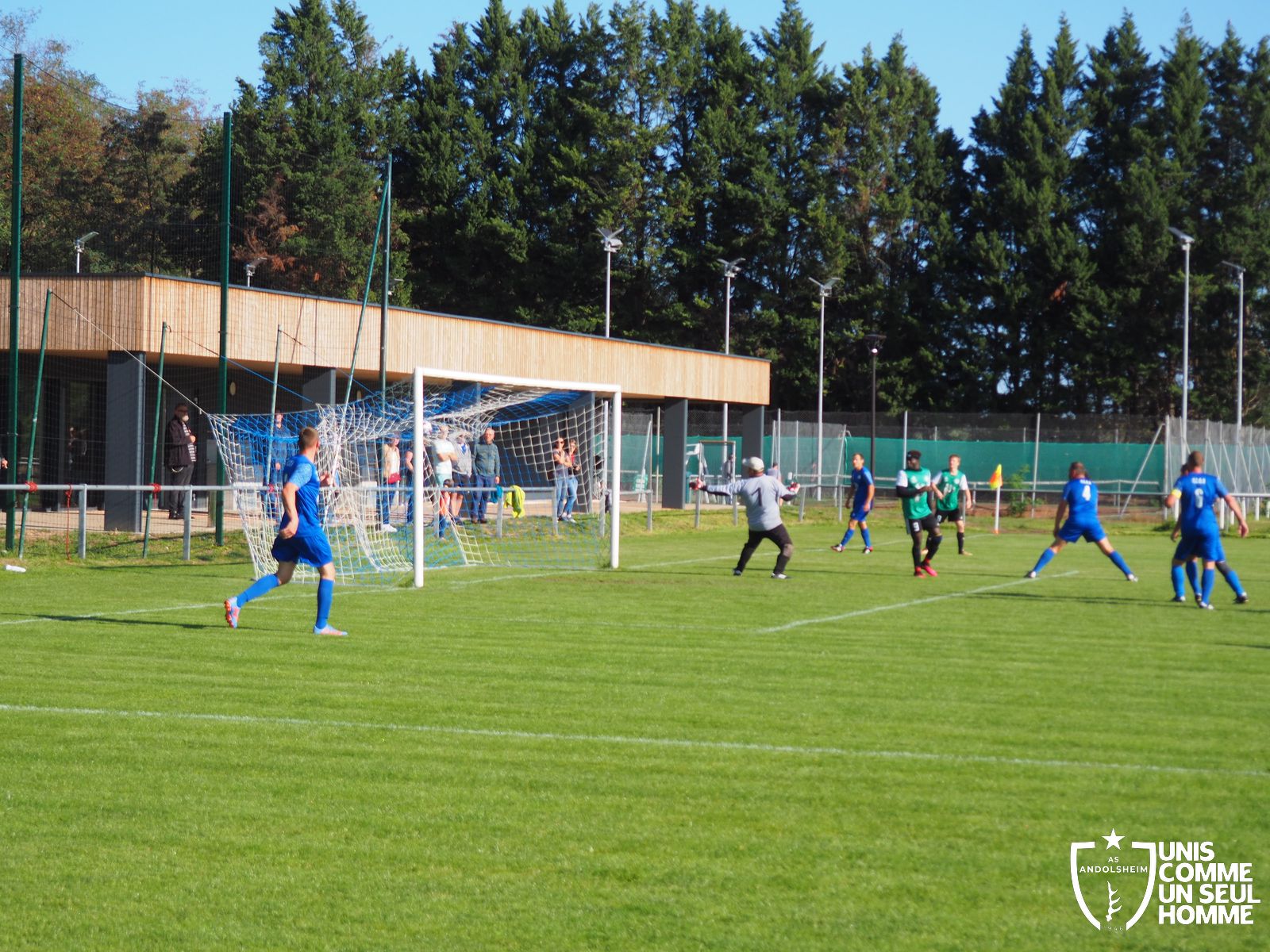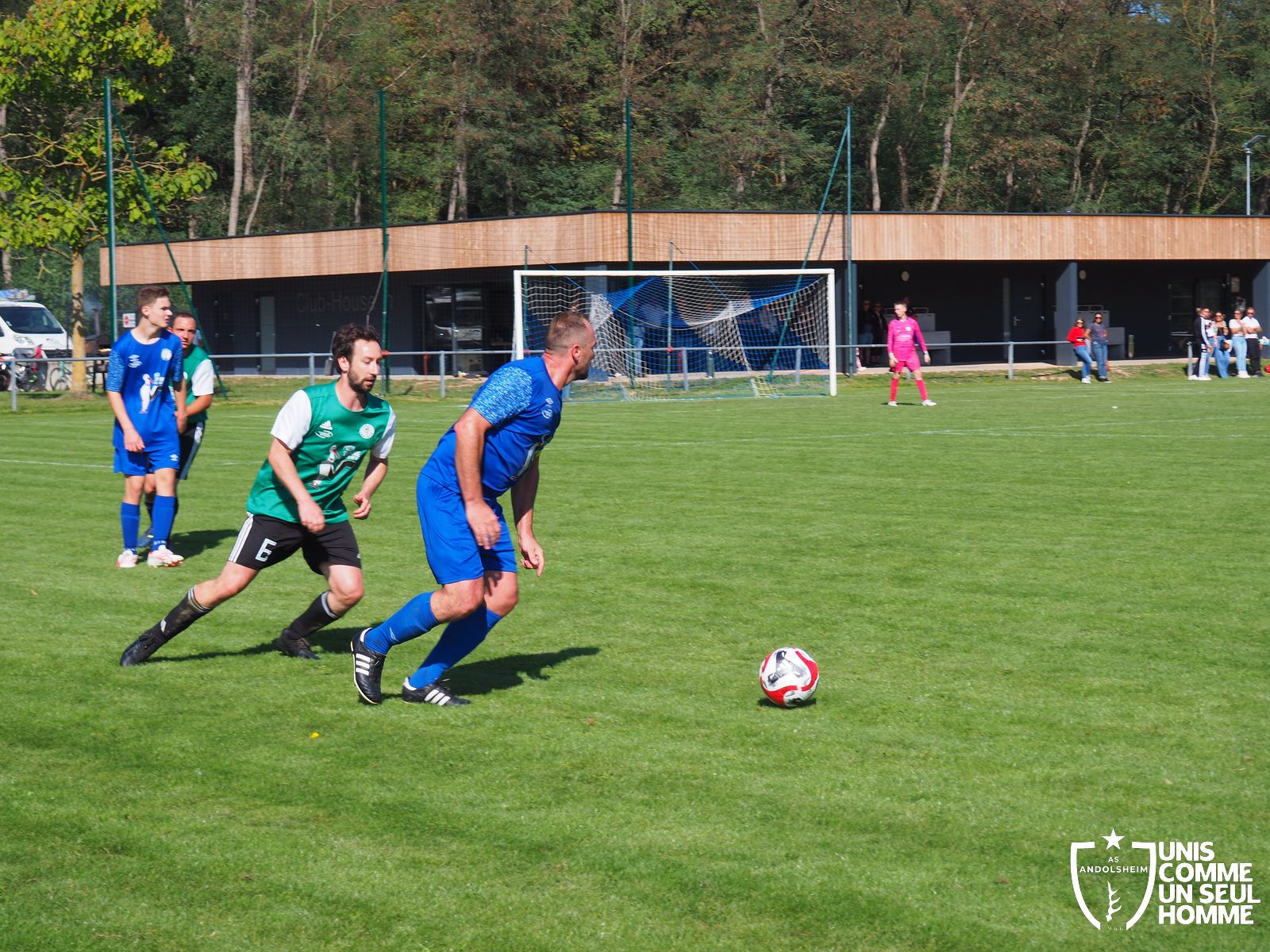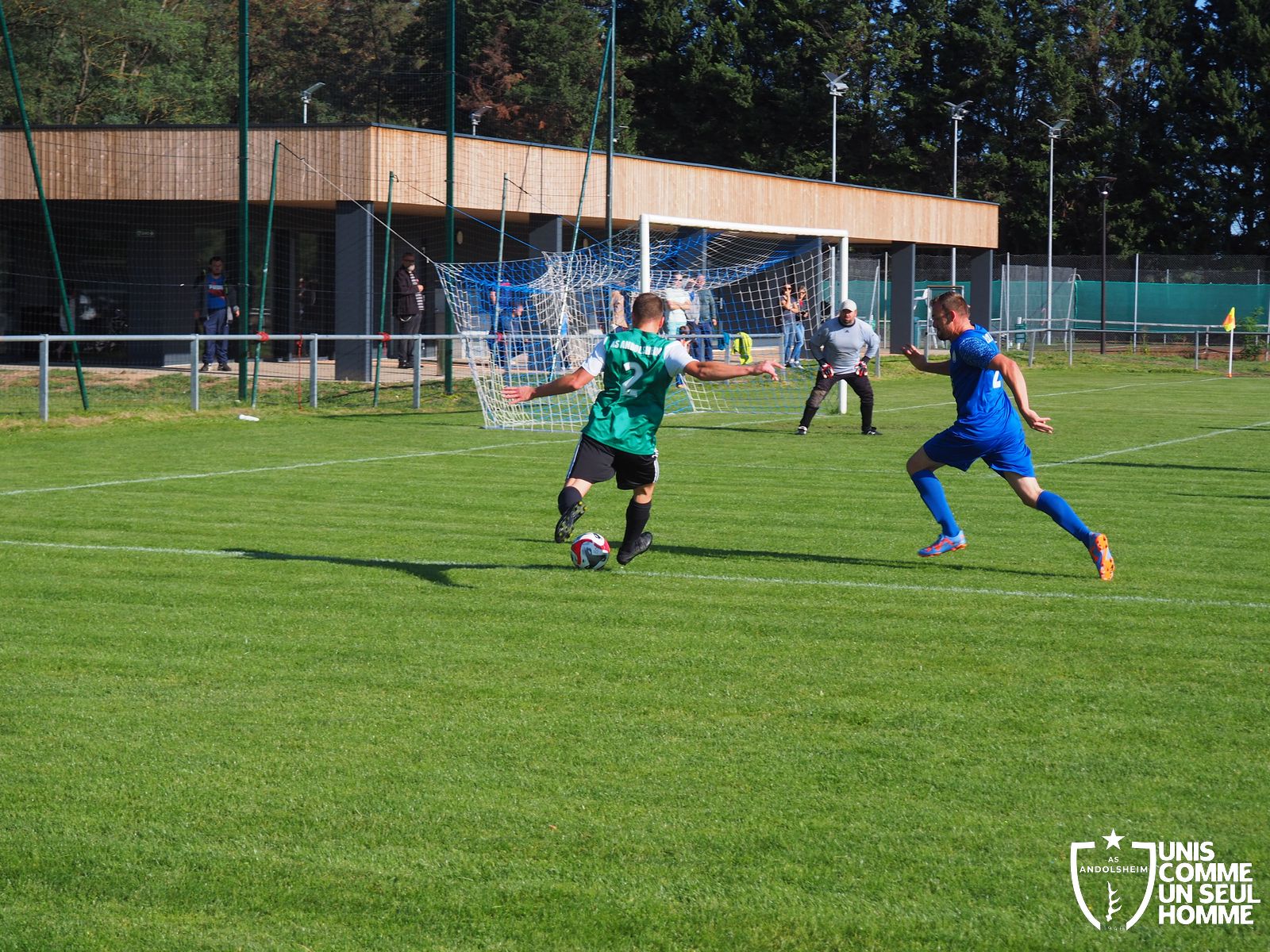 À la vingtième, Luc remet ça : 0 à 2 ! Dix minutes plus tard, le FCOH réduit le score à 1-2. Rien n’est acquis, messieurs ! Les 35 minutes suivantes voient une équipe locale plus précise, plus agressive, proche d’égaliser. Houssen, le retour ? Non… Les bleus ne concrétisent pas au tableau d’affichage… Au contraire des verts, qui tuent le match par Ewen à la 65e et Curtis à la 85e ! L’AS ANDOLSHEIM l’emporte 1 à 4 !