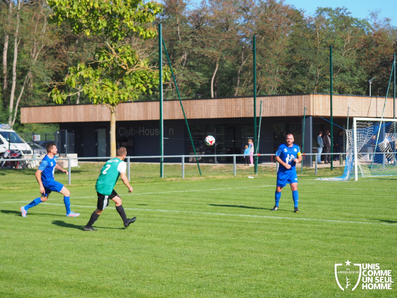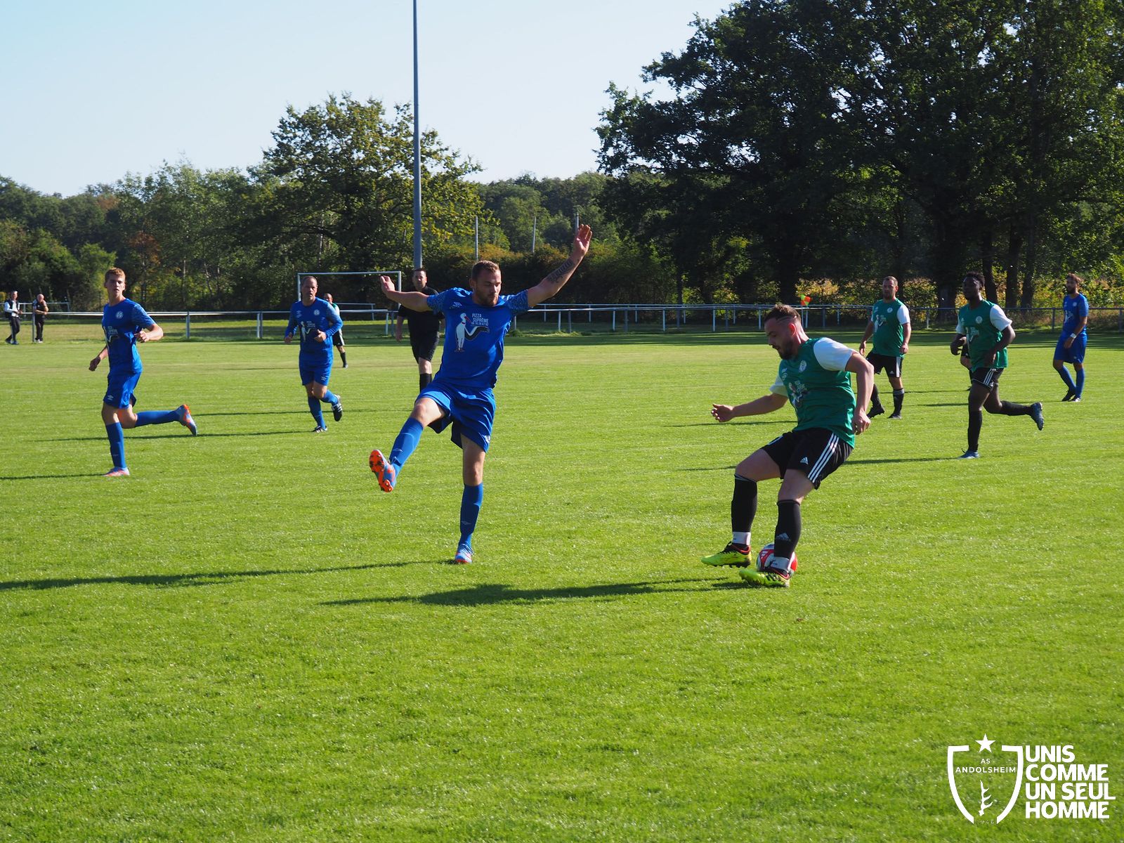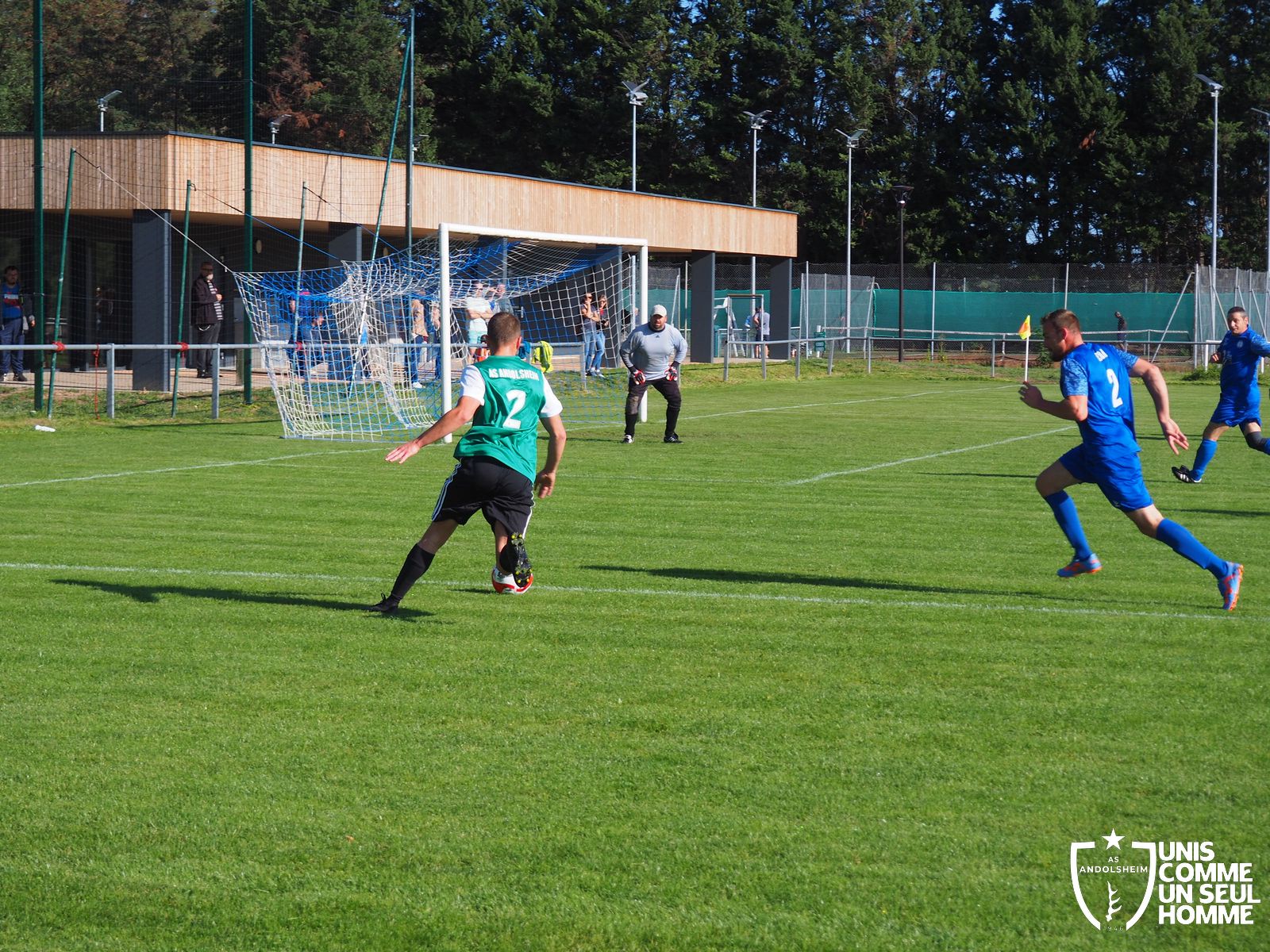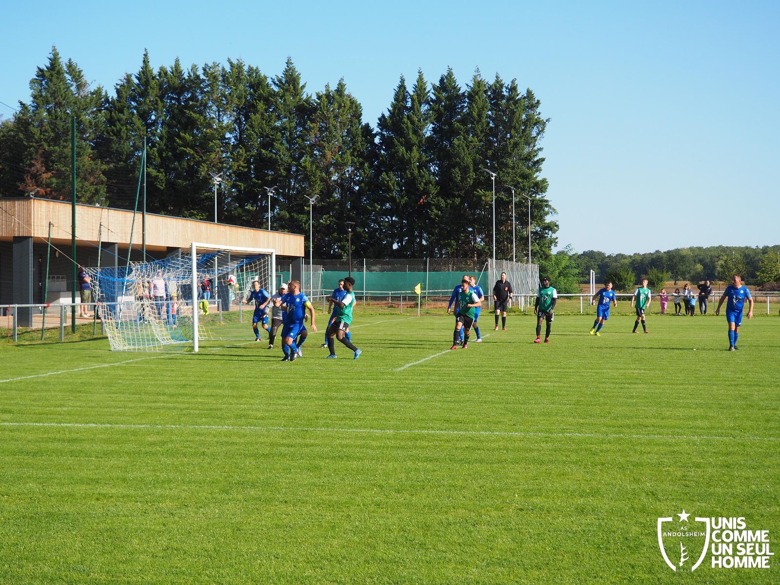 À la vingtième, Luc remet ça : 0 à 2 ! Dix minutes plus tard, le FCOH réduit le score à 1-2. Rien n’est acquis, messieurs ! Les 35 minutes suivantes voient une équipe locale plus précise, plus agressive, proche d’égaliser. Houssen, le retour ? Non… Les bleus ne concrétisent pas au tableau d’affichage… Au contraire des verts, qui tuent le match par Ewen à la 65e et Curtis à la 85e ! L’AS ANDOLSHEIM l’emporte 1 à 4 !
