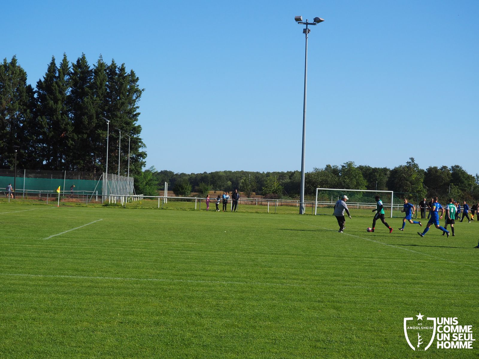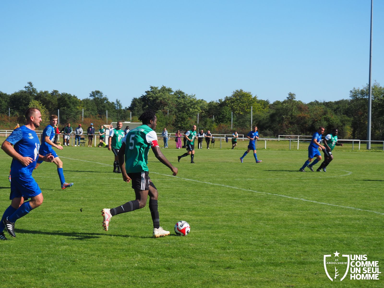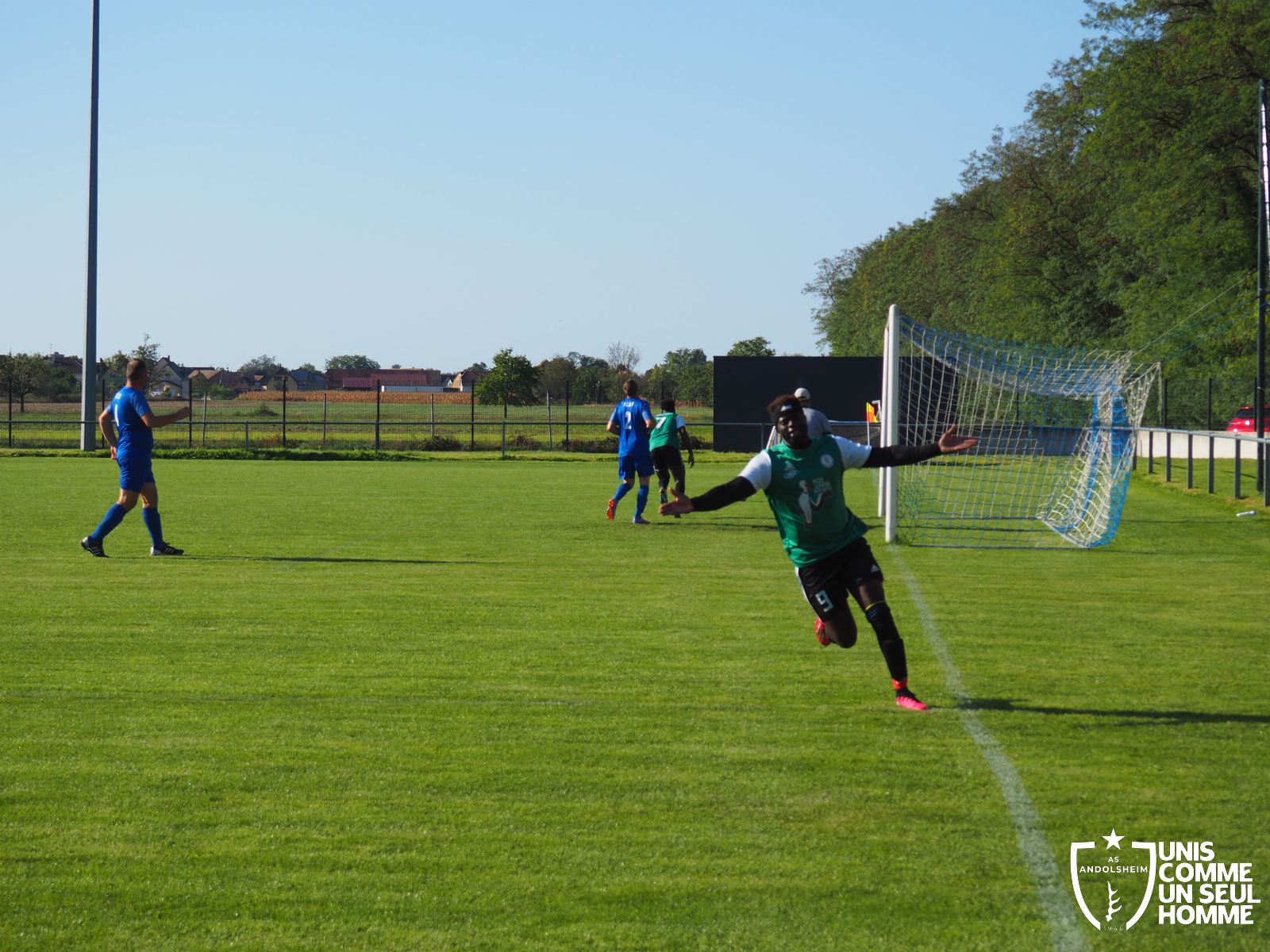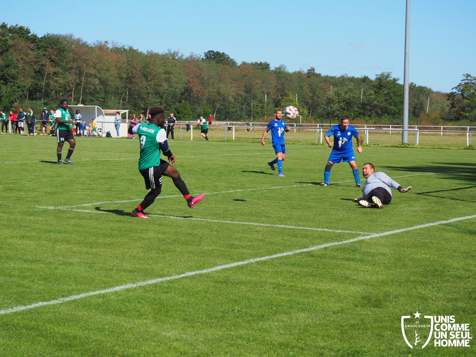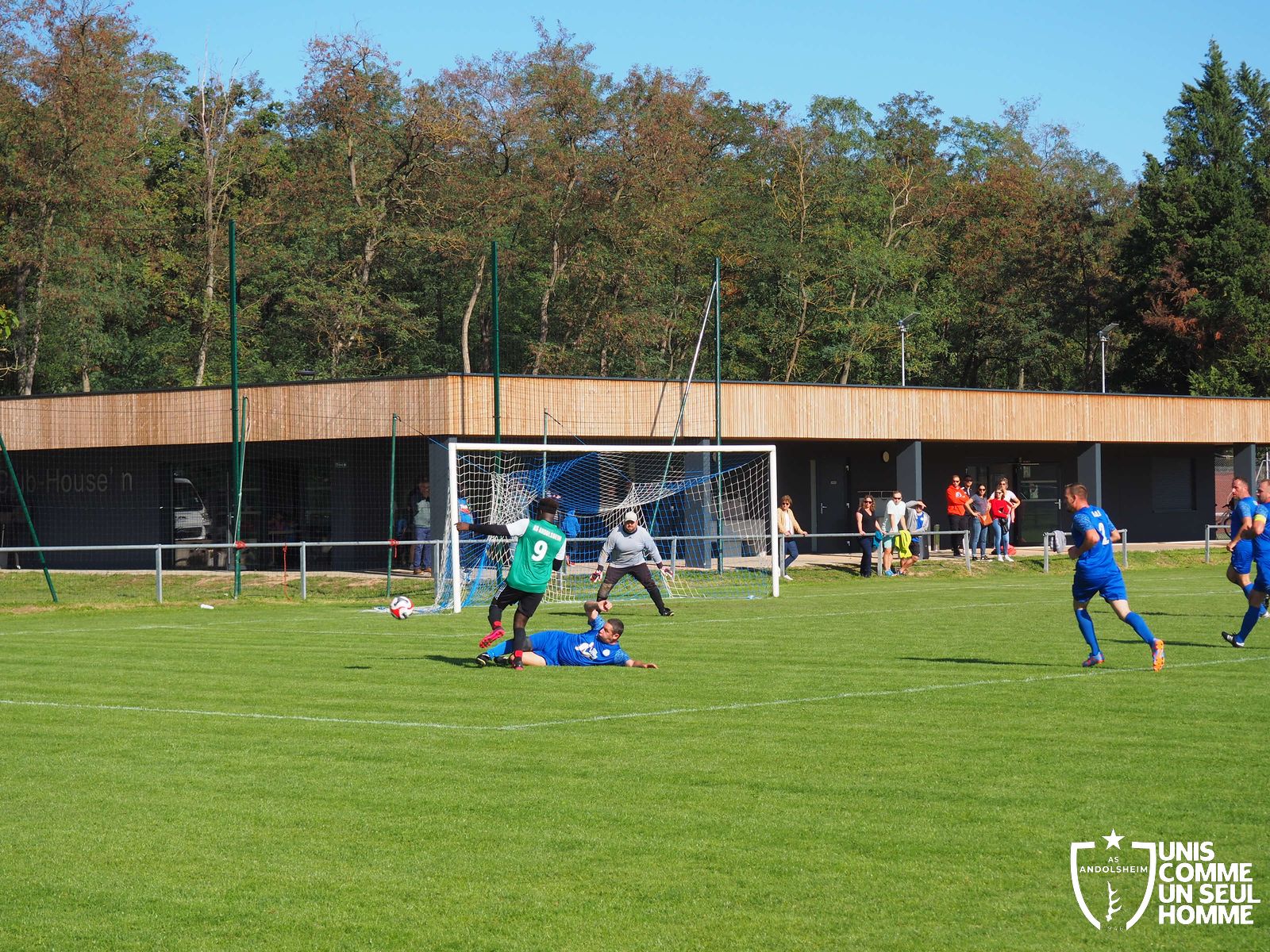 À la vingtième, Luc remet ça : 0 à 2 ! Dix minutes plus tard, le FCOH réduit le score à 1-2. Rien n’est acquis, messieurs ! Les 35 minutes suivantes voient une équipe locale plus précise, plus agressive, proche d’égaliser. Houssen, le retour ? Non… Les bleus ne concrétisent pas au tableau d’affichage… Au contraire des verts, qui tuent le match par Ewen à la 65e et Curtis à la 85e ! L’AS ANDOLSHEIM l’emporte 1 à 4 !