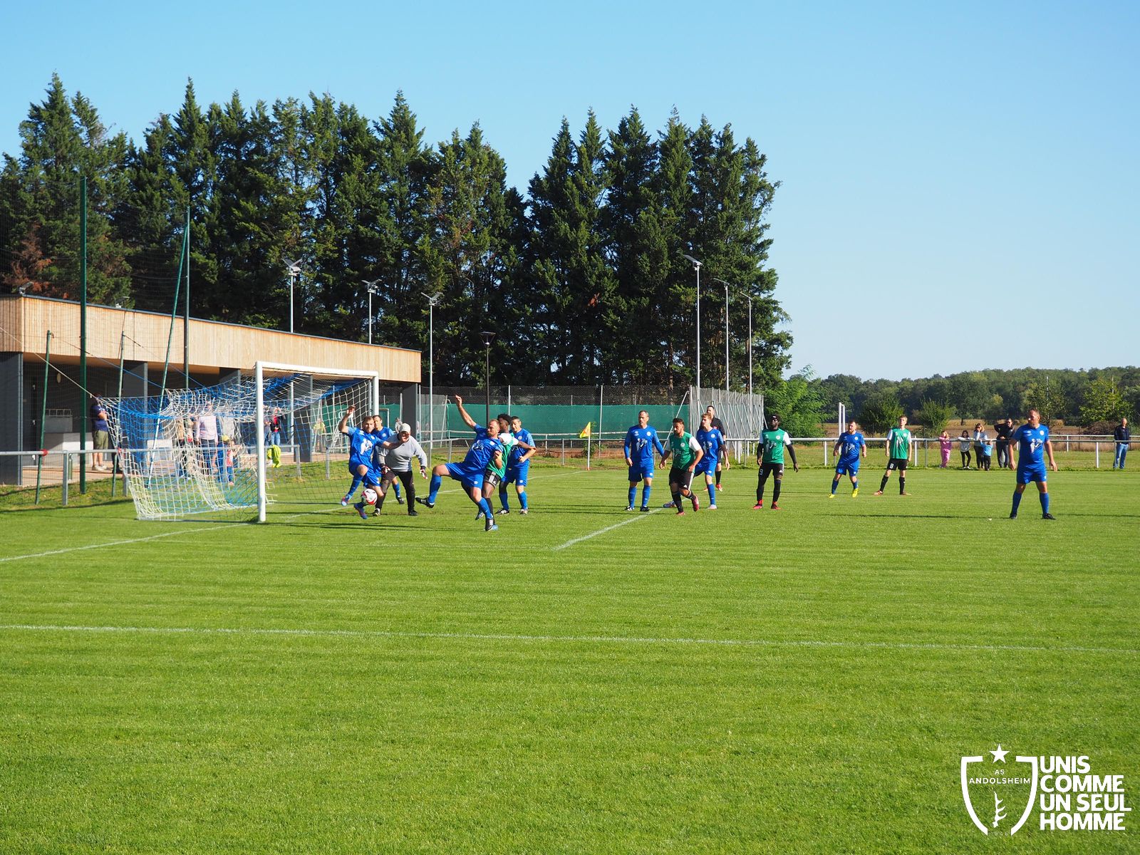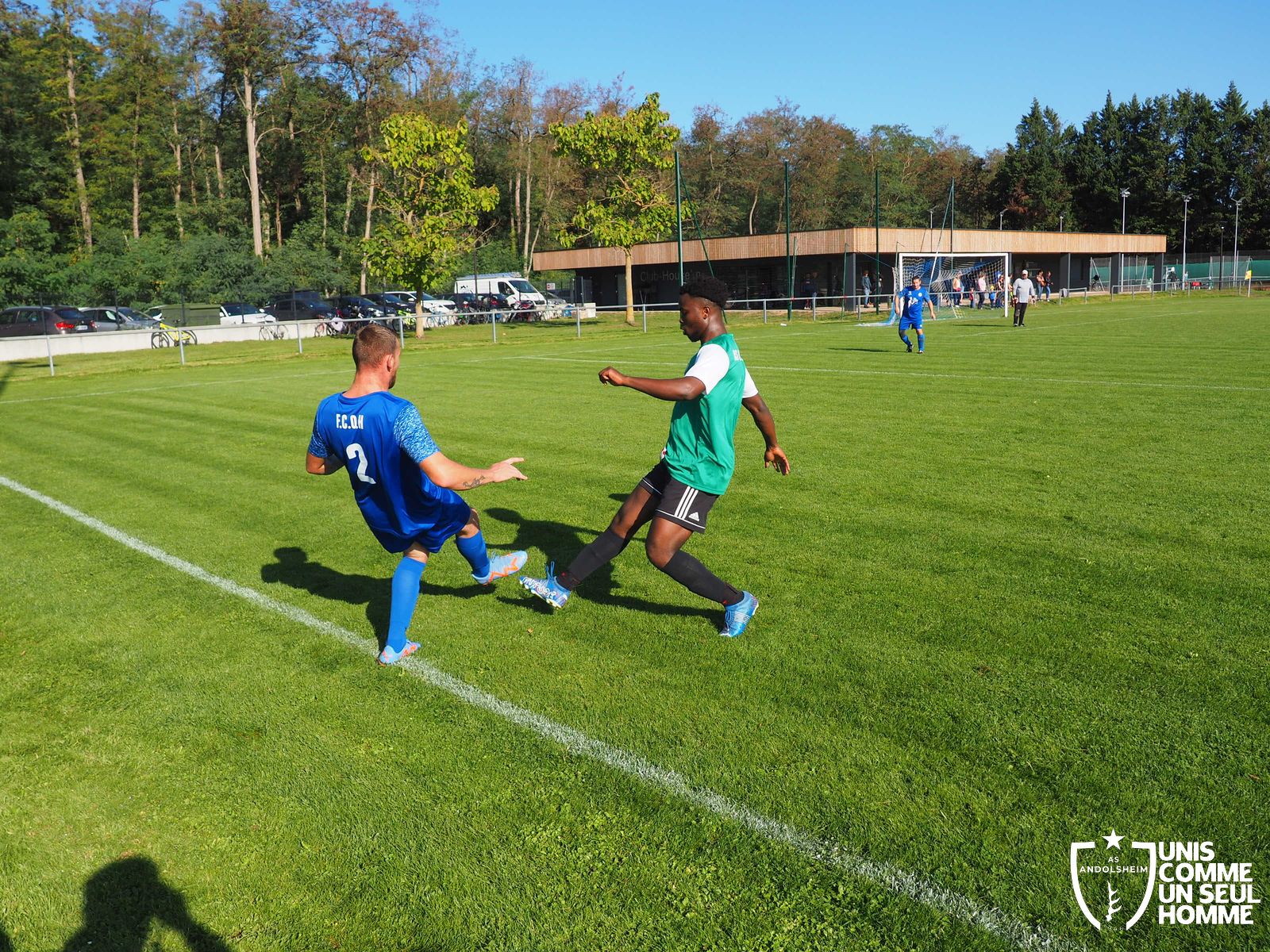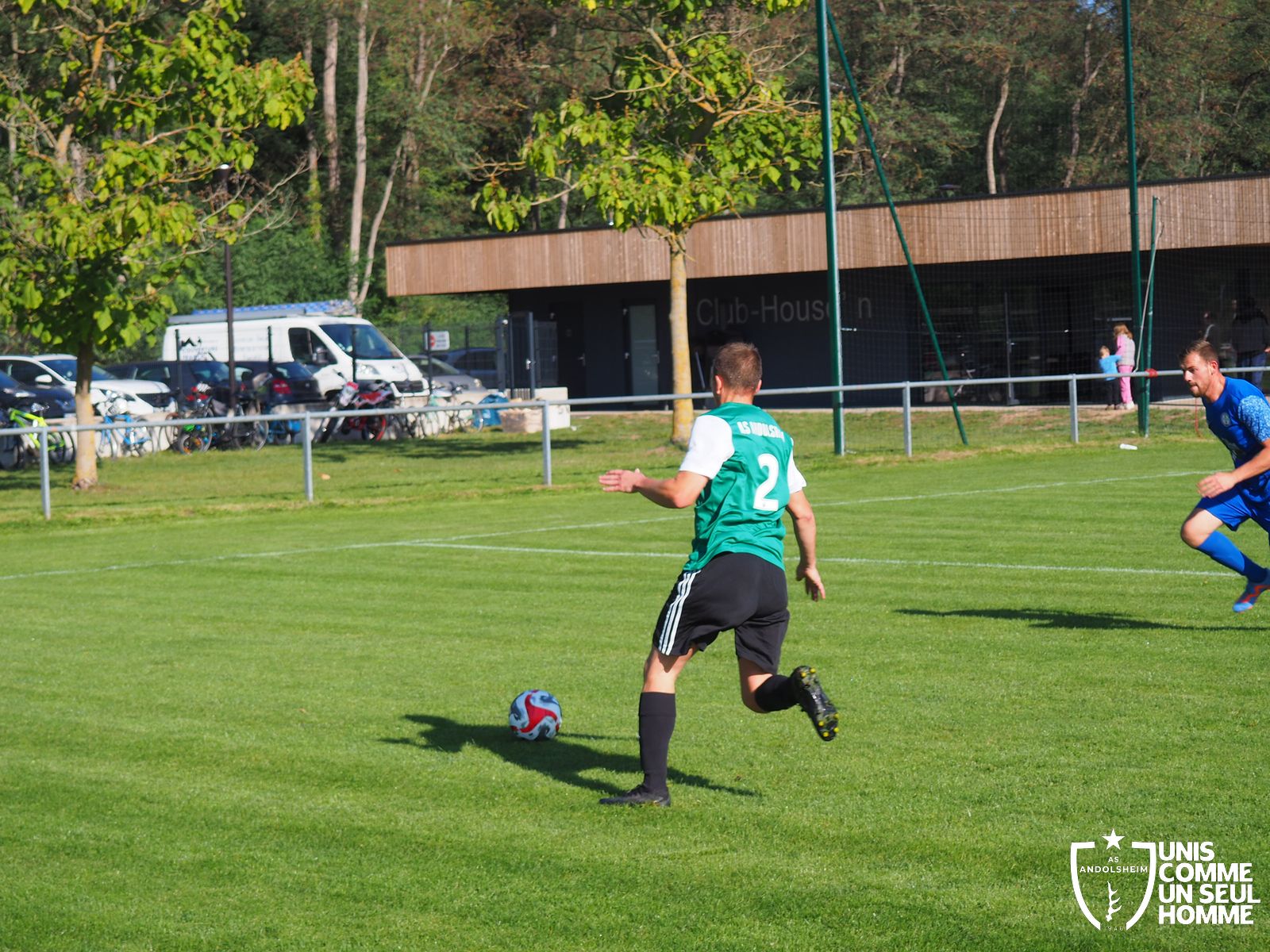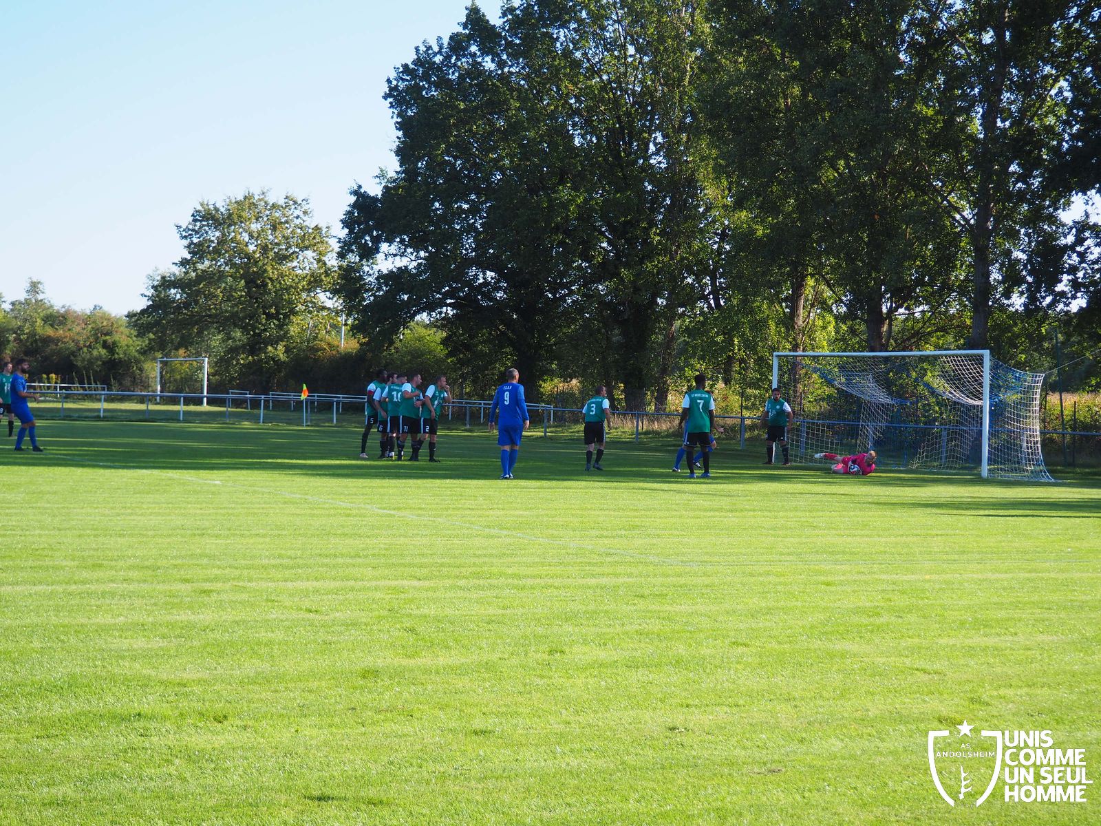 À la vingtième, Luc remet ça : 0 à 2 ! Dix minutes plus tard, le FCOH réduit le score à 1-2. Rien n’est acquis, messieurs ! Les 35 minutes suivantes voient une équipe locale plus précise, plus agressive, proche d’égaliser. Houssen, le retour ? Non… Les bleus ne concrétisent pas au tableau d’affichage… Au contraire des verts, qui tuent le match par Ewen à la 65e et Curtis à la 85e ! L’AS ANDOLSHEIM l’emporte 1 à 4 !