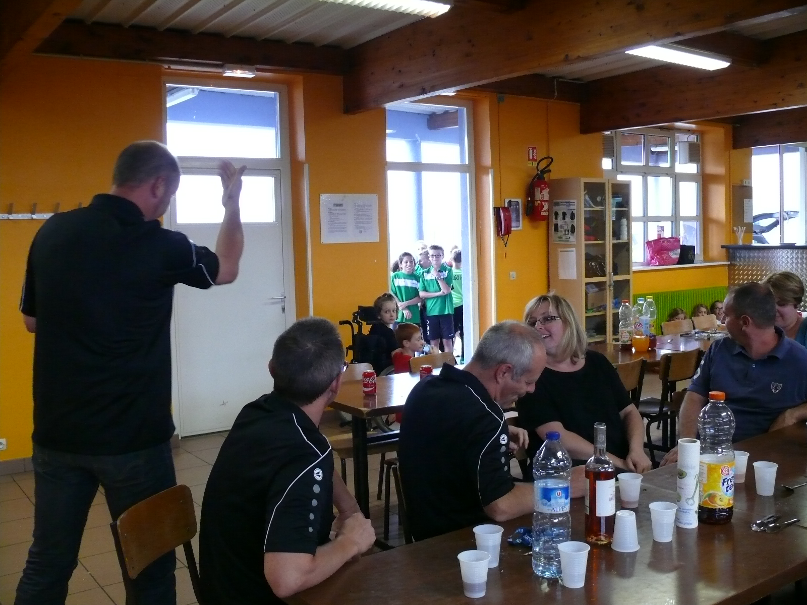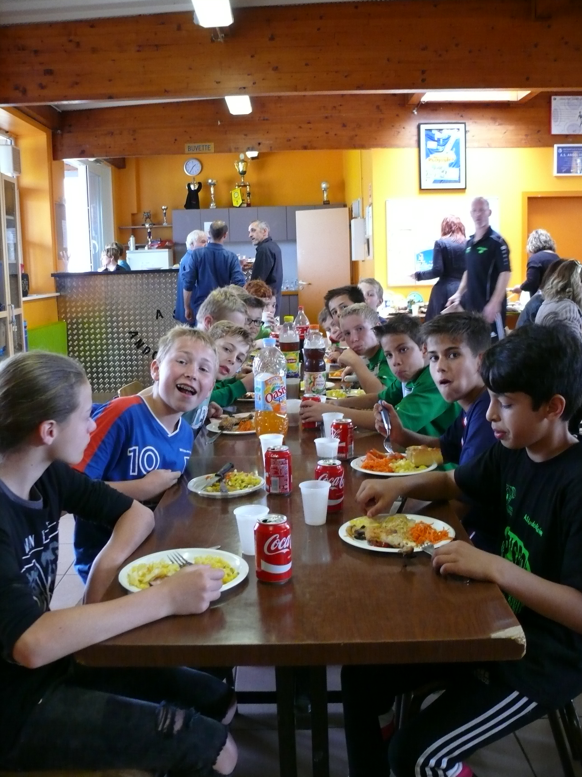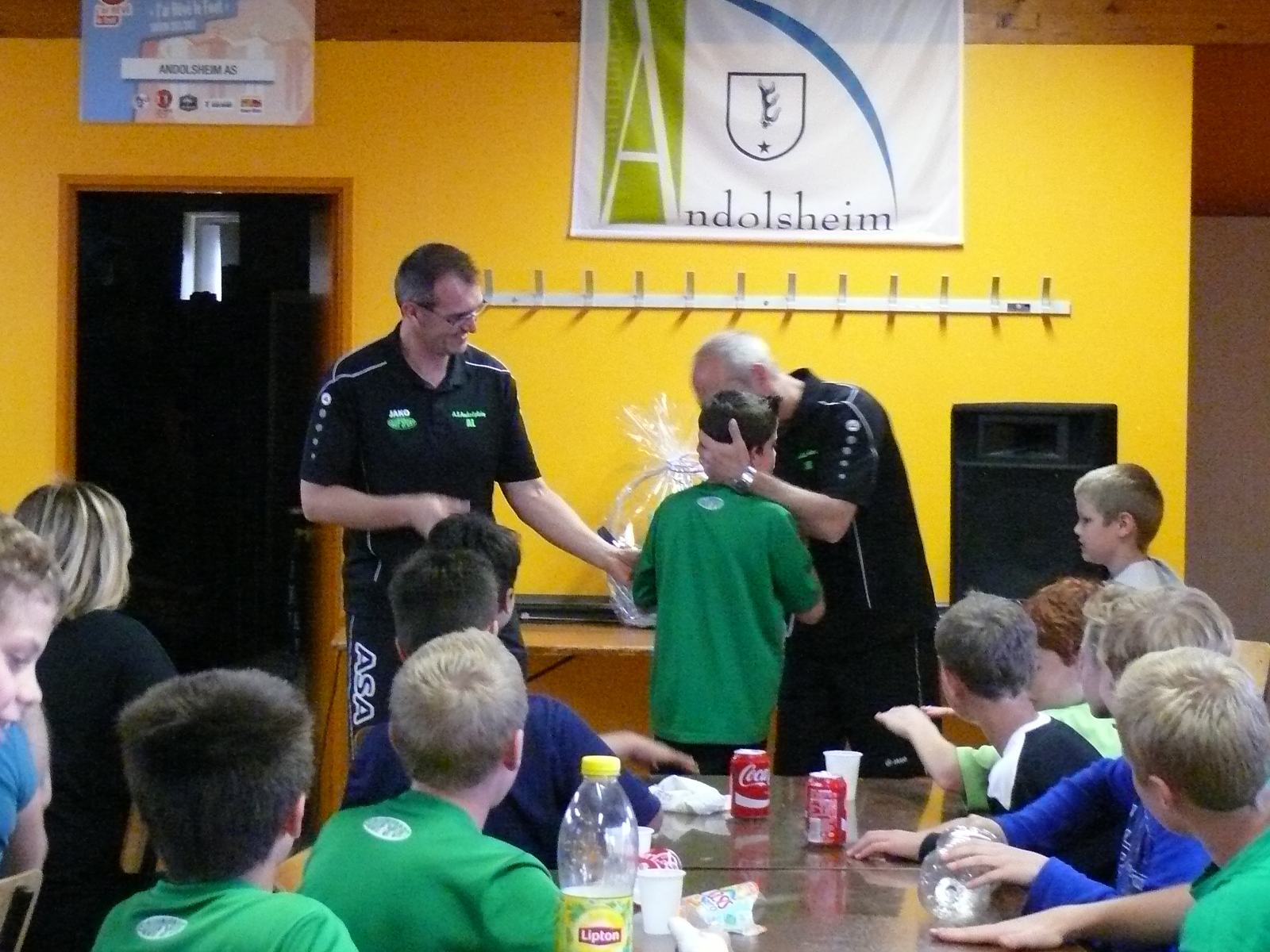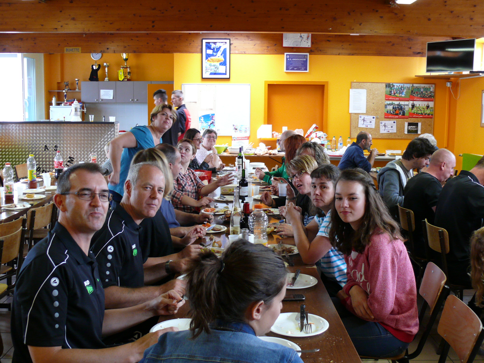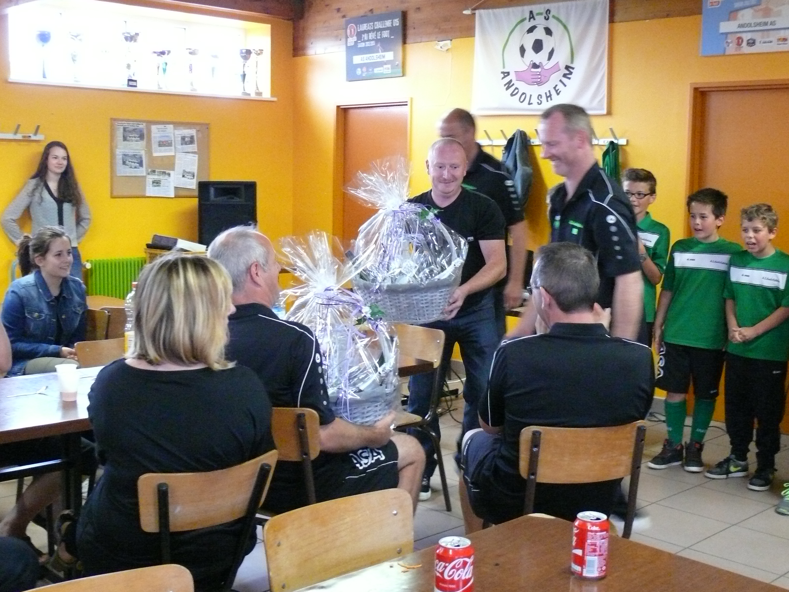 Après le vin d’honneur offert par la municipalité, joueurs et sympathisants se sont retrouvés au club-house de l’ASA autour d’un repas organisé par les parents. Ces derniers ont offert un magnifique panier garni aux éducateurs et chaque joueur s’est vu remettre un T-shirt du club avec son numéro et ses initiales. Le Président Francis Bonzon et la secrétaire de l’ASA Fabienne Fleith étaient invités à participer ce moment fort convivial pour clore la saison.