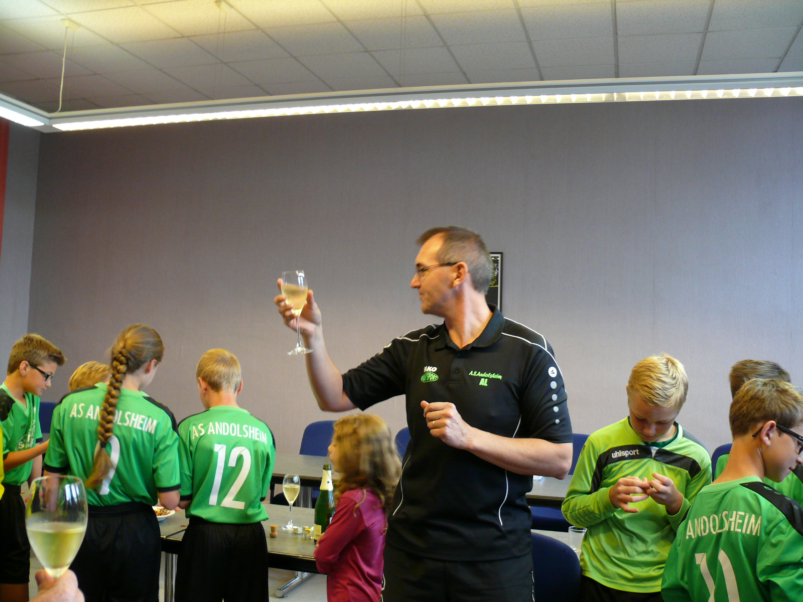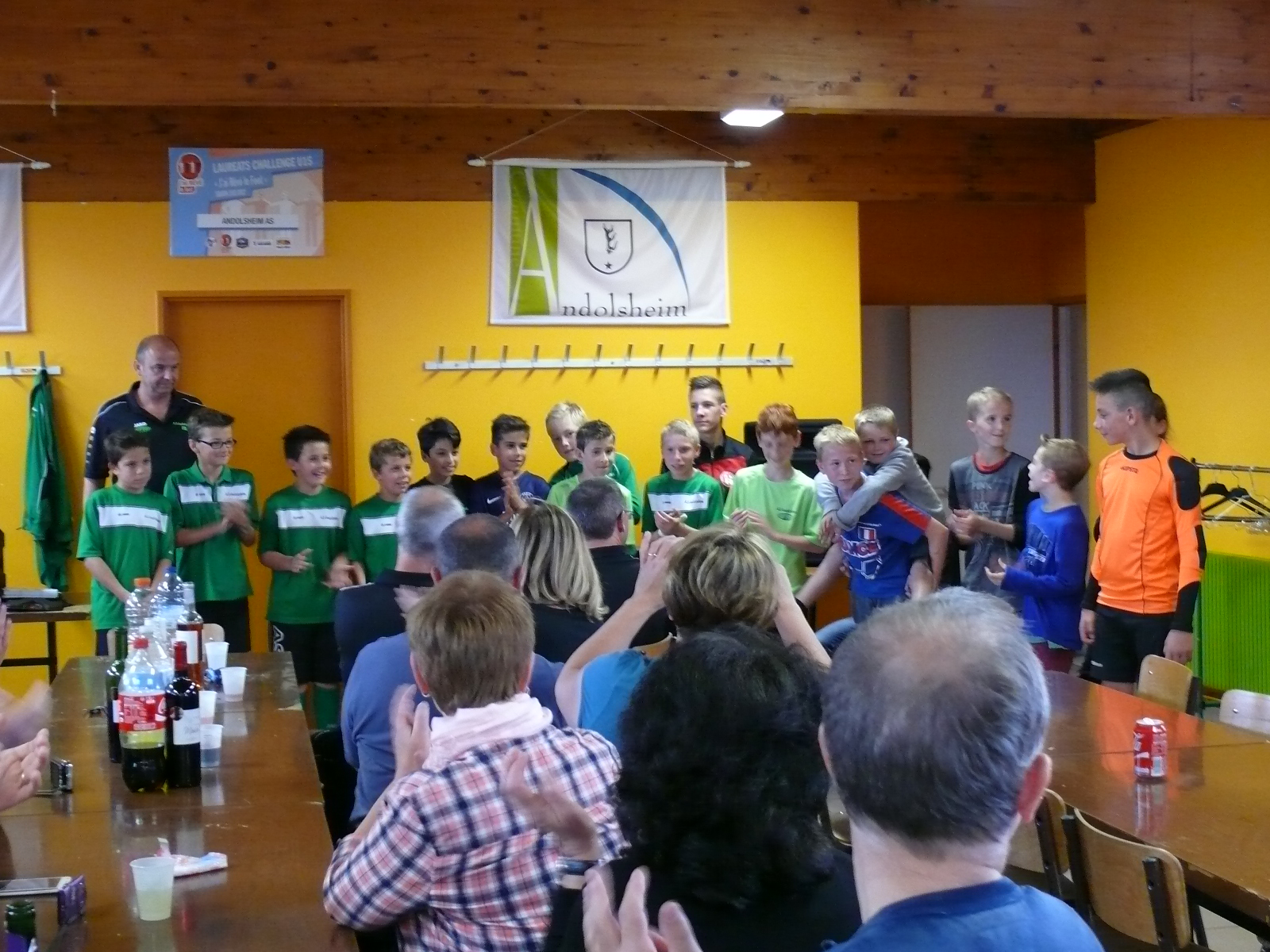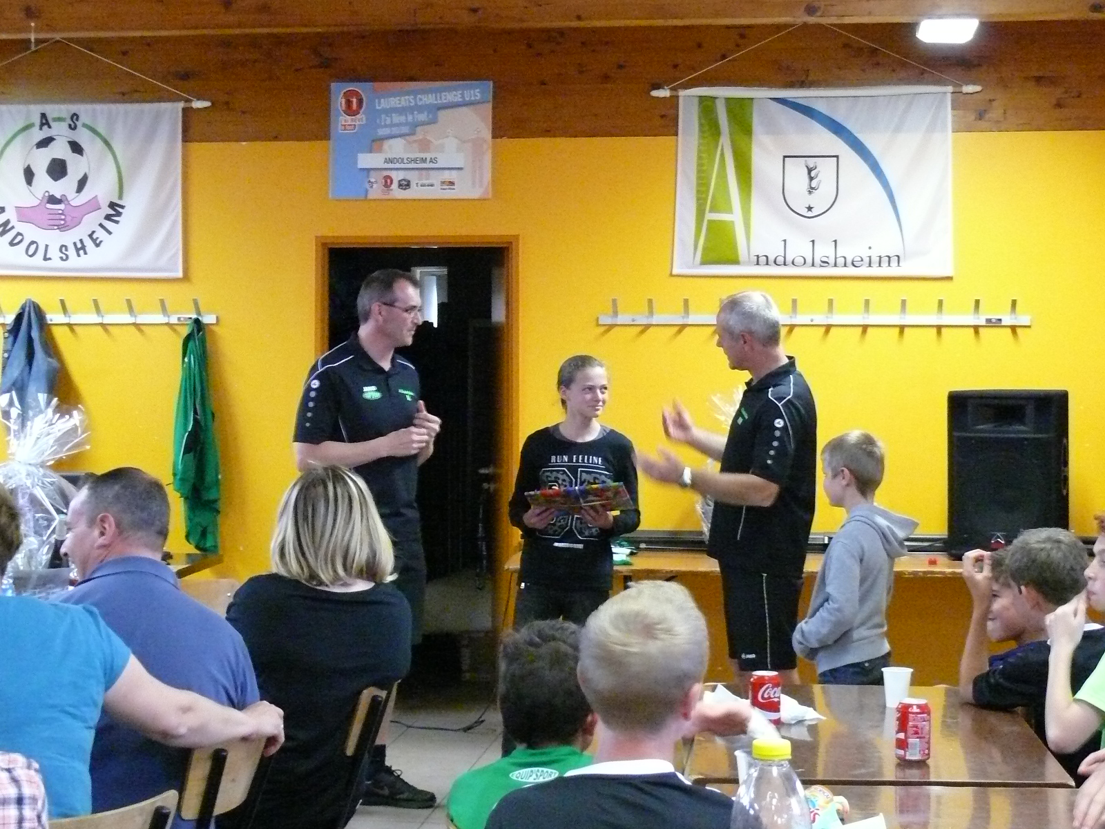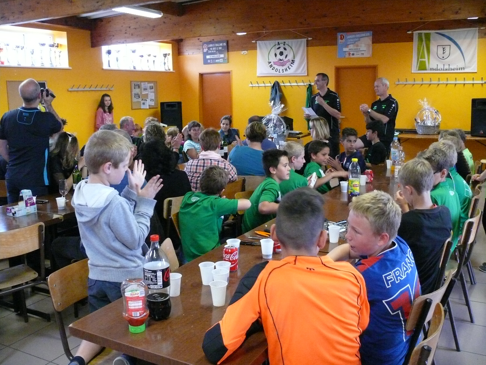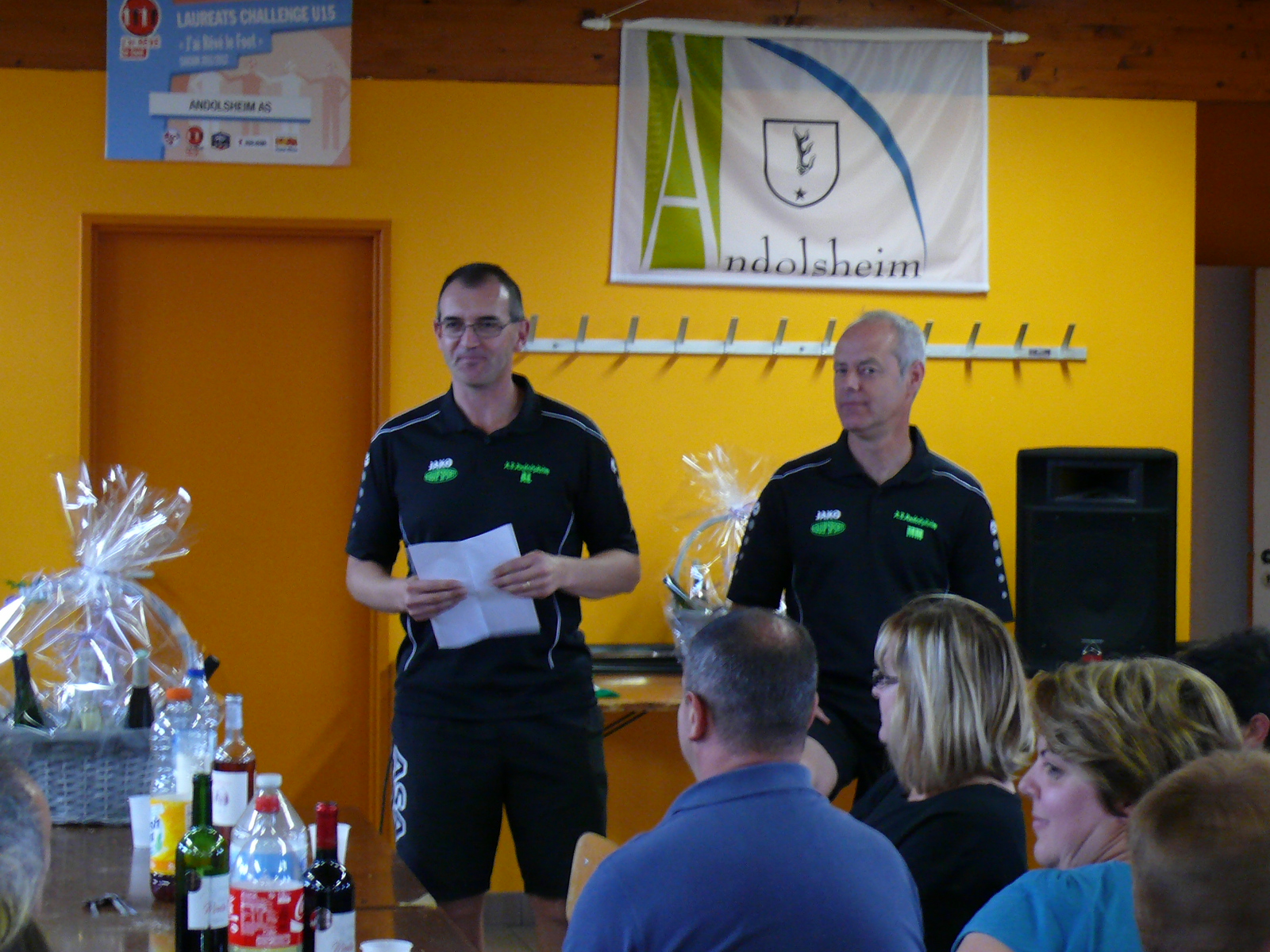 Après le vin d’honneur offert par la municipalité, joueurs et sympathisants se sont retrouvés au club-house de l’ASA autour d’un repas organisé par les parents. Ces derniers ont offert un magnifique panier garni aux éducateurs et chaque joueur s’est vu remettre un T-shirt du club avec son numéro et ses initiales. Le Président Francis Bonzon et la secrétaire de l’ASA Fabienne Fleith étaient invités à participer ce moment fort convivial pour clore la saison.