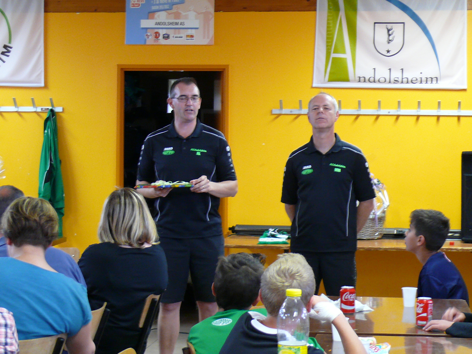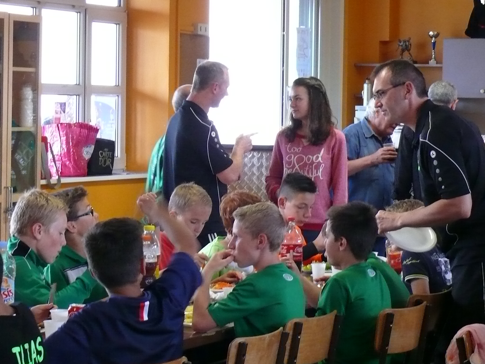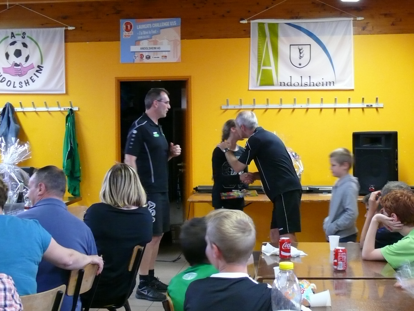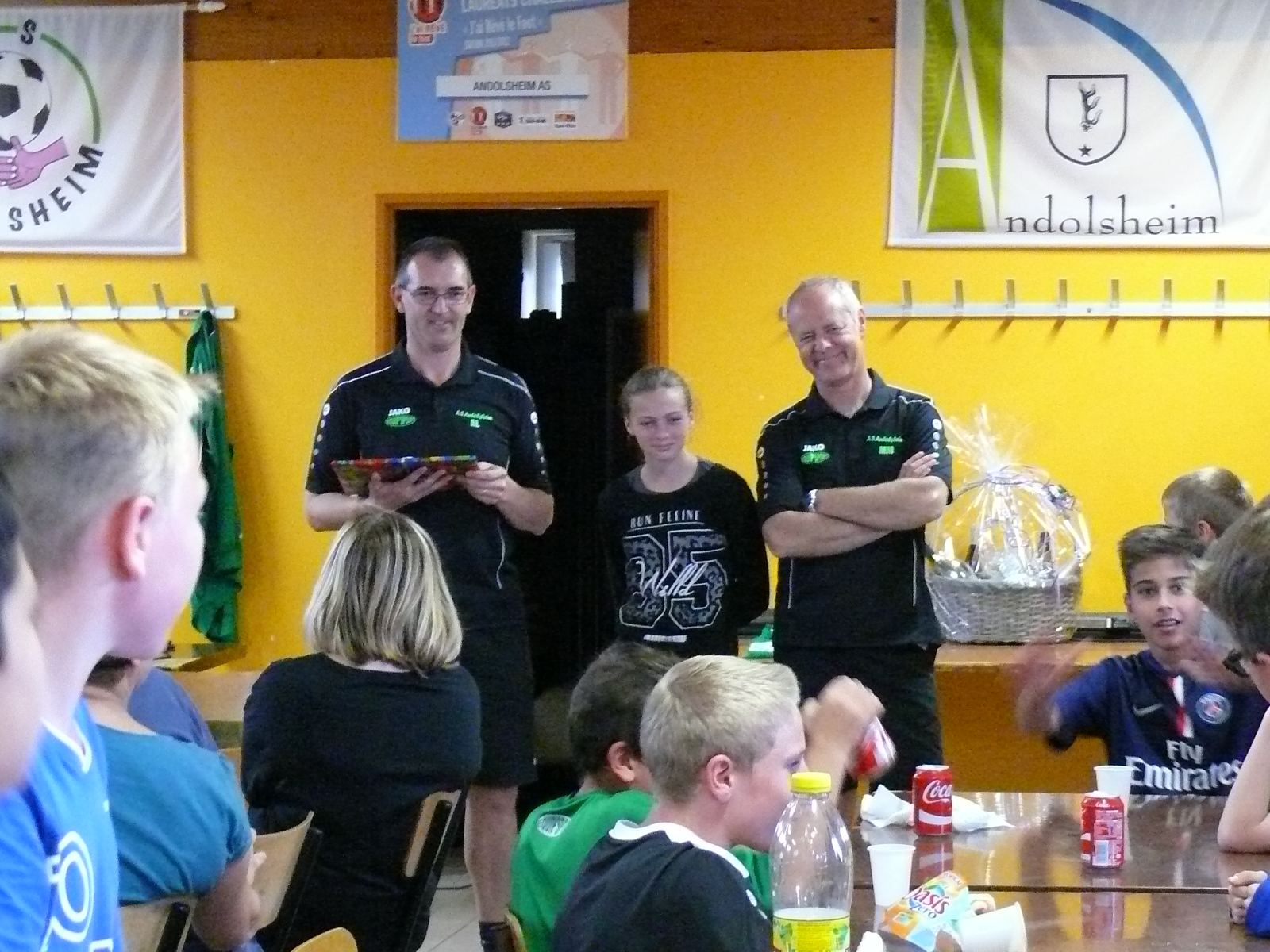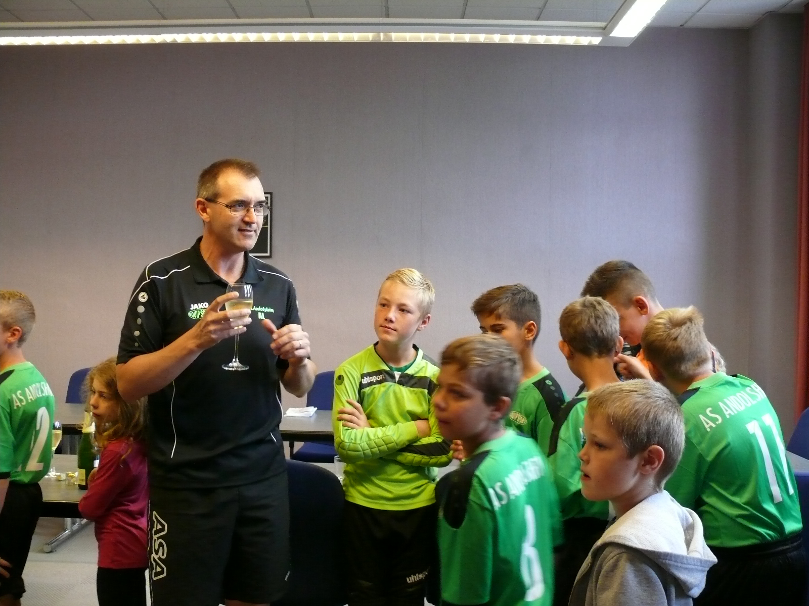Après le vin d’honneur offert par la municipalité, joueurs et sympathisants se sont retrouvés au club-house de l’ASA autour d’un repas organisé par les parents. Ces derniers ont offert un magnifique panier garni aux éducateurs et chaque joueur s’est vu remettre un T-shirt du club avec son numéro et ses initiales. Le Président Francis Bonzon et la secrétaire de l’ASA Fabienne Fleith étaient invités à participer ce moment fort convivial pour clore la saison.