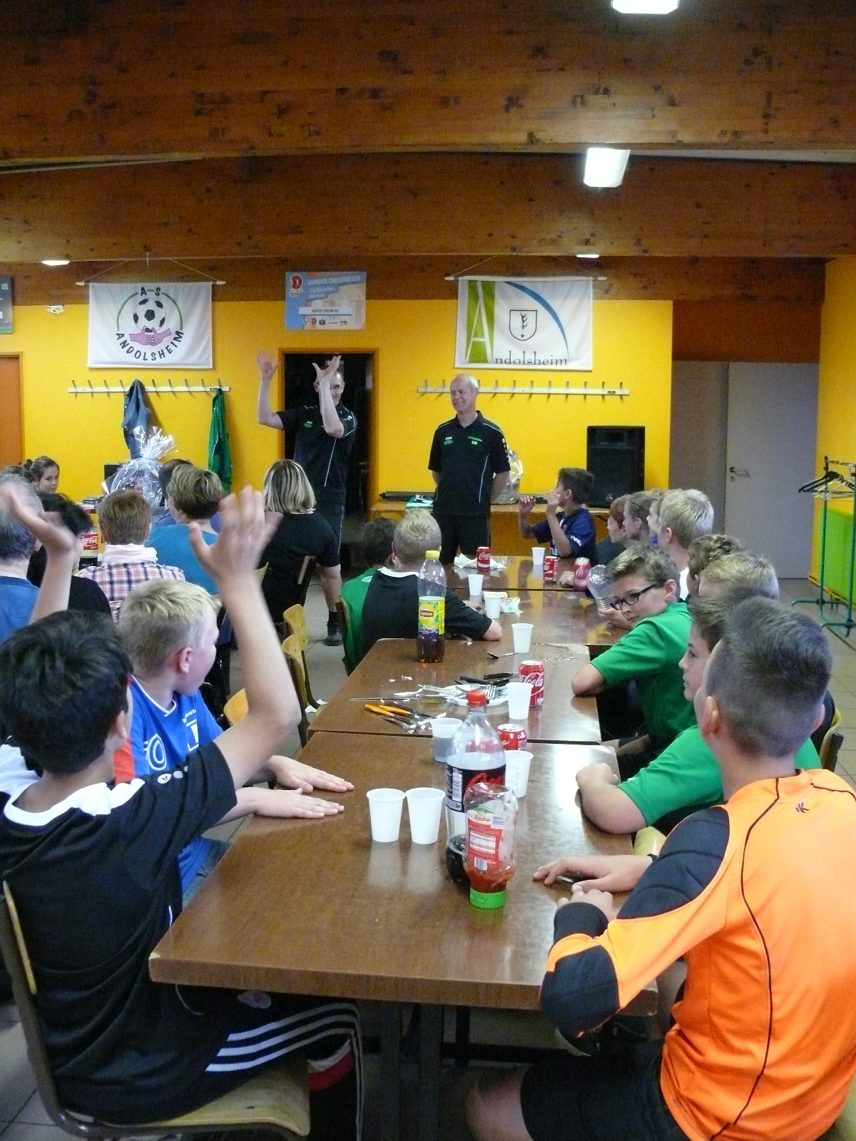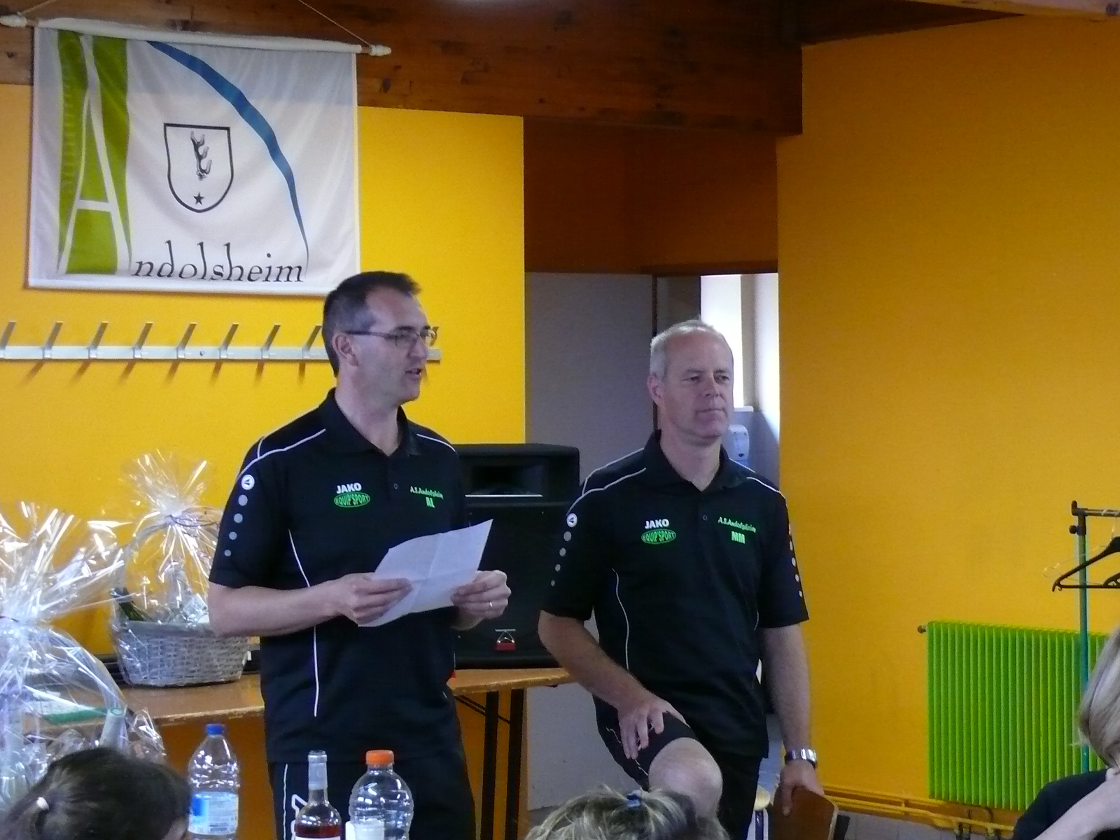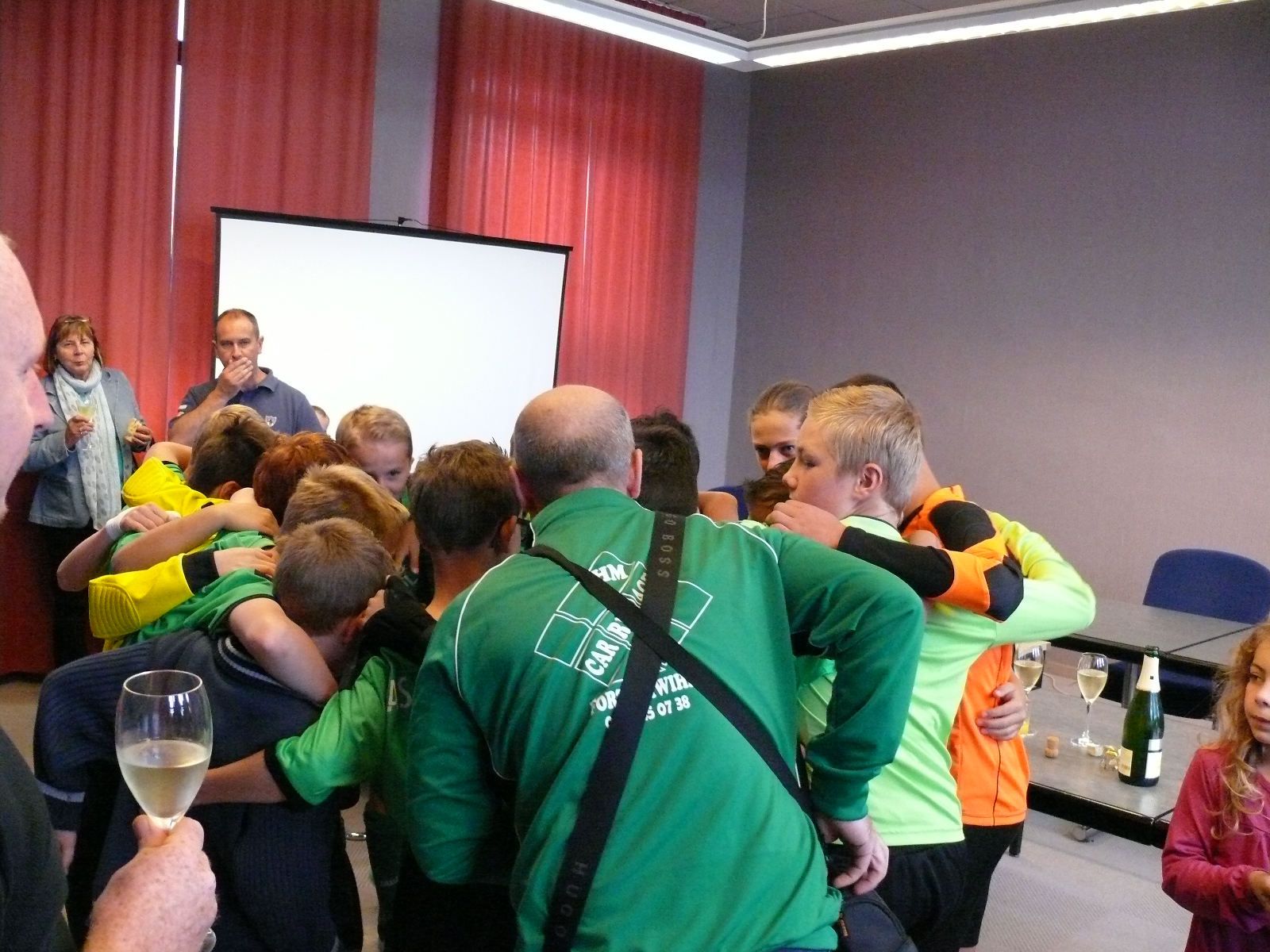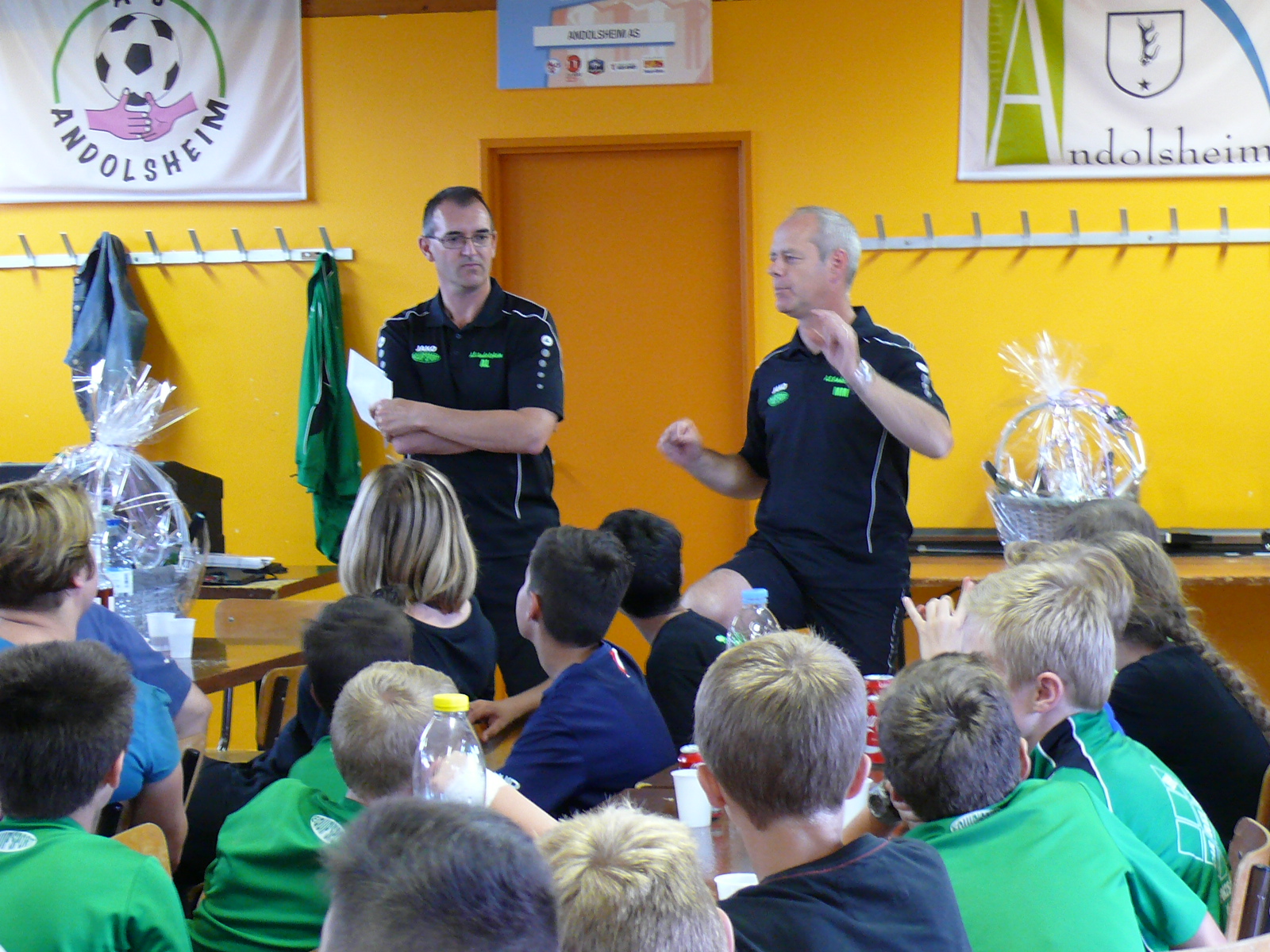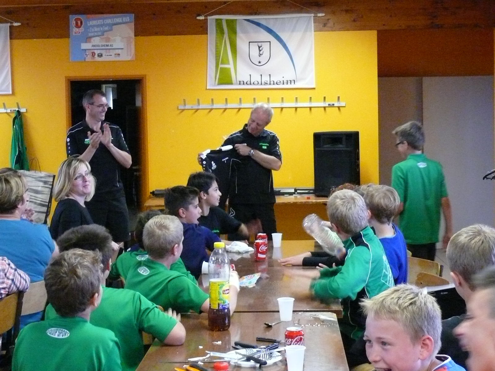 Après le vin d’honneur offert par la municipalité, joueurs et sympathisants se sont retrouvés au club-house de l’ASA autour d’un repas organisé par les parents. Ces derniers ont offert un magnifique panier garni aux éducateurs et chaque joueur s’est vu remettre un T-shirt du club avec son numéro et ses initiales. Le Président Francis Bonzon et la secrétaire de l’ASA Fabienne Fleith étaient invités à participer ce moment fort convivial pour clore la saison.