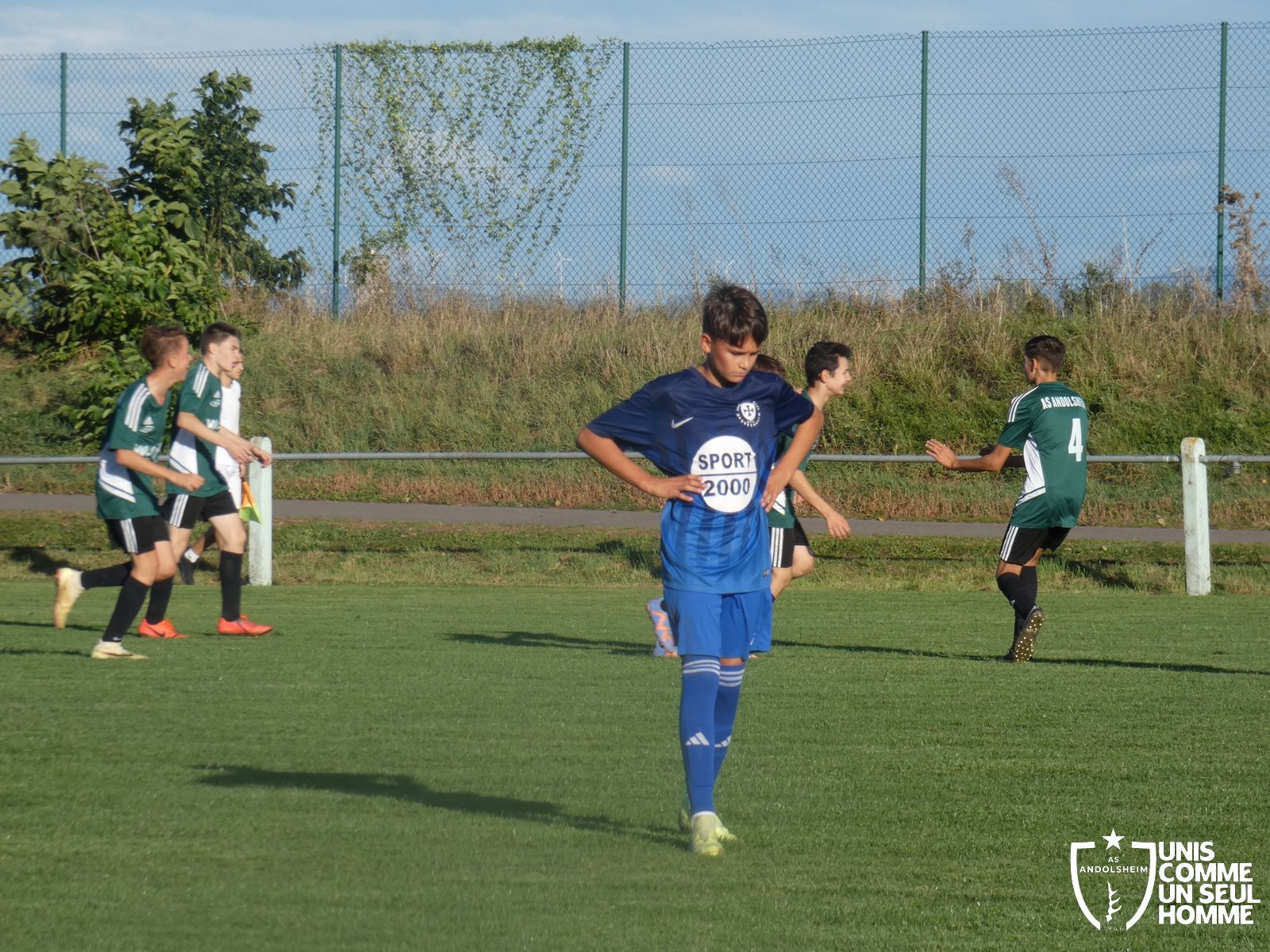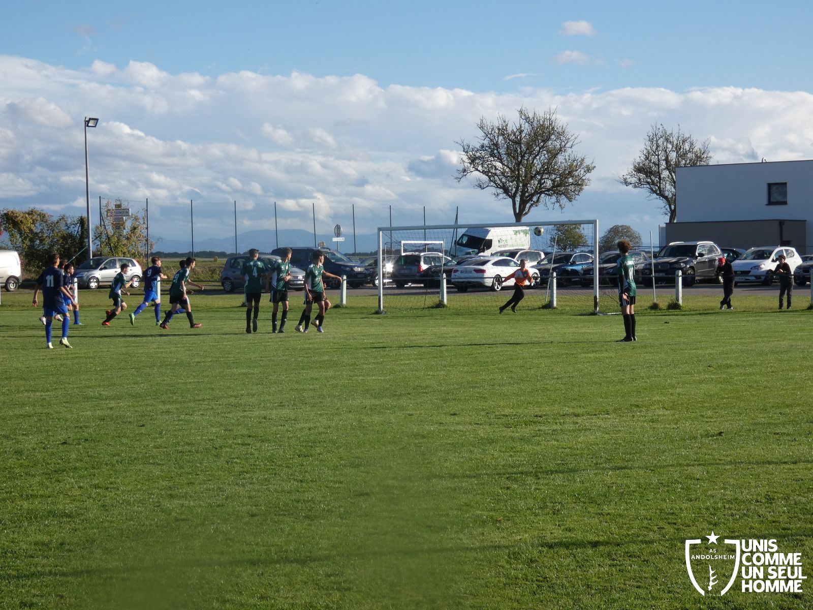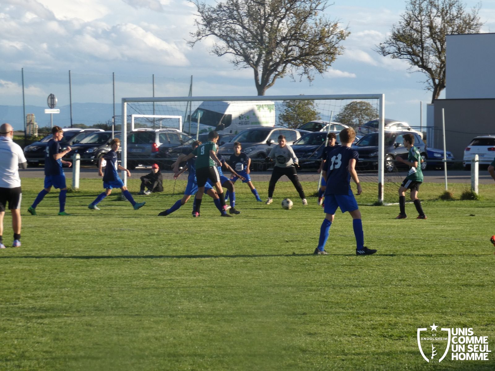 L’entame de match est assez équilibrée pour nos Verts mais nos adversaires du jour balancent régulièrement de longues balles vers l’avant, notre défense devra être bien en place durant cette rencontre si elle ne veut pas se faire prendre de cours. Et malheureusement au quart d’heure de jeu, sur une balle en profondeur, les Bleus trouvent le chemin des filets. 1-0 pour les Bleus. Il y a manifestement trop d’écart entre les lignes d’attaque et de défense, nos jeunes pousses essaient de construire du jeu mais perdent trop rapidement la balle.