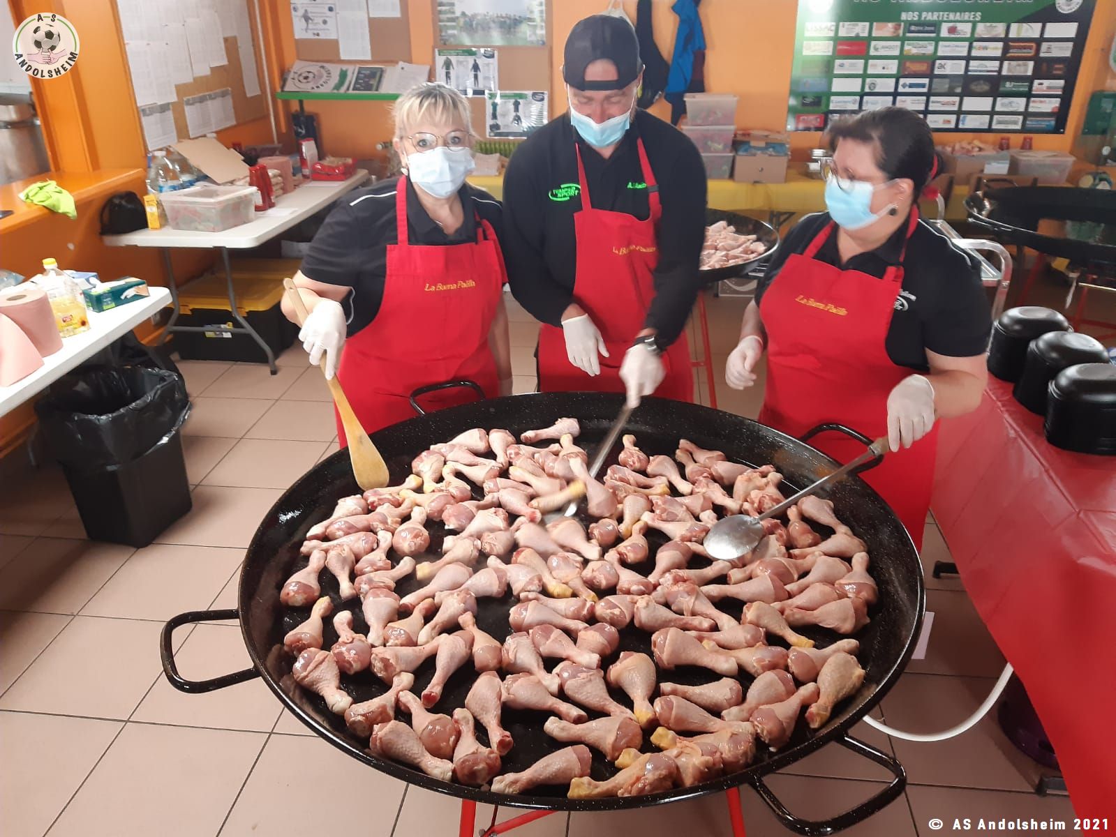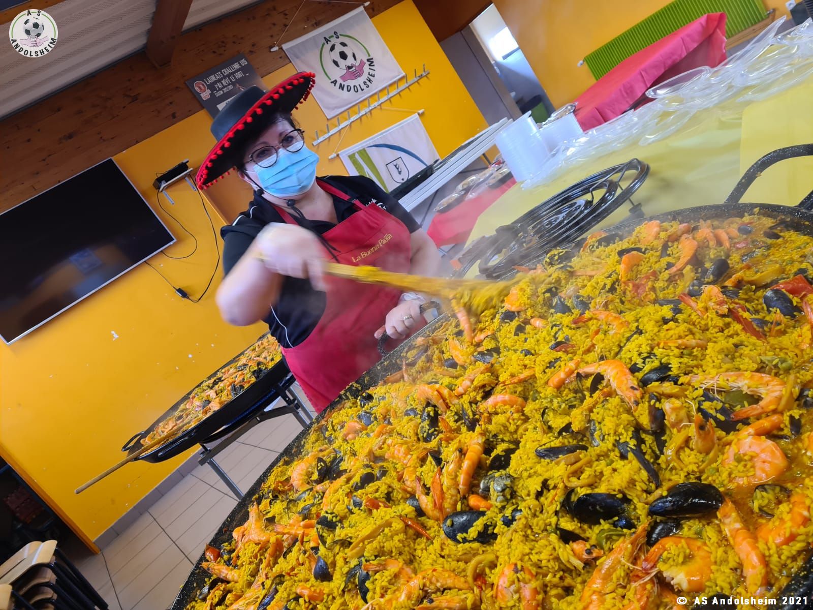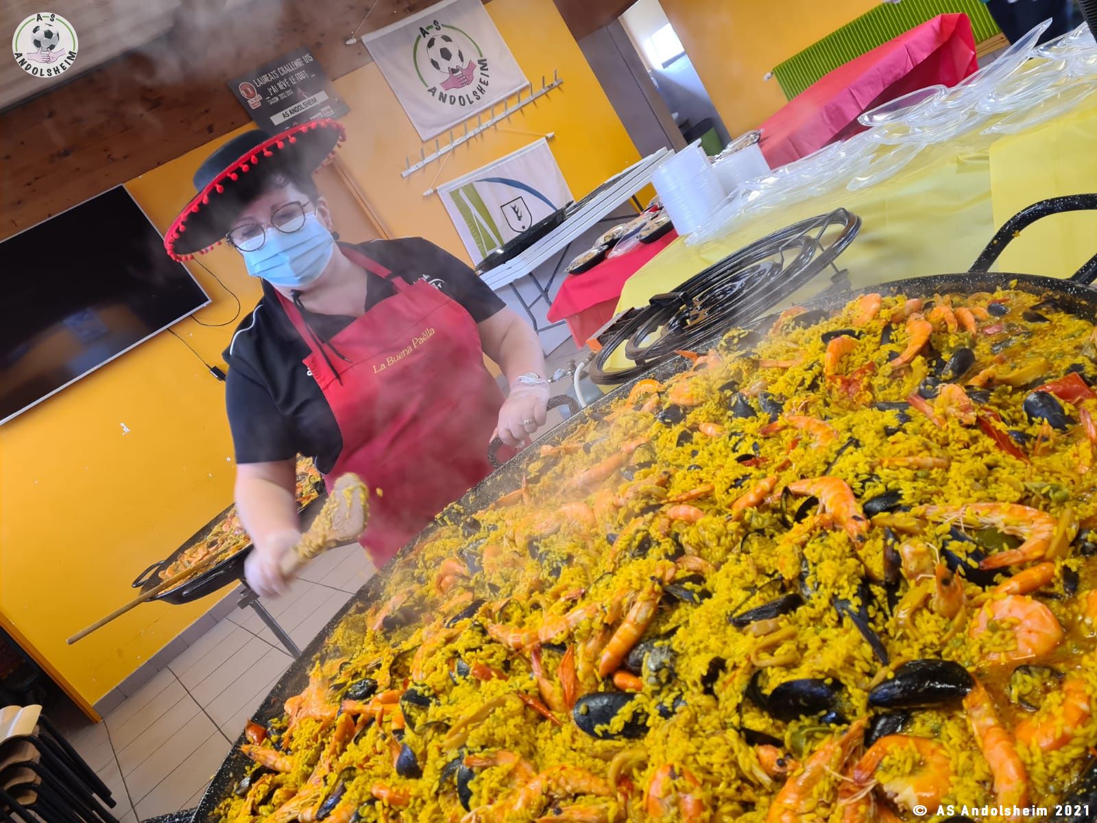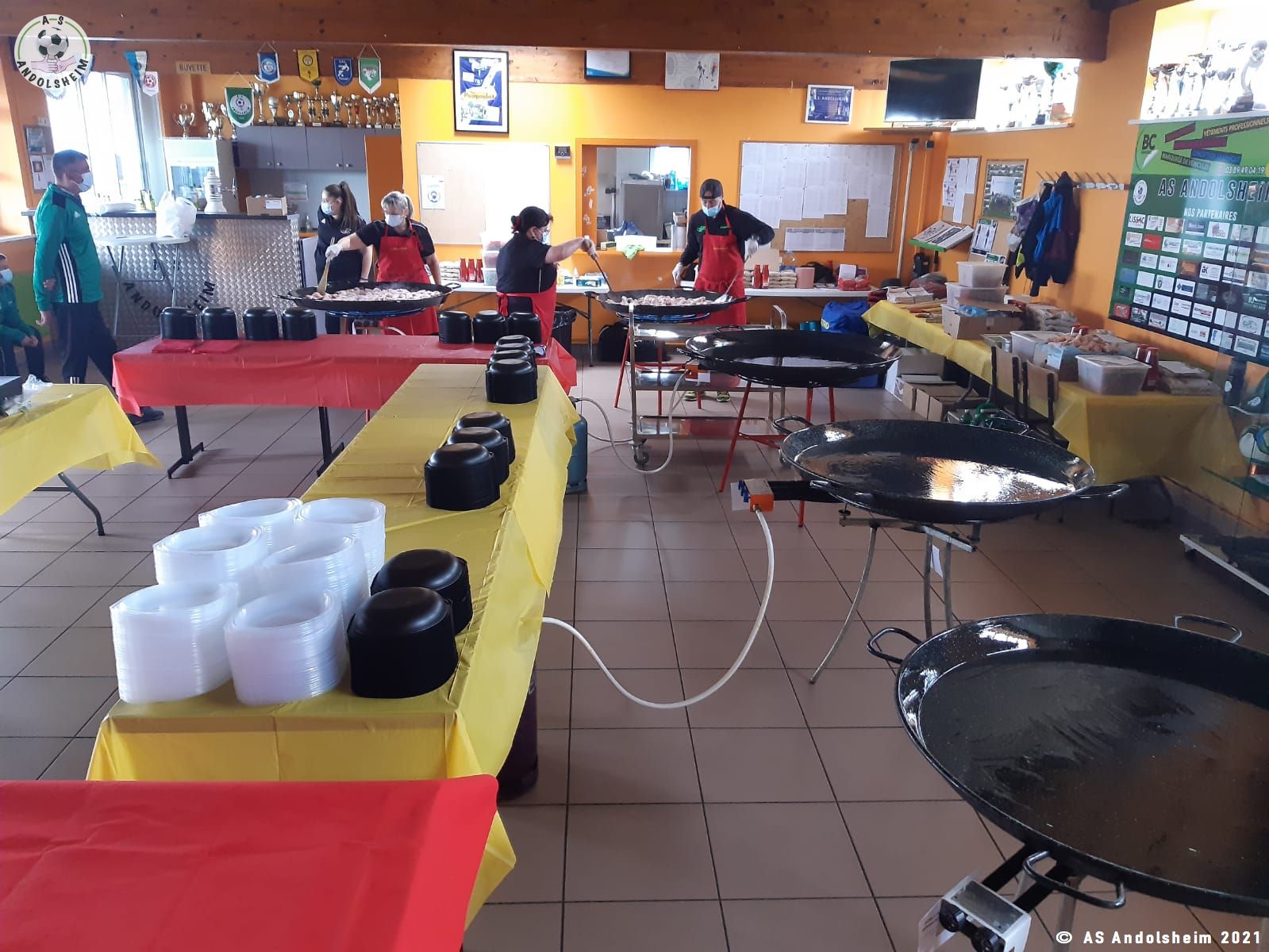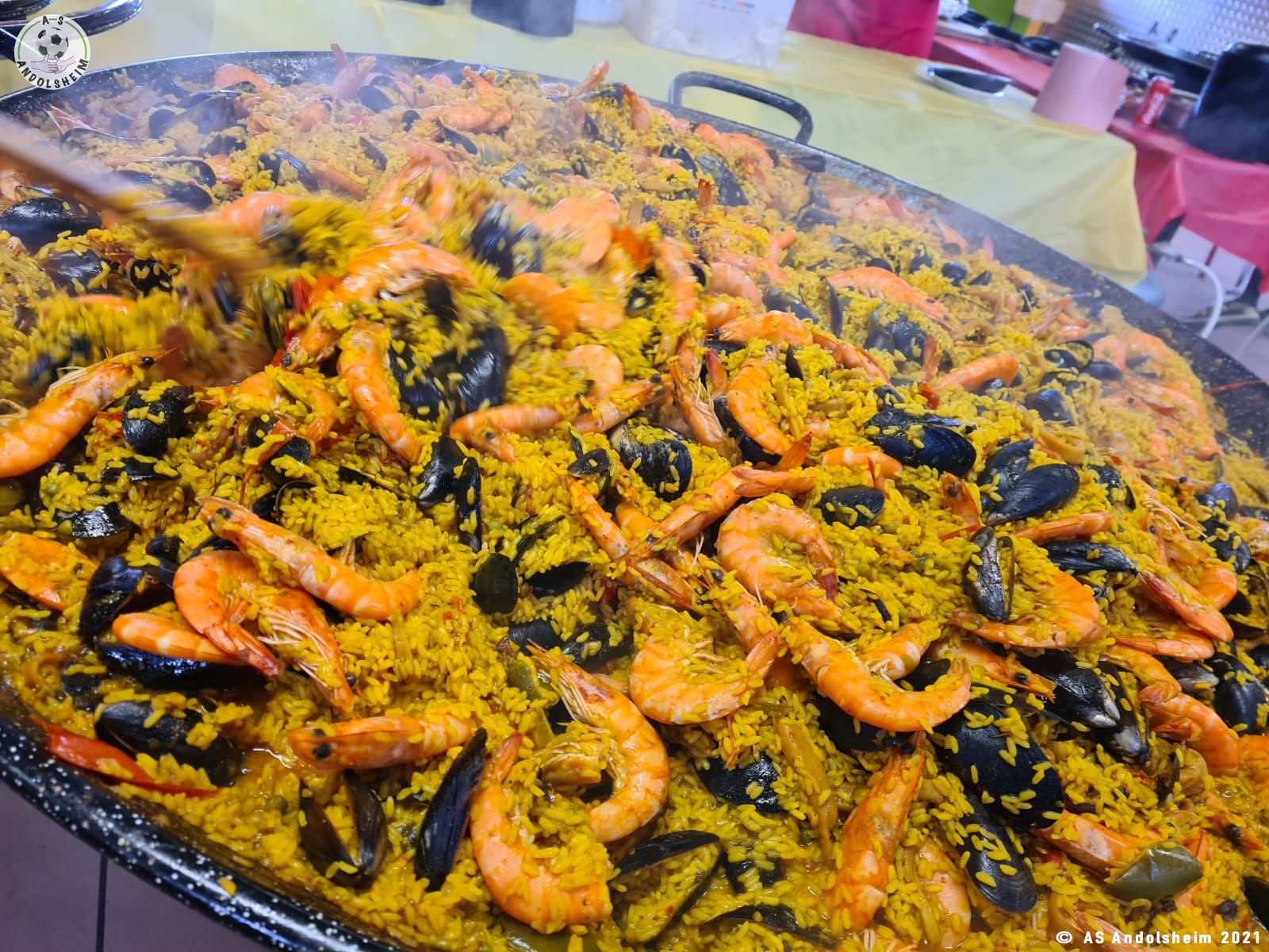 Nos bénévoles ont utilisé 6 grandes poêles pour vous concocter 480 parts de Paëlla.