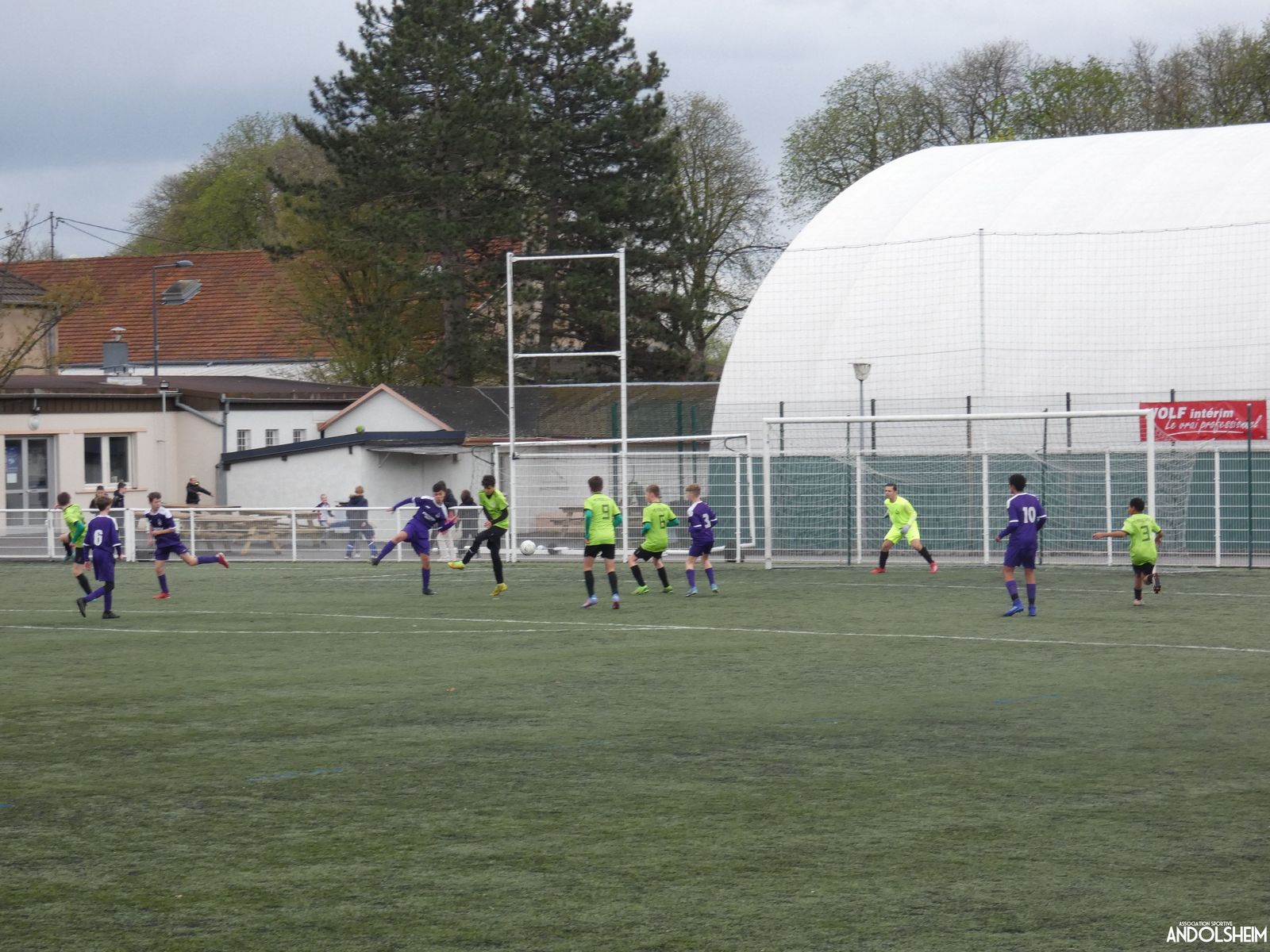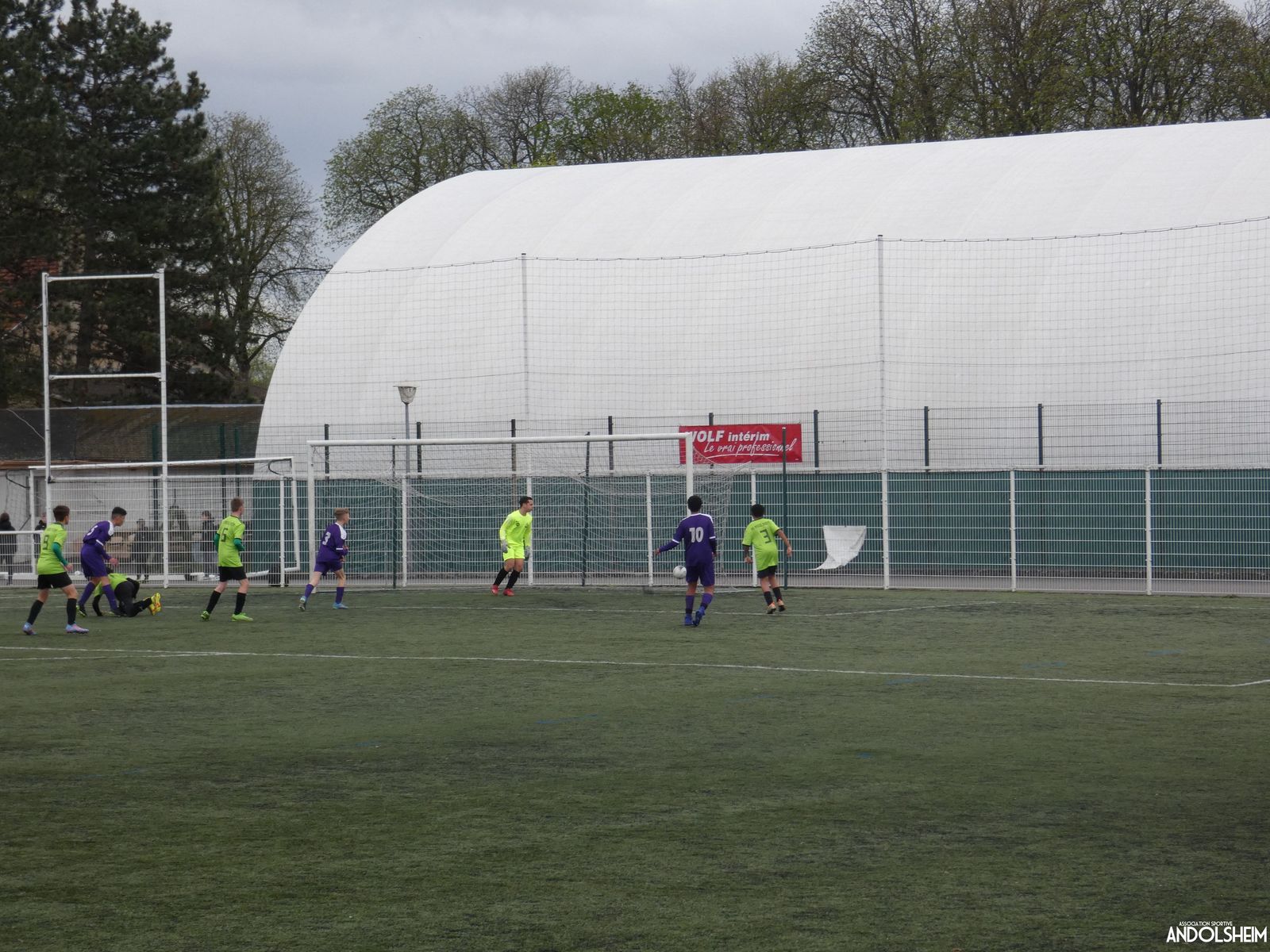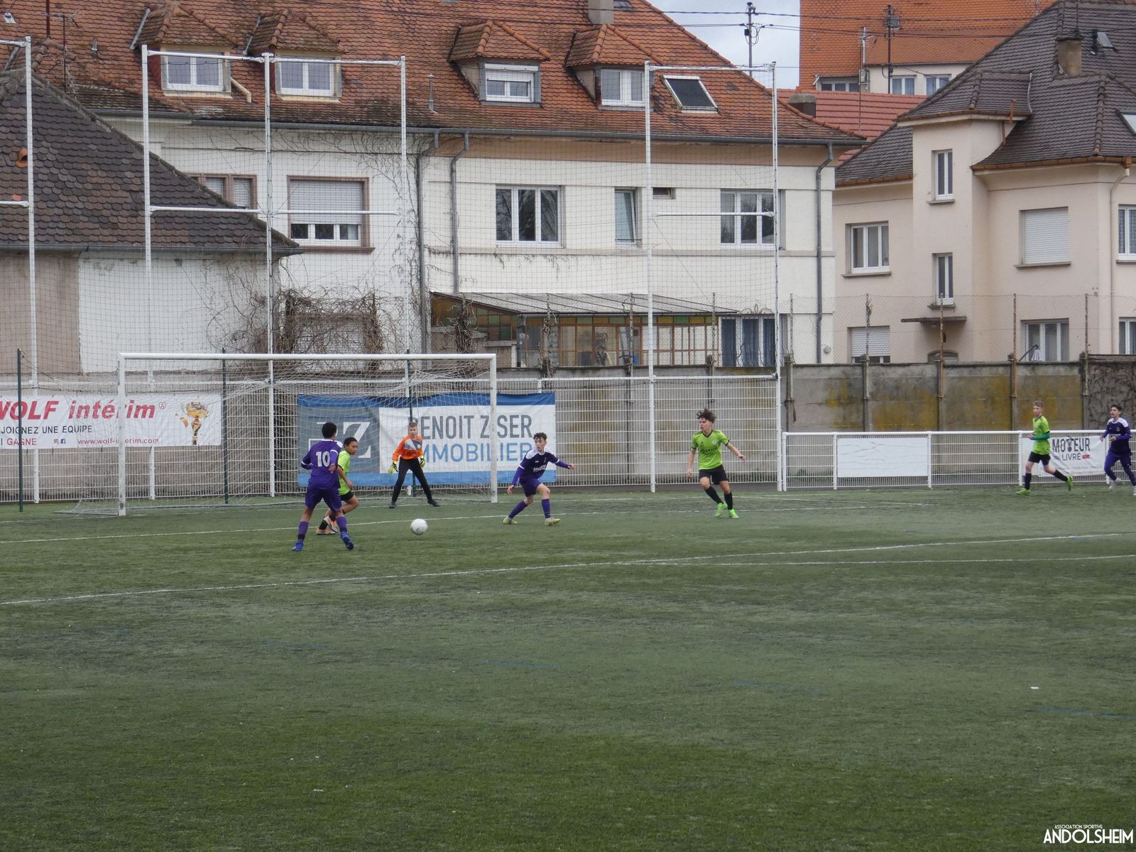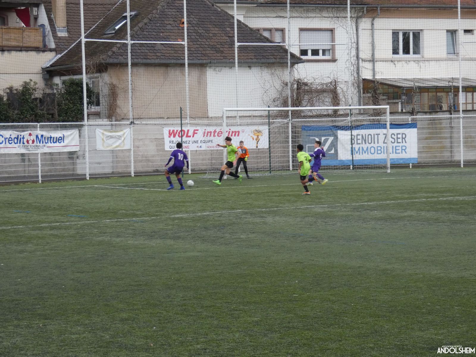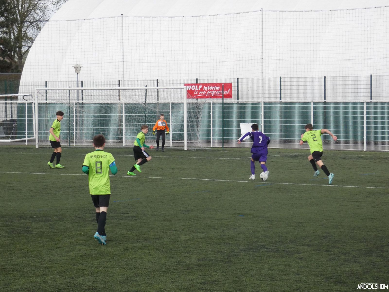 Nos « Verts » sont en place en ce début de rencontre et essaient de construire sur cette surface rapide. Mais dès la cinquième minute, ils commettent un premier impair et se font piéger par l’opportunisme des adversaires, 1-0. Les Violets jouent un jeu long et profitent de tous les contres en s’appuyant essentiellement sur leur numéro 7. Nos jeunes pousses perdent trop de ballons pour inquiéter la défense adverse. Les Violets aggravent encore le score par deux fois avec le même schéma de jeu. Notre portier, dernier et seul défenseur, perd malheureusement ses duels. Manifestement, il y a un gros trou dans la raquette de notre défense centrale. Sur un coup franc, Lucas ouvre enfin le score pour Andolsheim ! Quelques minutes plus tard, dans les mêmes conditions, il ne cadre pas pour son doublé. Dommage…