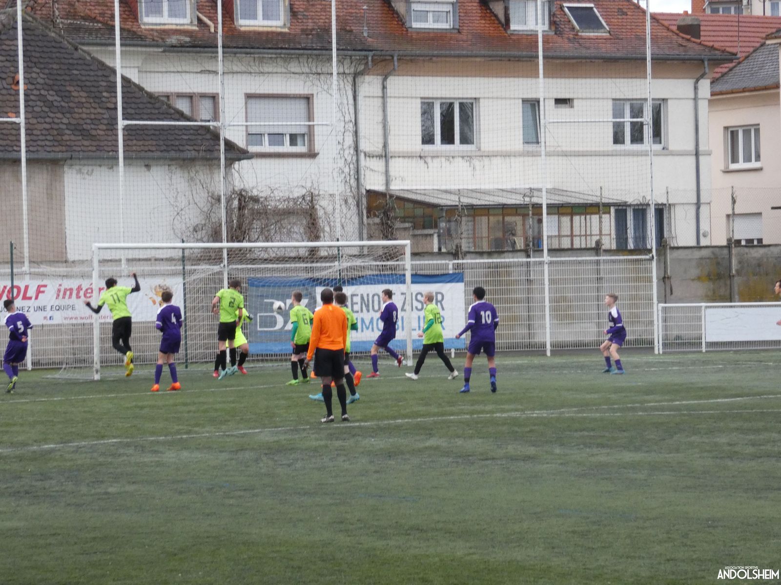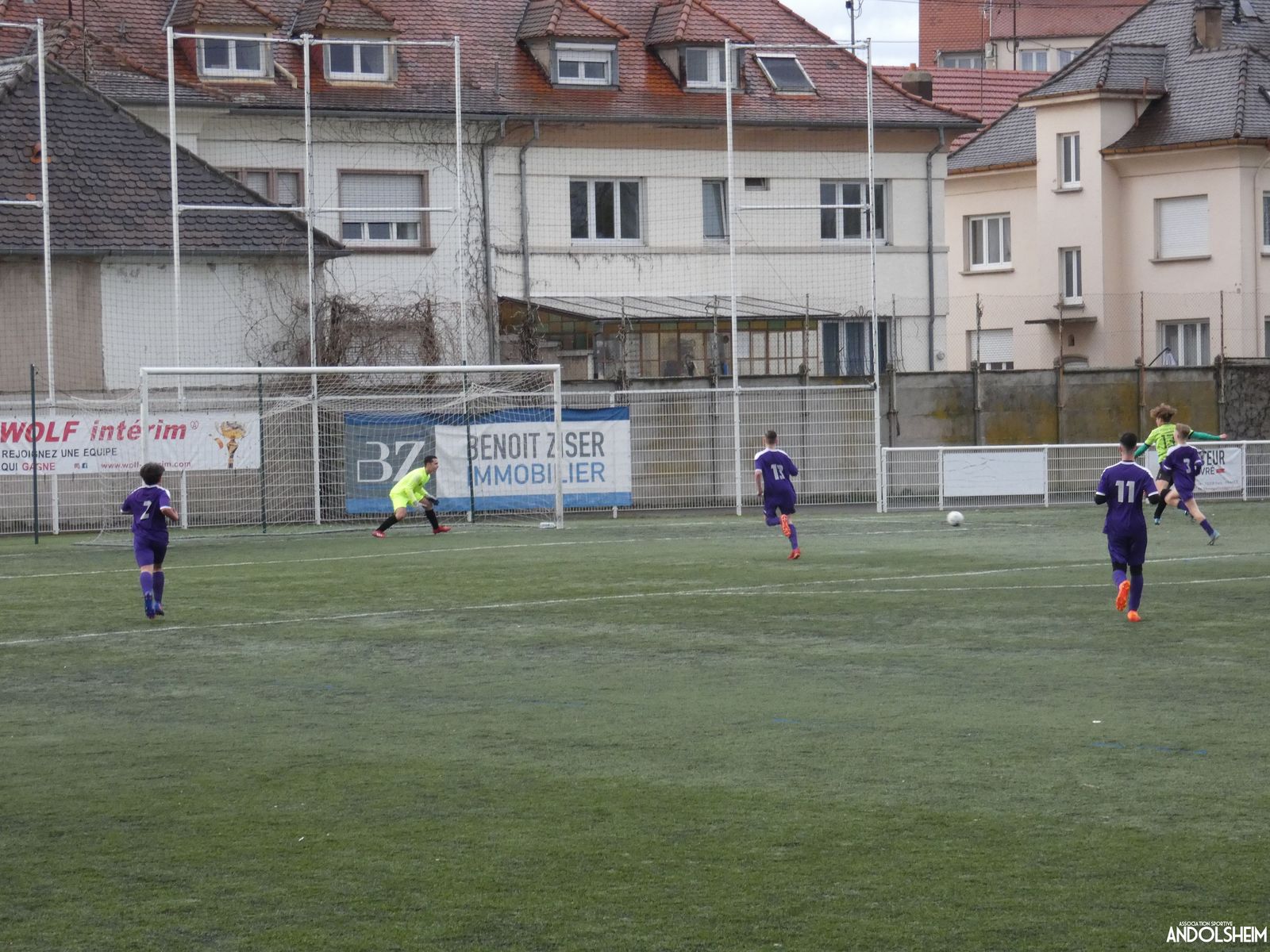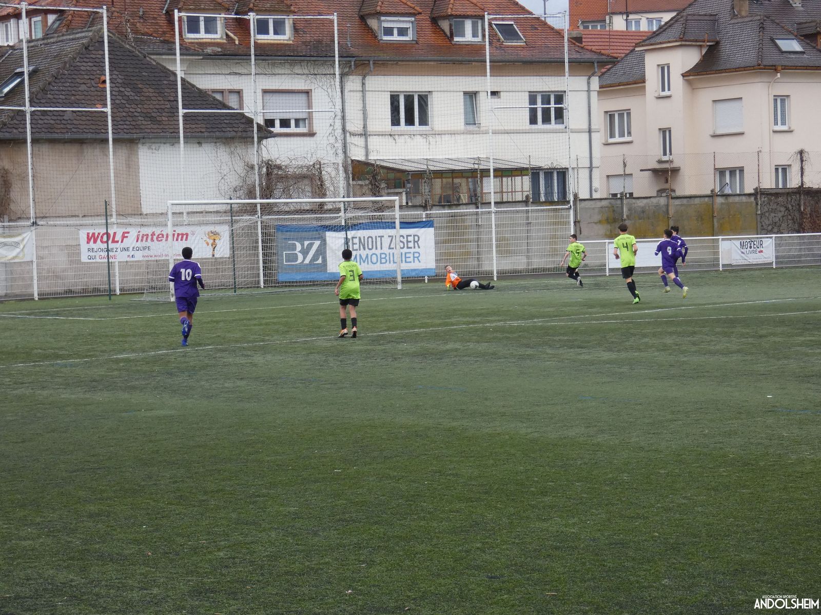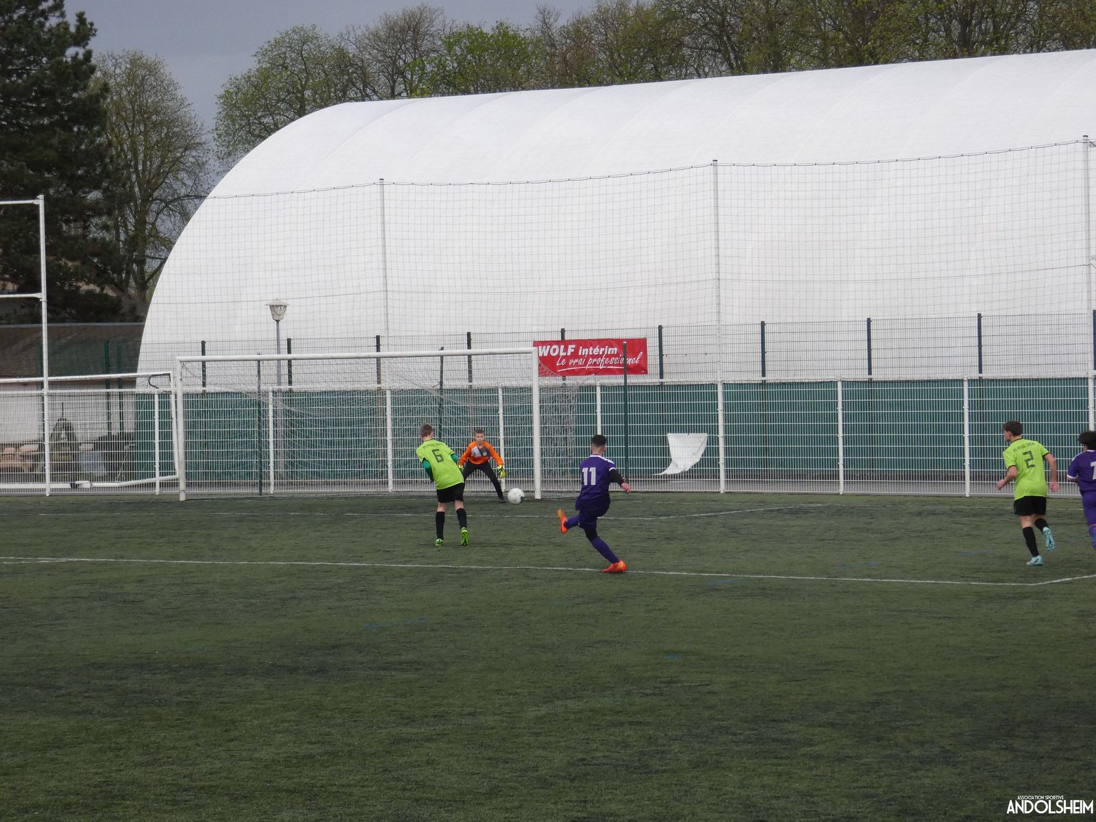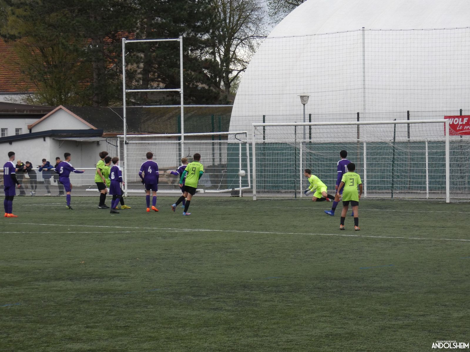 Nos « Verts » sont en place en ce début de rencontre et essaient de construire sur cette surface rapide. Mais dès la cinquième minute, ils commettent un premier impair et se font piéger par l’opportunisme des adversaires, 1-0. Les Violets jouent un jeu long et profitent de tous les contres en s’appuyant essentiellement sur leur numéro 7. Nos jeunes pousses perdent trop de ballons pour inquiéter la défense adverse. Les Violets aggravent encore le score par deux fois avec le même schéma de jeu. Notre portier, dernier et seul défenseur, perd malheureusement ses duels. Manifestement, il y a un gros trou dans la raquette de notre défense centrale. Sur un coup franc, Lucas ouvre enfin le score pour Andolsheim ! Quelques minutes plus tard, dans les mêmes conditions, il ne cadre pas pour son doublé. Dommage…