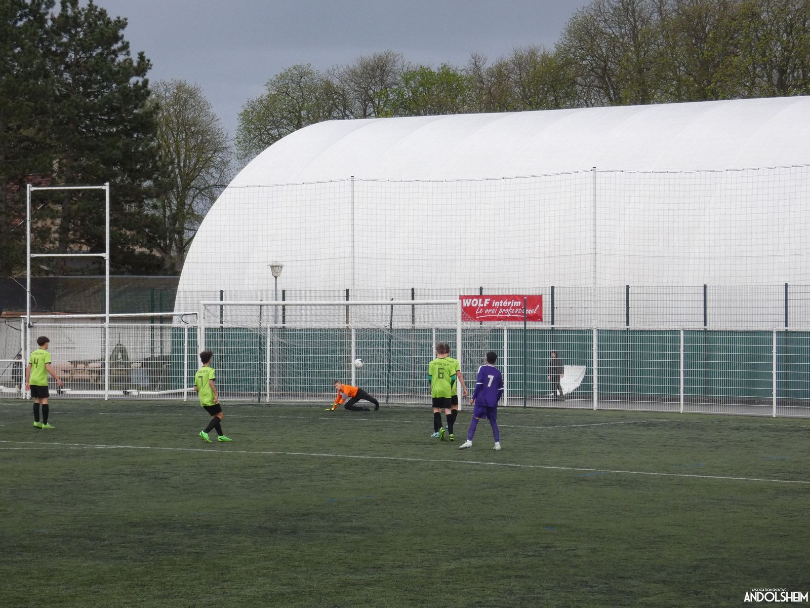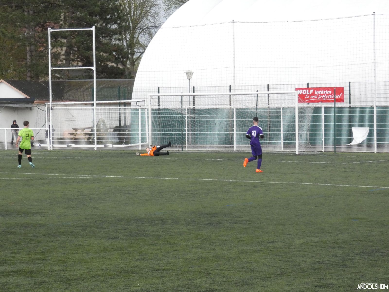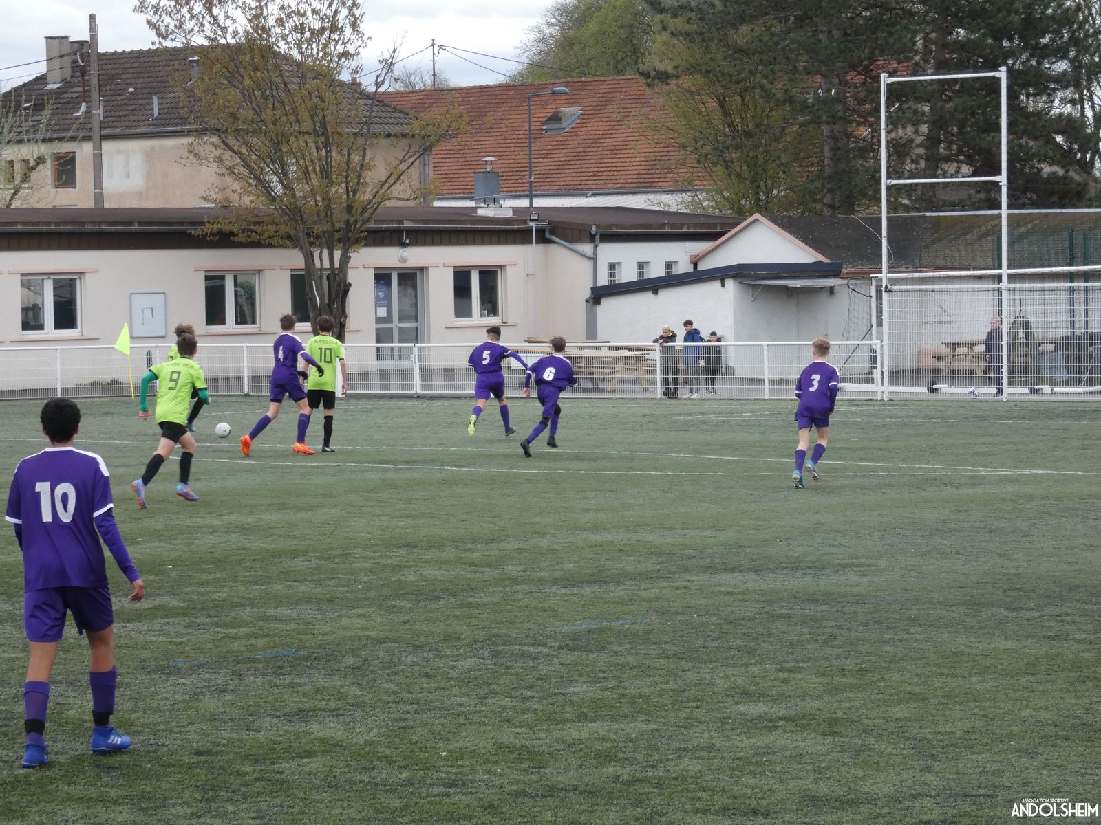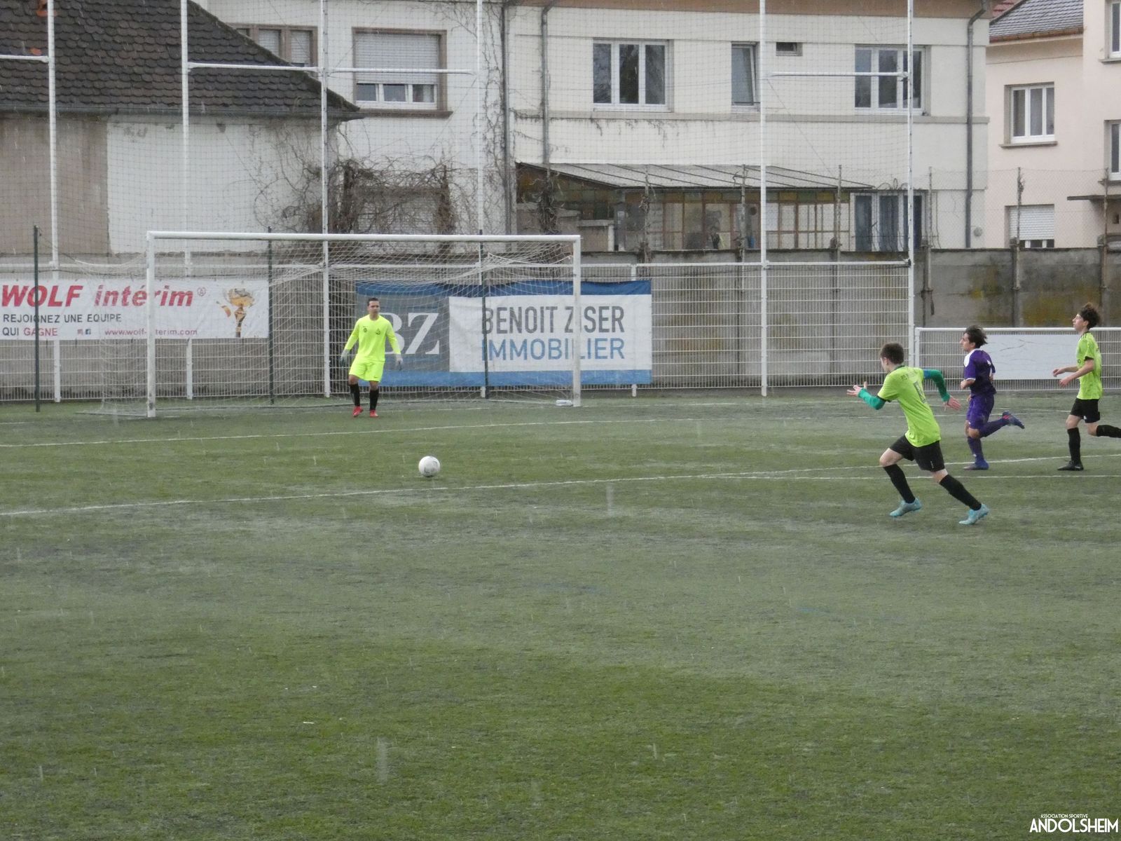 Nos « Verts » sont en place en ce début de rencontre et essaient de construire sur cette surface rapide. Mais dès la cinquième minute, ils commettent un premier impair et se font piéger par l’opportunisme des adversaires, 1-0. Les Violets jouent un jeu long et profitent de tous les contres en s’appuyant essentiellement sur leur numéro 7. Nos jeunes pousses perdent trop de ballons pour inquiéter la défense adverse. Les Violets aggravent encore le score par deux fois avec le même schéma de jeu. Notre portier, dernier et seul défenseur, perd malheureusement ses duels. Manifestement, il y a un gros trou dans la raquette de notre défense centrale. Sur un coup franc, Lucas ouvre enfin le score pour Andolsheim ! Quelques minutes plus tard, dans les mêmes conditions, il ne cadre pas pour son doublé. Dommage…