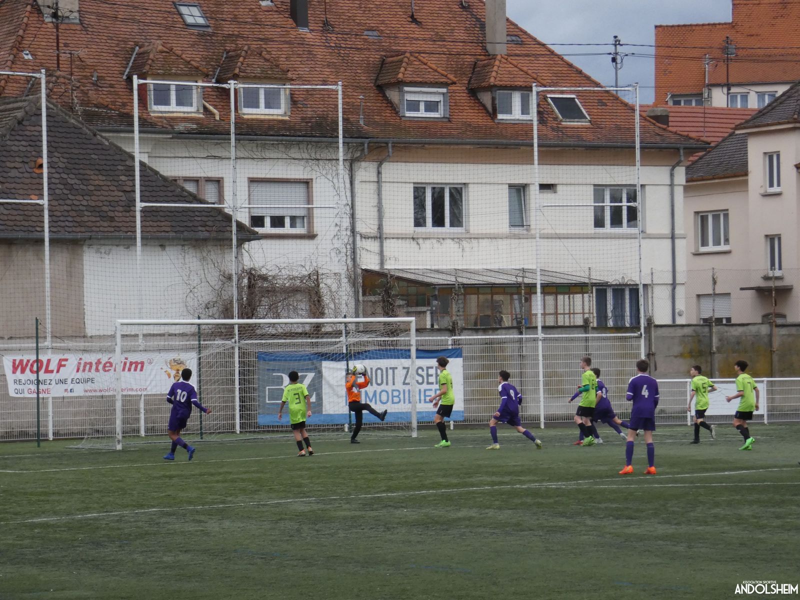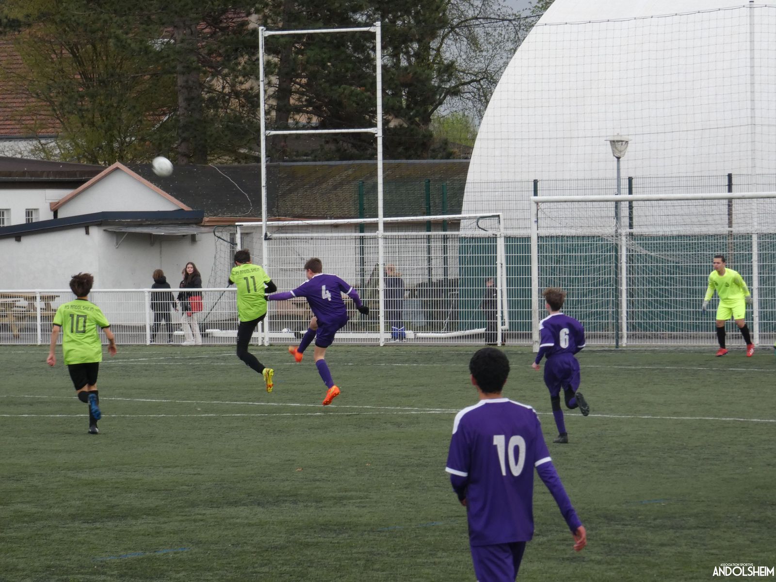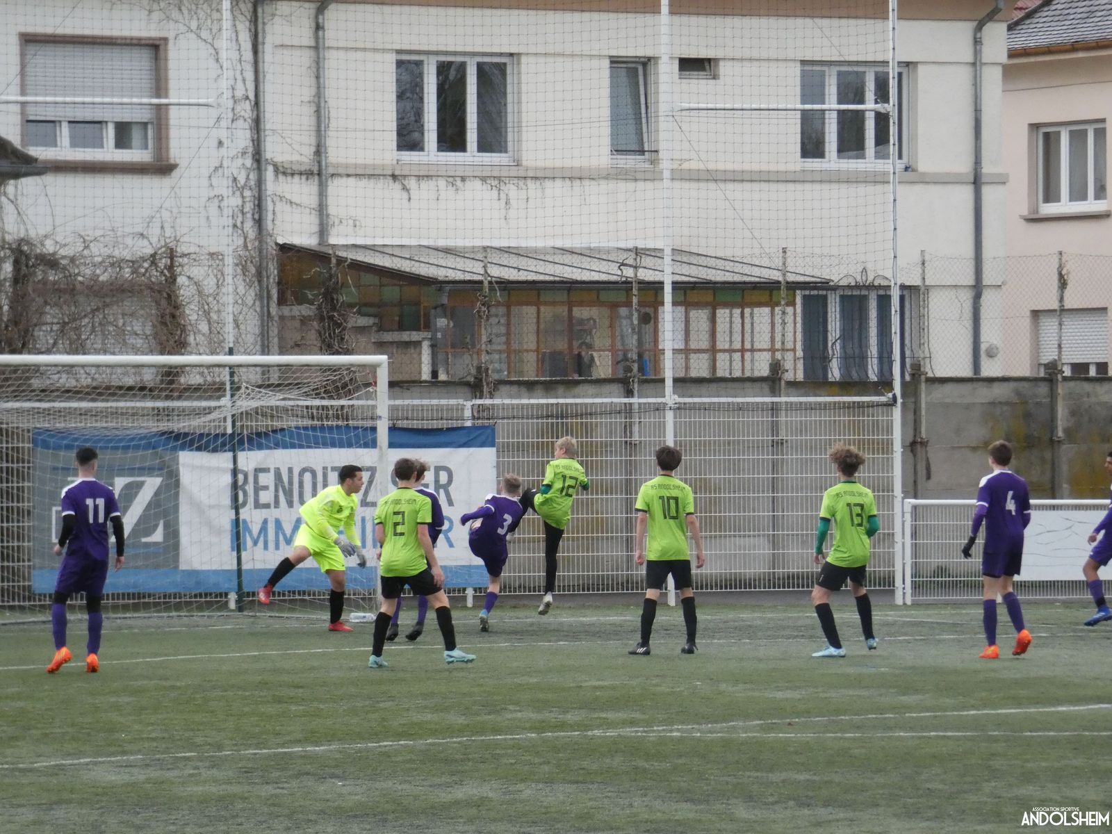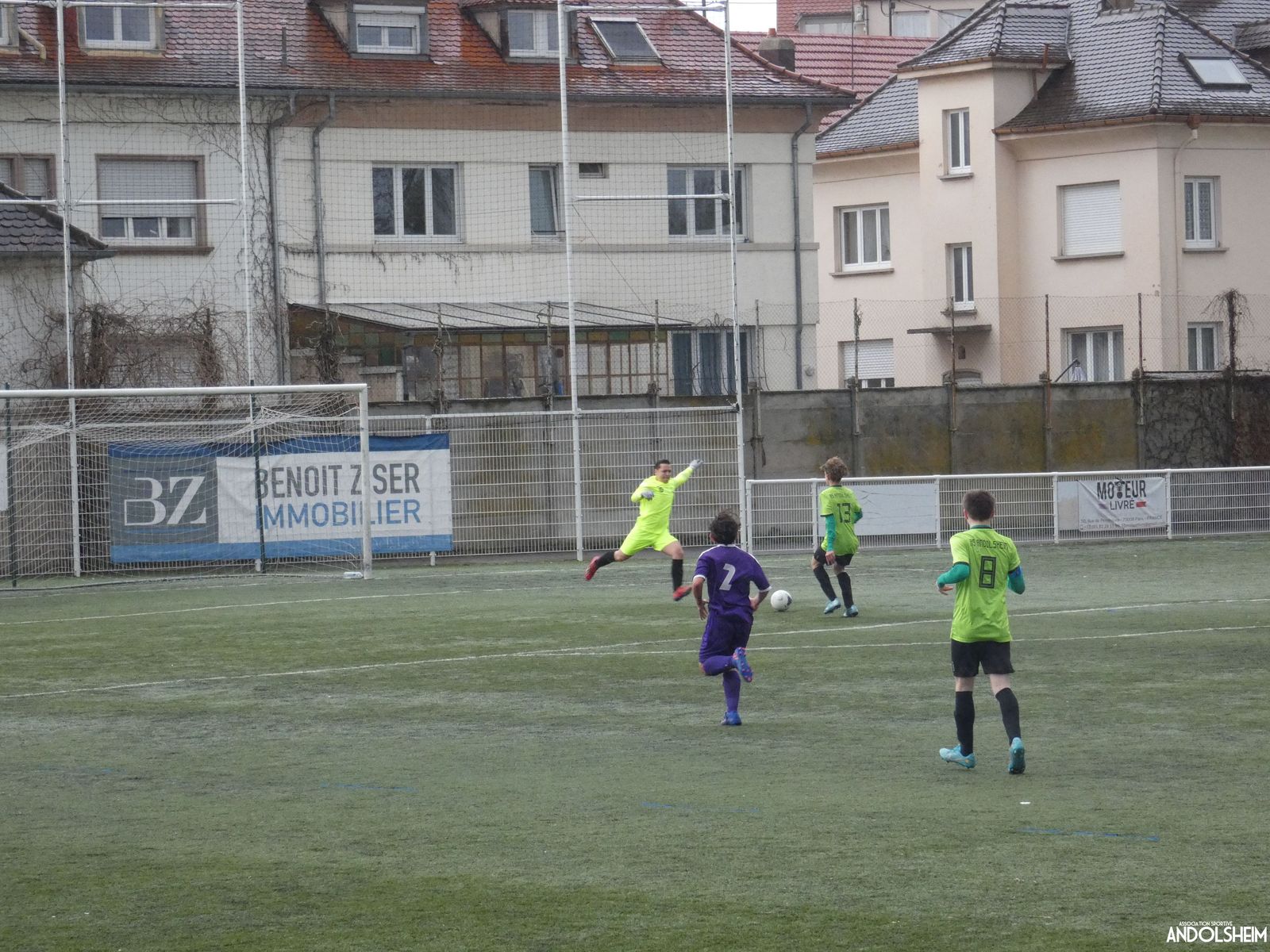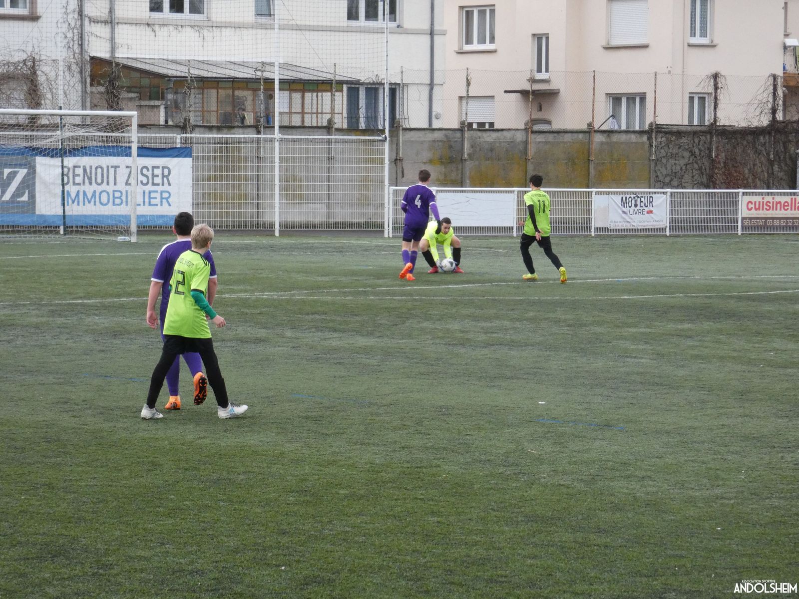 Nos « Verts » sont en place en ce début de rencontre et essaient de construire sur cette surface rapide. Mais dès la cinquième minute, ils commettent un premier impair et se font piéger par l’opportunisme des adversaires, 1-0. Les Violets jouent un jeu long et profitent de tous les contres en s’appuyant essentiellement sur leur numéro 7. Nos jeunes pousses perdent trop de ballons pour inquiéter la défense adverse. Les Violets aggravent encore le score par deux fois avec le même schéma de jeu. Notre portier, dernier et seul défenseur, perd malheureusement ses duels. Manifestement, il y a un gros trou dans la raquette de notre défense centrale. Sur un coup franc, Lucas ouvre enfin le score pour Andolsheim ! Quelques minutes plus tard, dans les mêmes conditions, il ne cadre pas pour son doublé. Dommage…