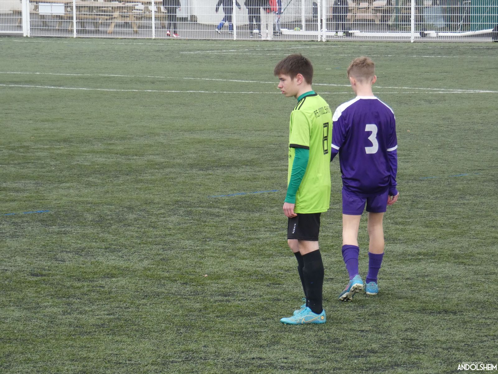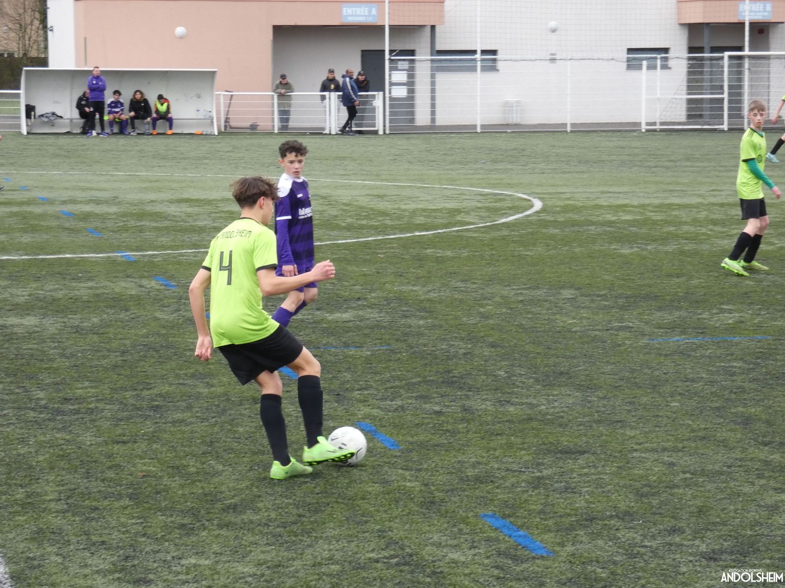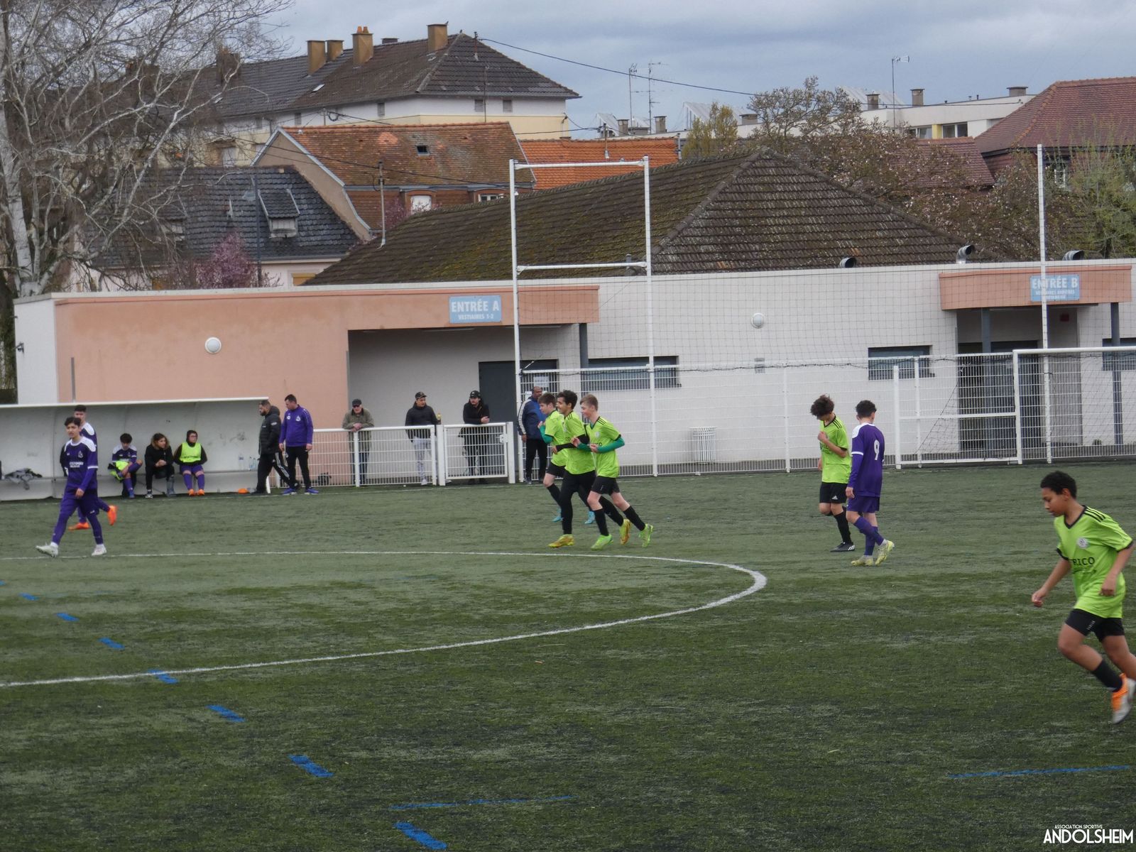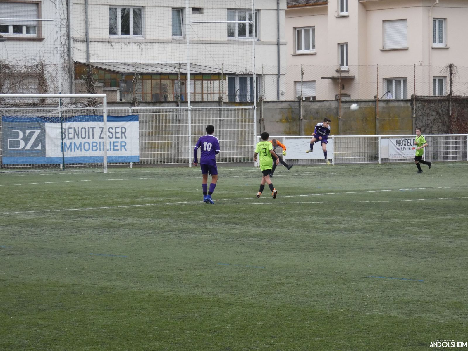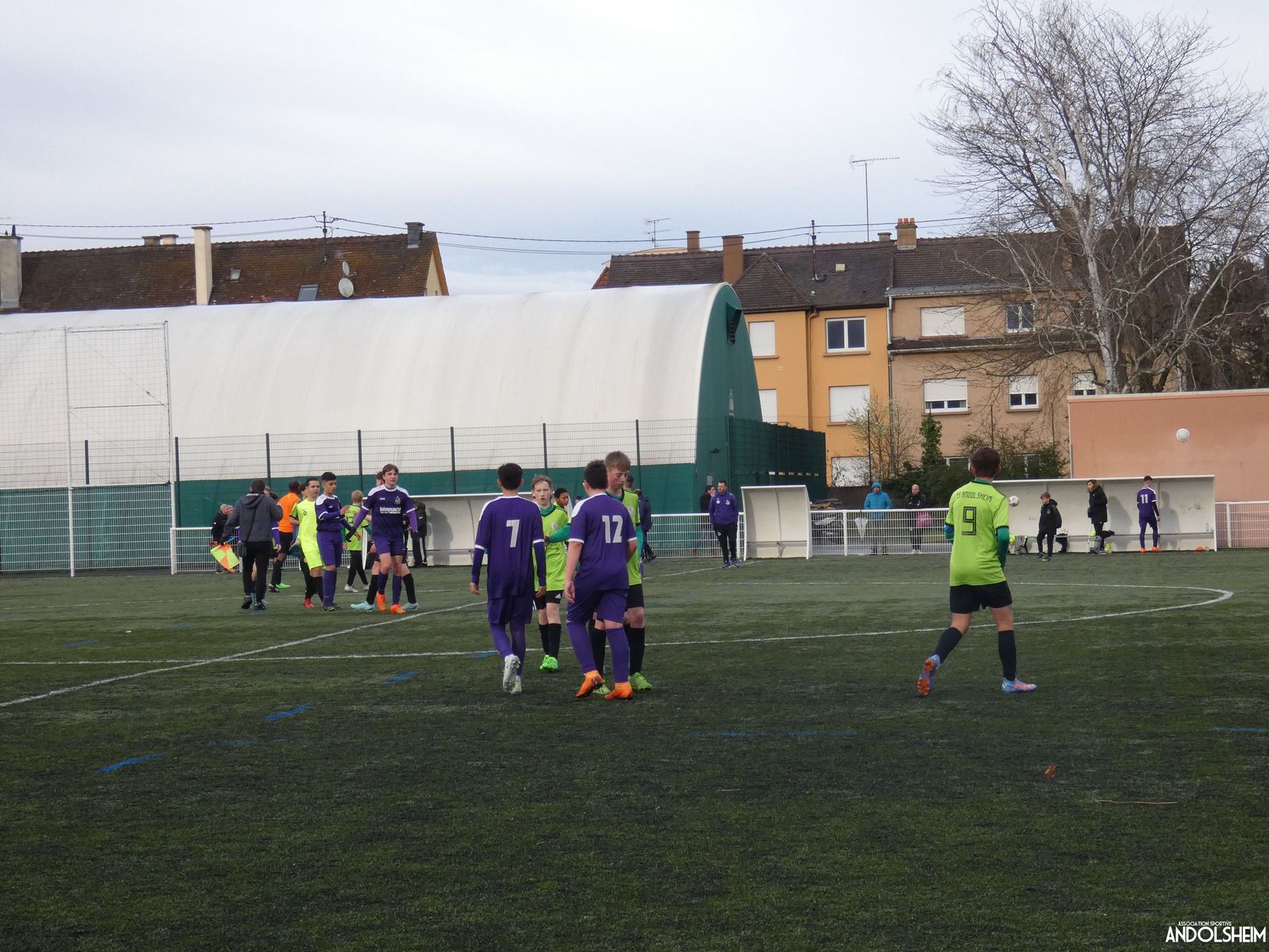Nos « Verts » sont en place en ce début de rencontre et essaient de construire sur cette surface rapide. Mais dès la cinquième minute, ils commettent un premier impair et se font piéger par l’opportunisme des adversaires, 1-0. Les Violets jouent un jeu long et profitent de tous les contres en s’appuyant essentiellement sur leur numéro 7. Nos jeunes pousses perdent trop de ballons pour inquiéter la défense adverse. Les Violets aggravent encore le score par deux fois avec le même schéma de jeu. Notre portier, dernier et seul défenseur, perd malheureusement ses duels. Manifestement, il y a un gros trou dans la raquette de notre défense centrale. Sur un coup franc, Lucas ouvre enfin le score pour Andolsheim ! Quelques minutes plus tard, dans les mêmes conditions, il ne cadre pas pour son doublé. Dommage…