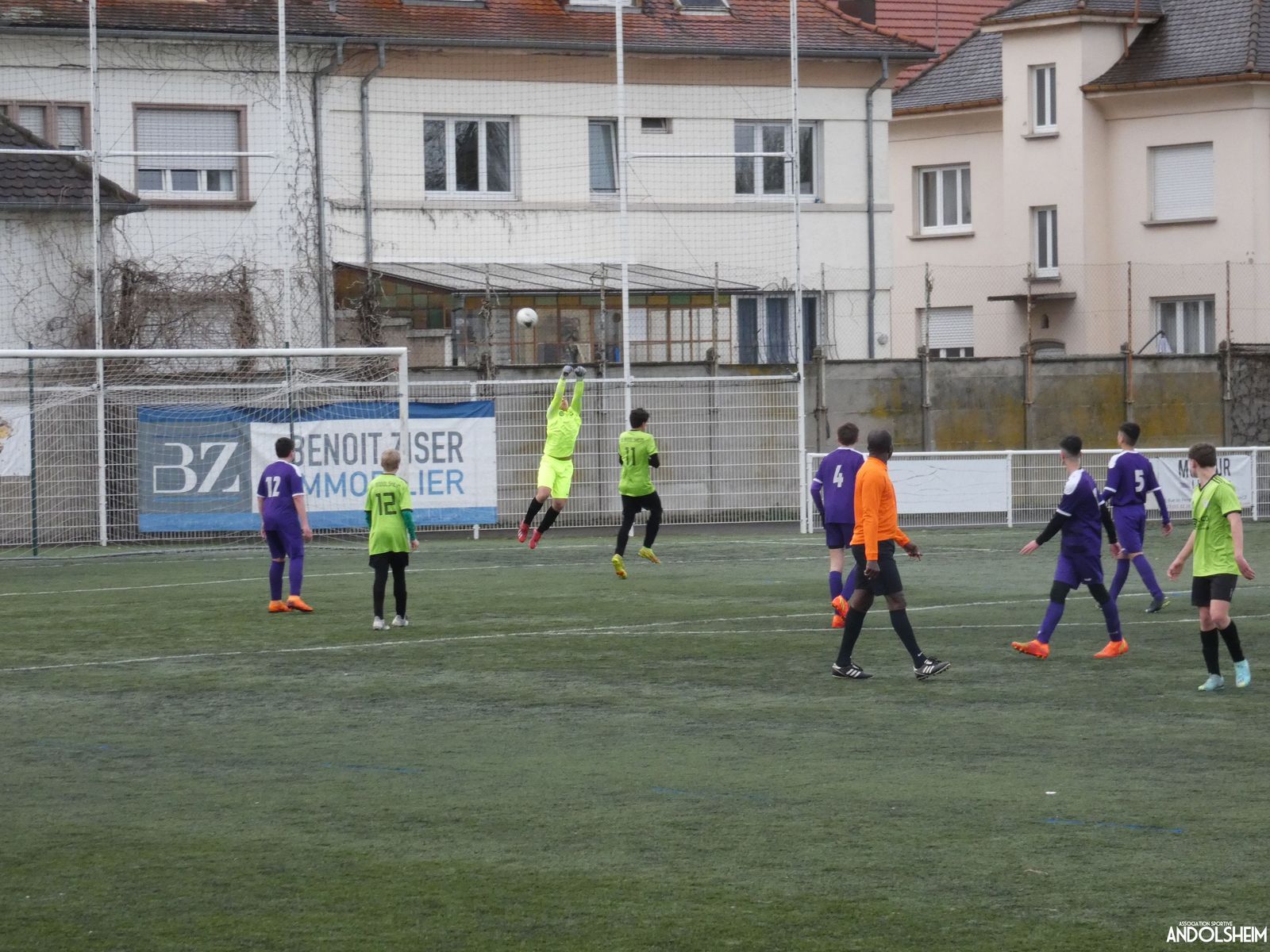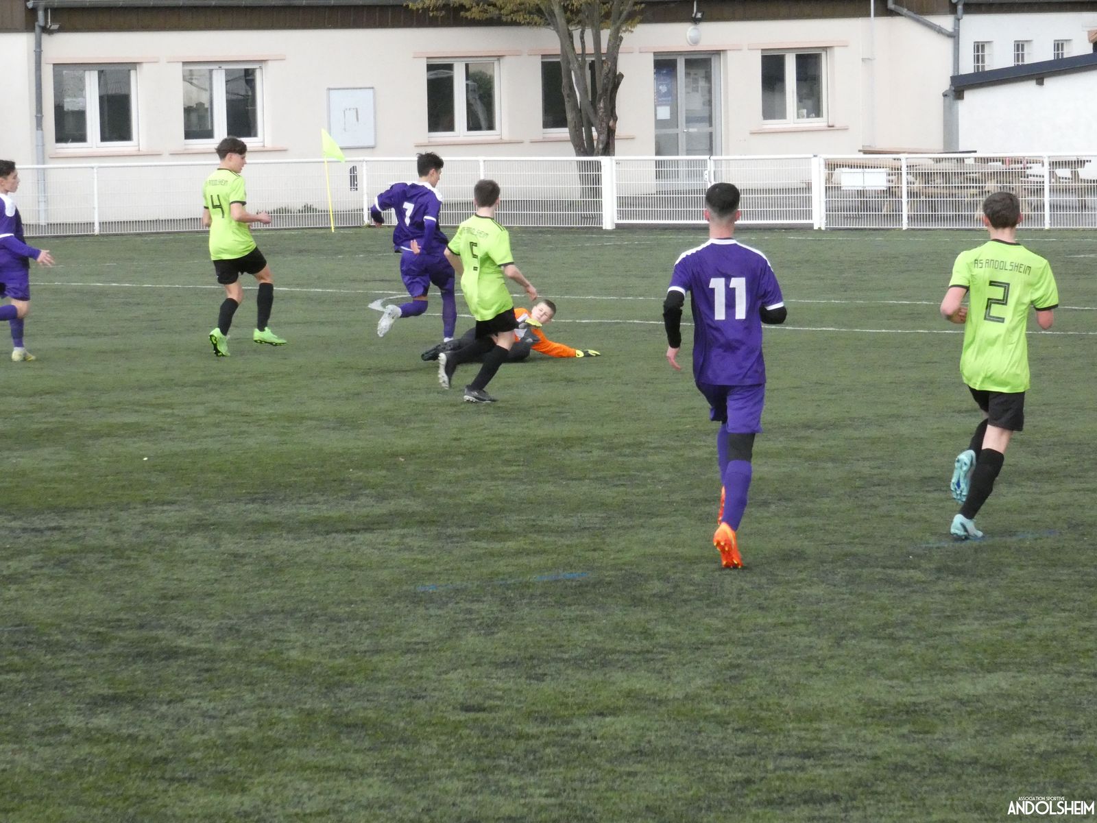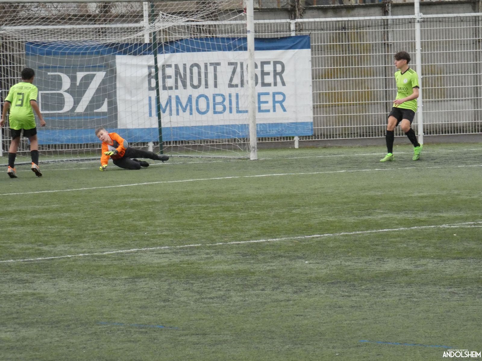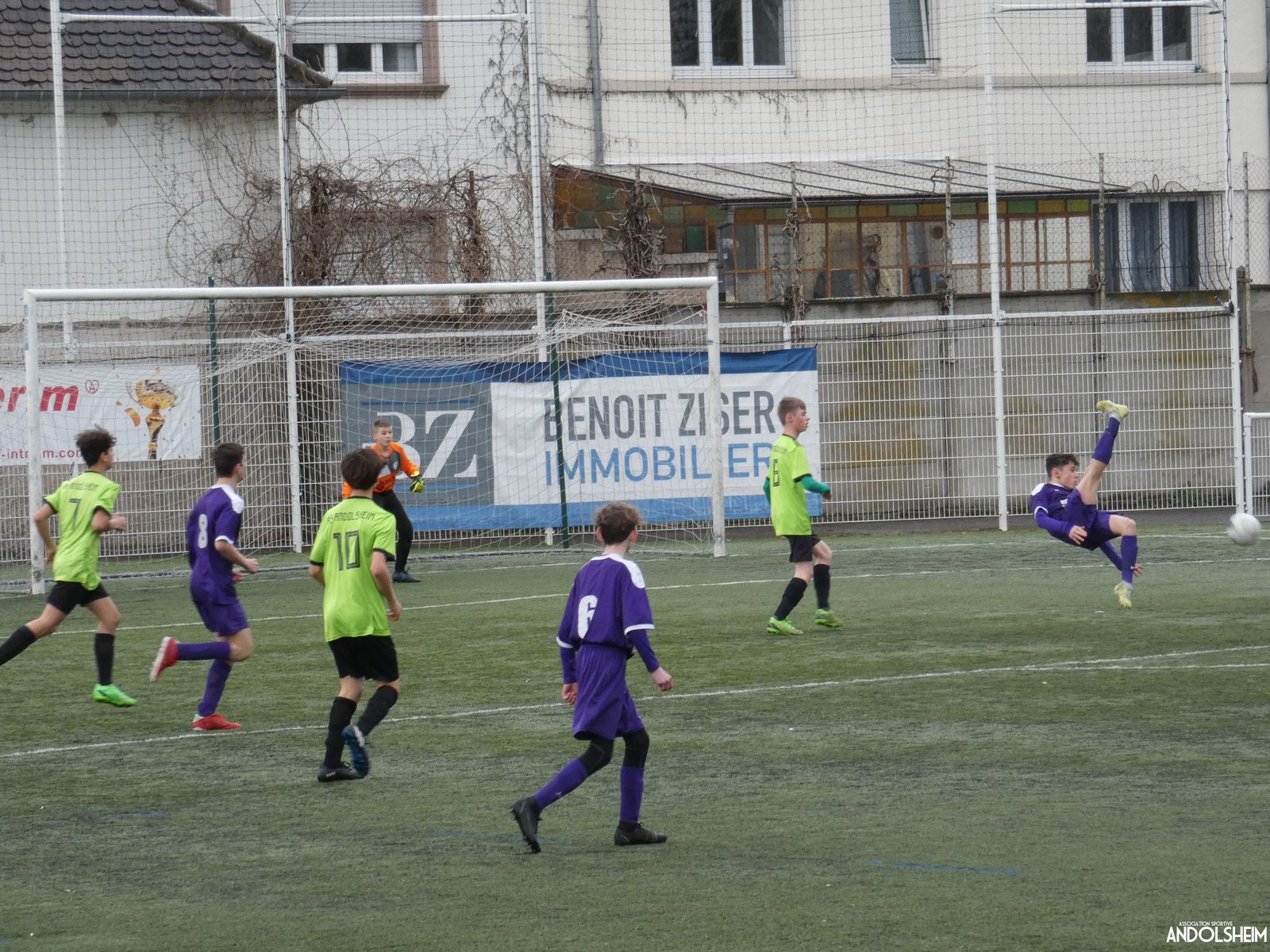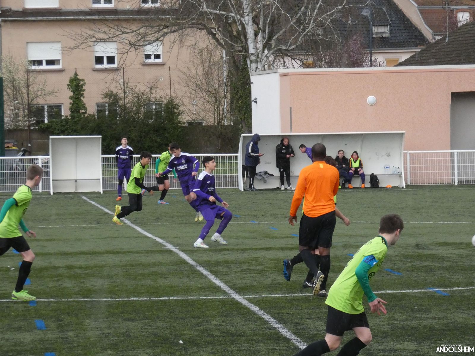 Nos « Verts » sont en place en ce début de rencontre et essaient de construire sur cette surface rapide. Mais dès la cinquième minute, ils commettent un premier impair et se font piéger par l’opportunisme des adversaires, 1-0. Les Violets jouent un jeu long et profitent de tous les contres en s’appuyant essentiellement sur leur numéro 7. Nos jeunes pousses perdent trop de ballons pour inquiéter la défense adverse. Les Violets aggravent encore le score par deux fois avec le même schéma de jeu. Notre portier, dernier et seul défenseur, perd malheureusement ses duels. Manifestement, il y a un gros trou dans la raquette de notre défense centrale. Sur un coup franc, Lucas ouvre enfin le score pour Andolsheim ! Quelques minutes plus tard, dans les mêmes conditions, il ne cadre pas pour son doublé. Dommage…