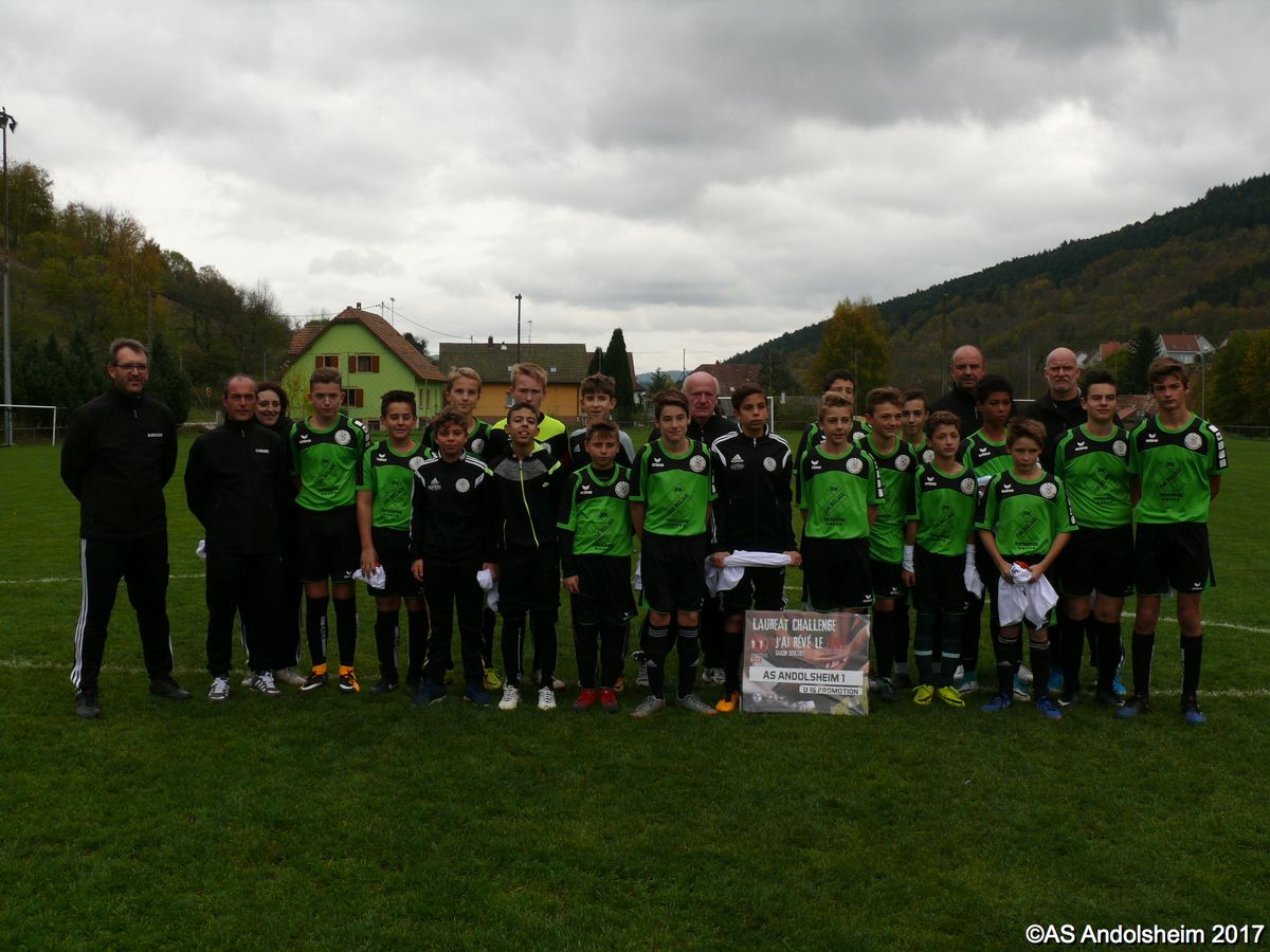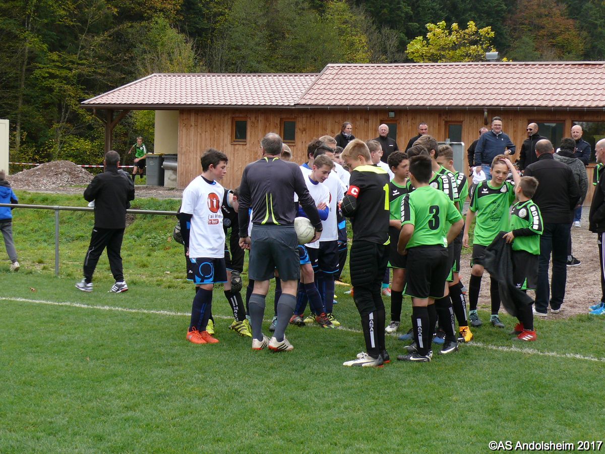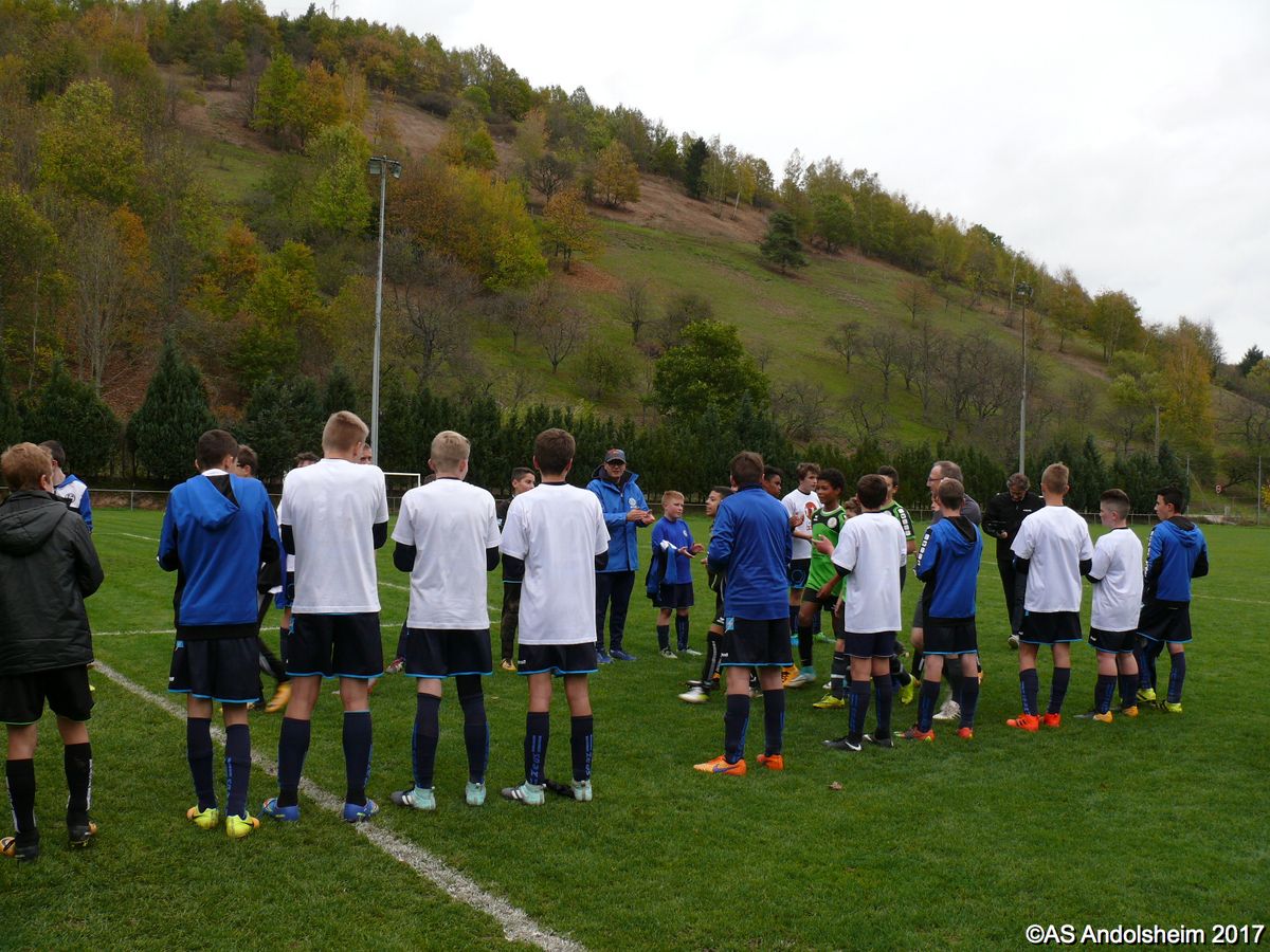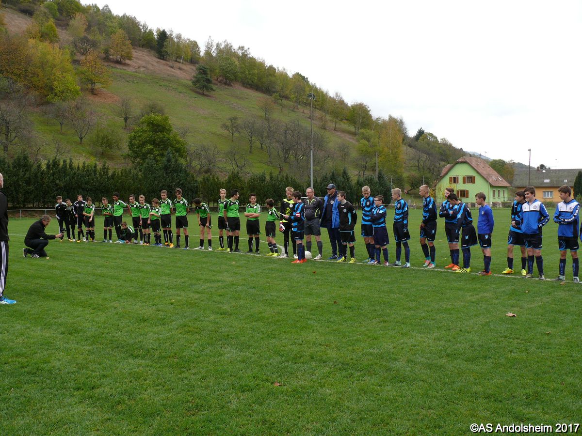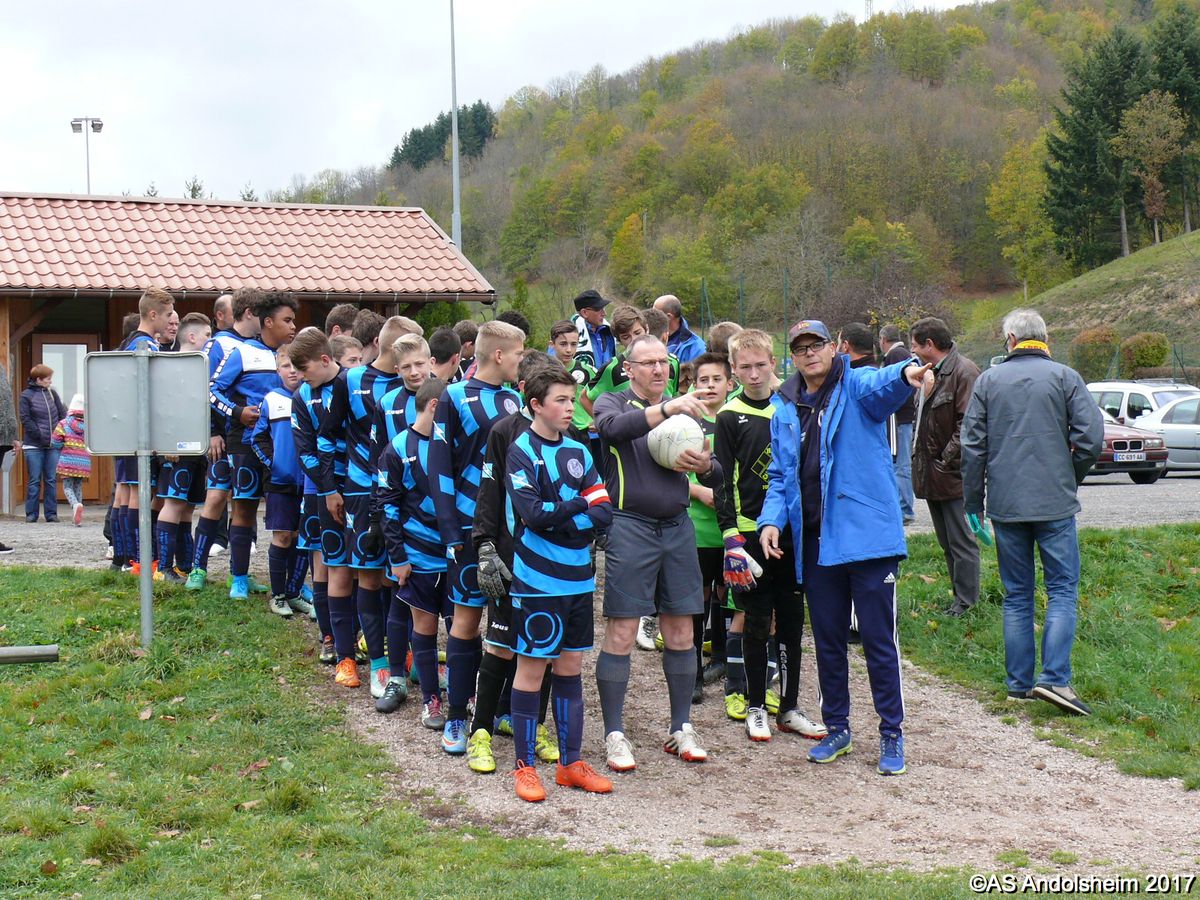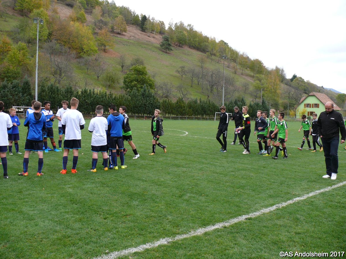 "Ce samedi 28 octobre, nos U15 ont rendu visite, pour un match amical, au SC Maisonsgoutte, au fond de la vallée de Villé. L'organisation de la rencontre est à mettre au crédit des coachs des 2 clubs qui ont fait connaissance lors de la remise des Trophées du Fair-Play au musée Würth à Erstein le 24 septembre dernier. L'idée était de faire se rencontrer les 2 lauréats départementaux saison 2016-2017 du Challenge U15 "J'ai Rêvé le Foot". L'initiative de ce match était soutenue par le District d'Alsace. Son Président en personne, Mr. René Marbach, s'est déplacé pour y assister. Il était accompagné du Président de l'AS Mundolsheim, club à l'origine du protocole "Haie d'Honneur" en Promotion 67 en début de saison et que le District aimerait généraliser.