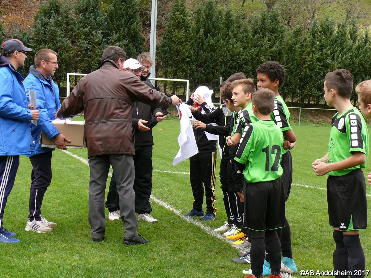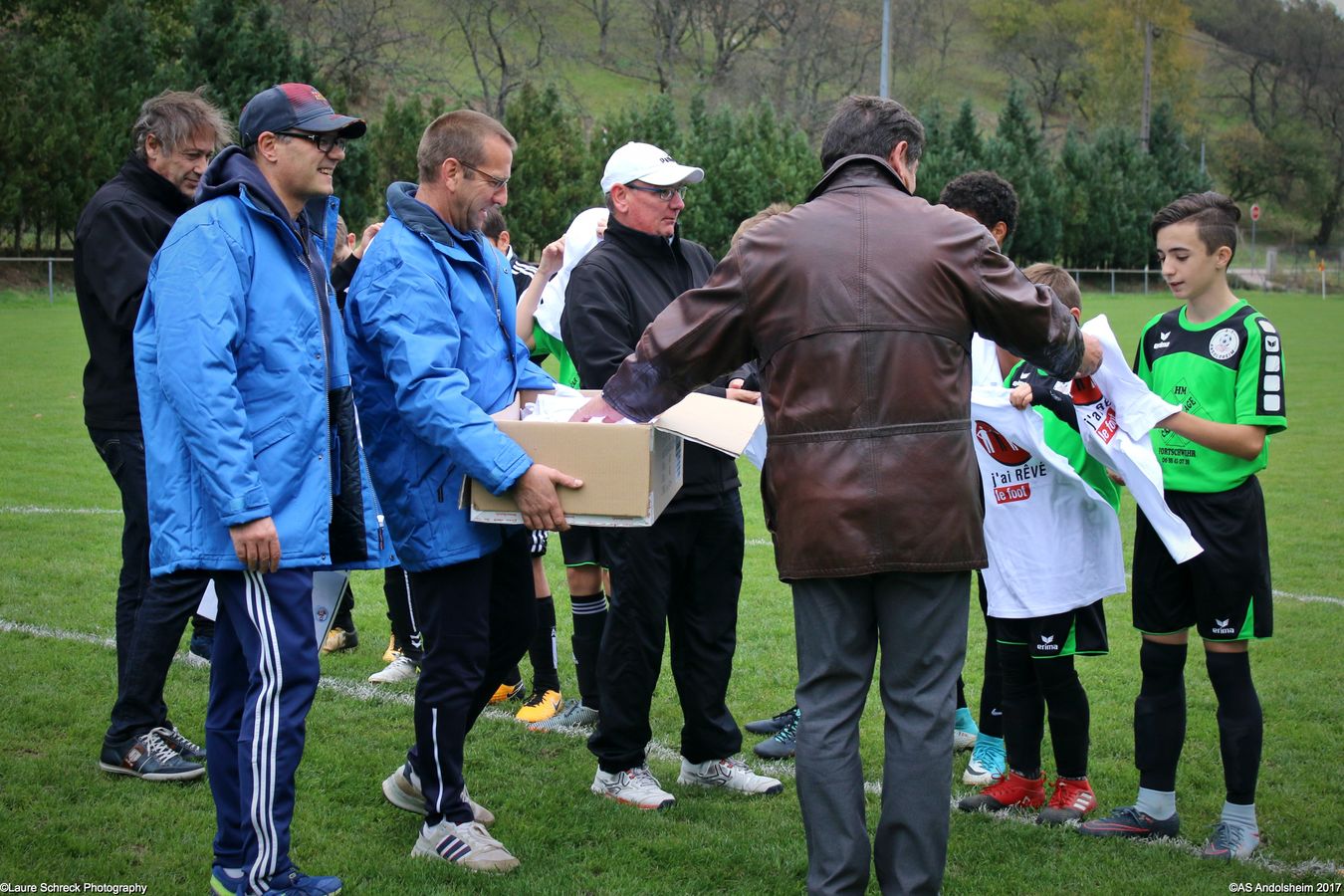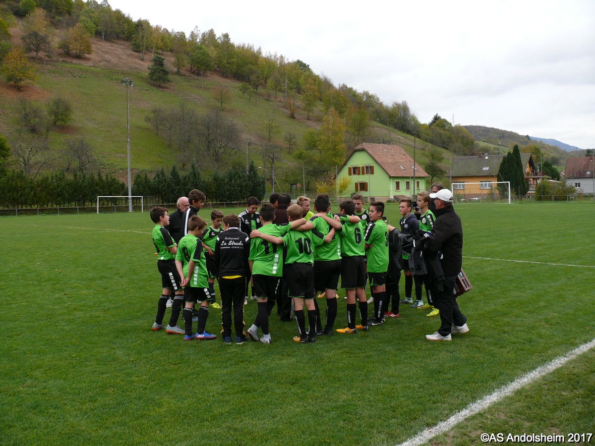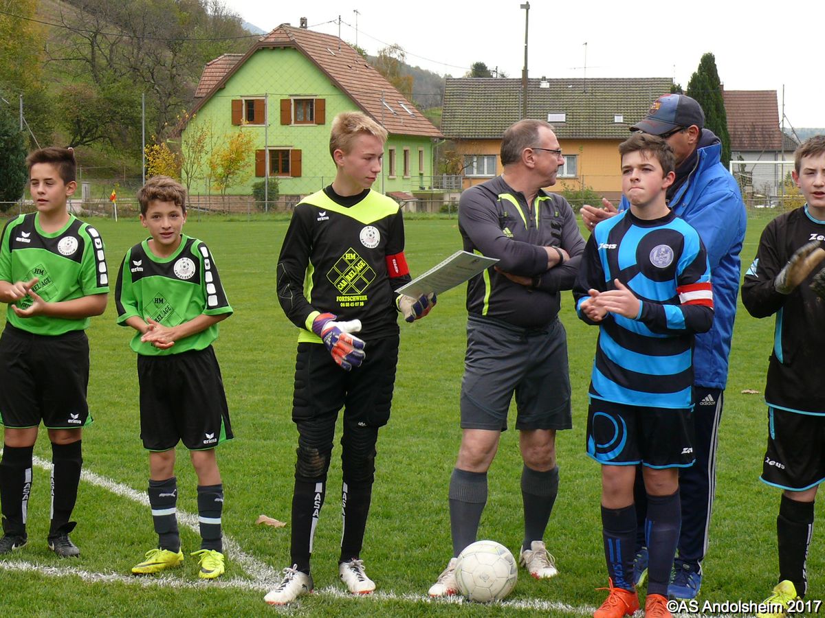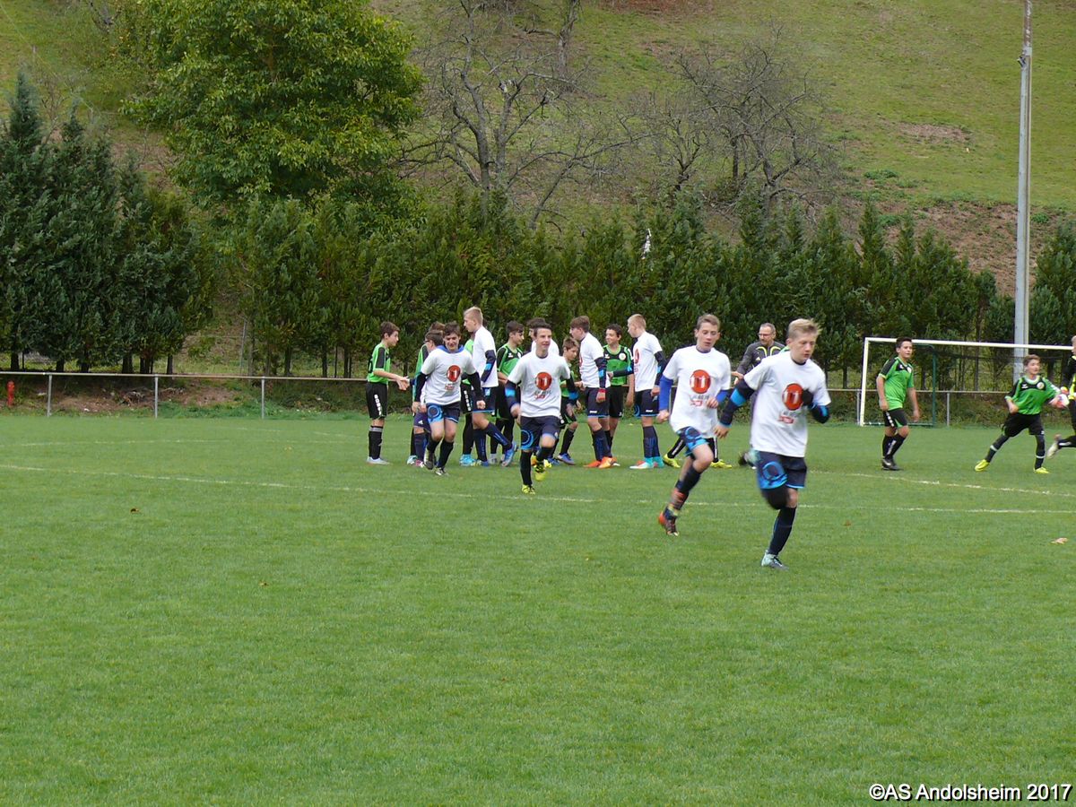 "Ce samedi 28 octobre, nos U15 ont rendu visite, pour un match amical, au SC Maisonsgoutte, au fond de la vallée de Villé. L'organisation de la rencontre est à mettre au crédit des coachs des 2 clubs qui ont fait connaissance lors de la remise des Trophées du Fair-Play au musée Würth à Erstein le 24 septembre dernier. L'idée était de faire se rencontrer les 2 lauréats départementaux saison 2016-2017 du Challenge U15 "J'ai Rêvé le Foot". L'initiative de ce match était soutenue par le District d'Alsace. Son Président en personne, Mr. René Marbach, s'est déplacé pour y assister. Il était accompagné du Président de l'AS Mundolsheim, club à l'origine du protocole "Haie d'Honneur" en Promotion 67 en début de saison et que le District aimerait généraliser.