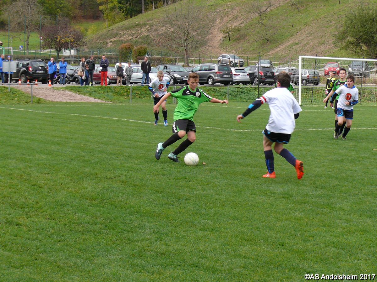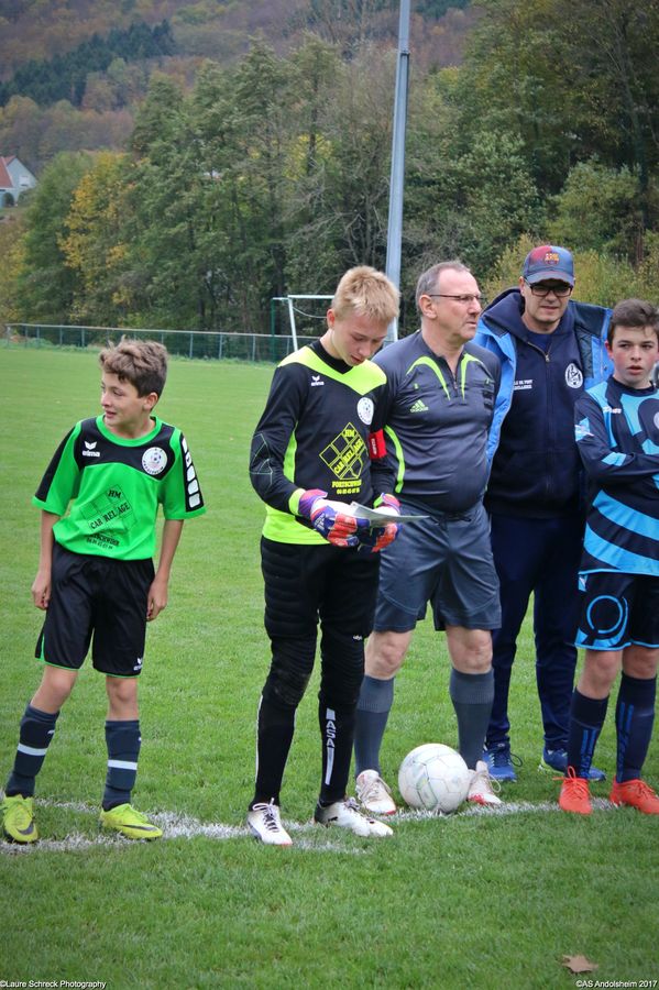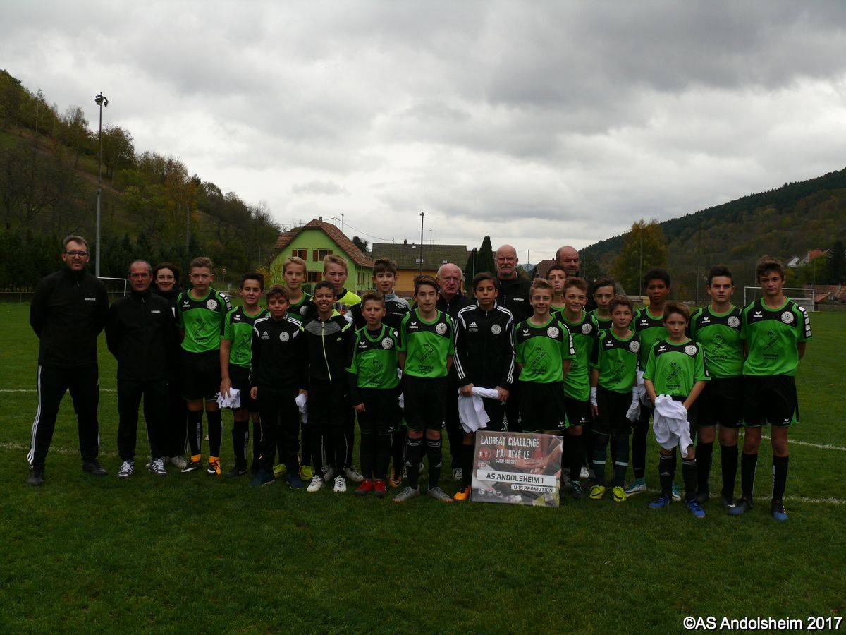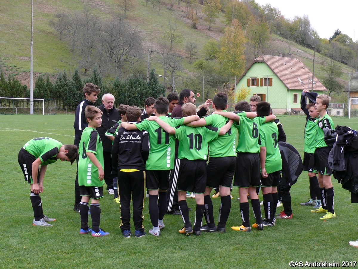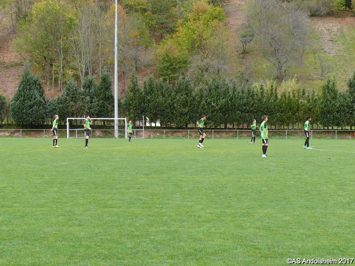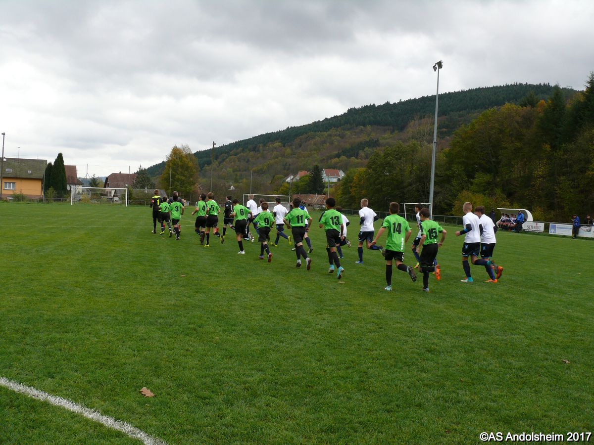 "Ce samedi 28 octobre, nos U15 ont rendu visite, pour un match amical, au SC Maisonsgoutte, au fond de la vallée de Villé. L'organisation de la rencontre est à mettre au crédit des coachs des 2 clubs qui ont fait connaissance lors de la remise des Trophées du Fair-Play au musée Würth à Erstein le 24 septembre dernier. L'idée était de faire se rencontrer les 2 lauréats départementaux saison 2016-2017 du Challenge U15 "J'ai Rêvé le Foot". L'initiative de ce match était soutenue par le District d'Alsace. Son Président en personne, Mr. René Marbach, s'est déplacé pour y assister. Il était accompagné du Président de l'AS Mundolsheim, club à l'origine du protocole "Haie d'Honneur" en Promotion 67 en début de saison et que le District aimerait généraliser.