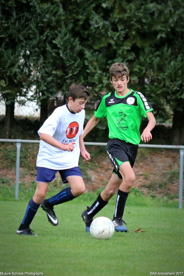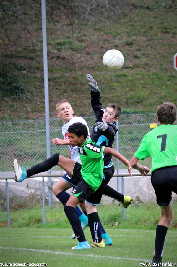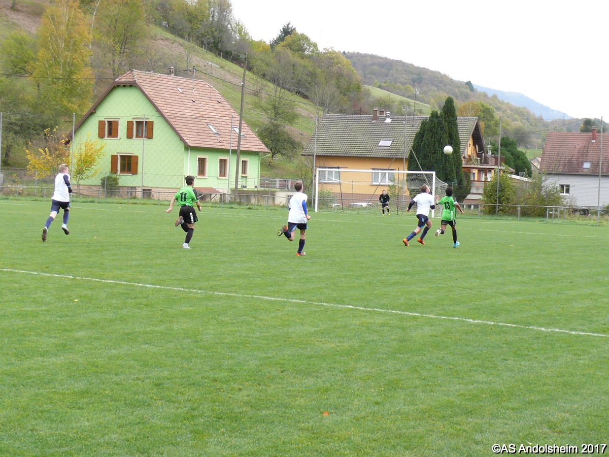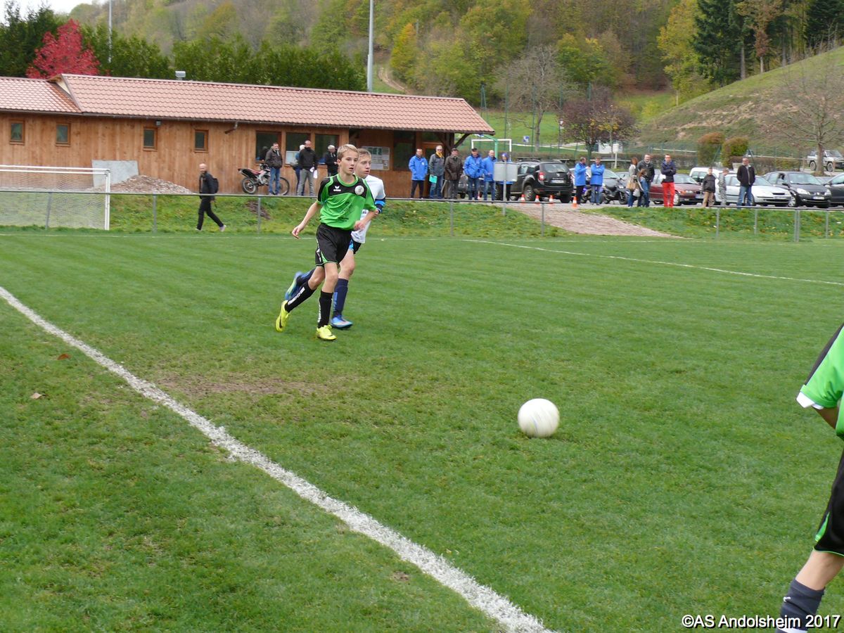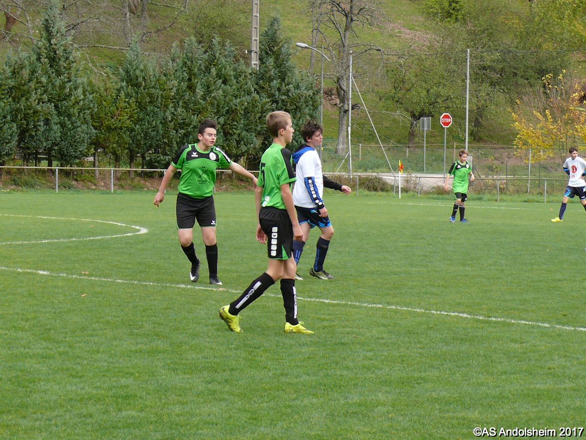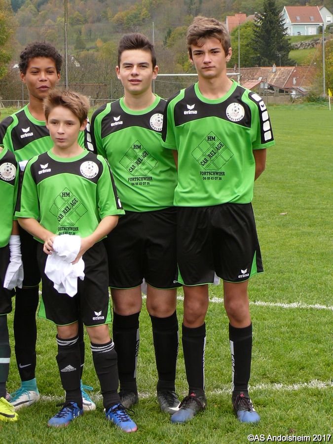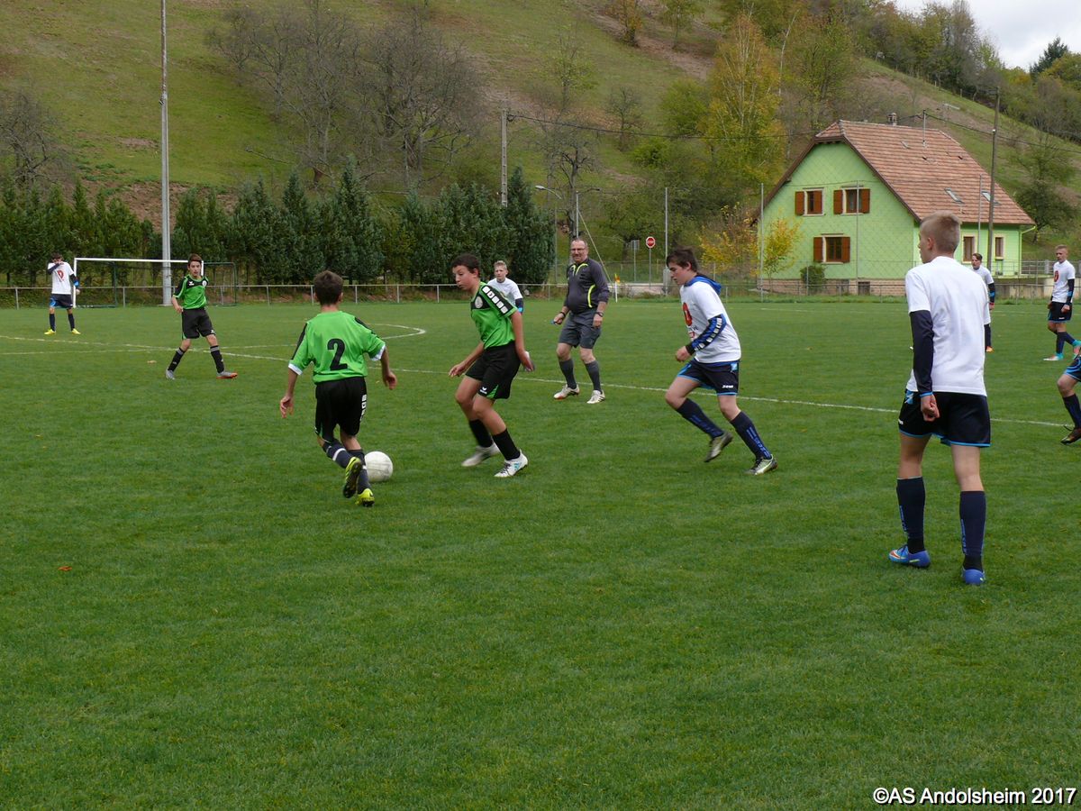 "Ce samedi 28 octobre, nos U15 ont rendu visite, pour un match amical, au SC Maisonsgoutte, au fond de la vallée de Villé. L'organisation de la rencontre est à mettre au crédit des coachs des 2 clubs qui ont fait connaissance lors de la remise des Trophées du Fair-Play au musée Würth à Erstein le 24 septembre dernier. L'idée était de faire se rencontrer les 2 lauréats départementaux saison 2016-2017 du Challenge U15 "J'ai Rêvé le Foot". L'initiative de ce match était soutenue par le District d'Alsace. Son Président en personne, Mr. René Marbach, s'est déplacé pour y assister. Il était accompagné du Président de l'AS Mundolsheim, club à l'origine du protocole "Haie d'Honneur" en Promotion 67 en début de saison et que le District aimerait généraliser.