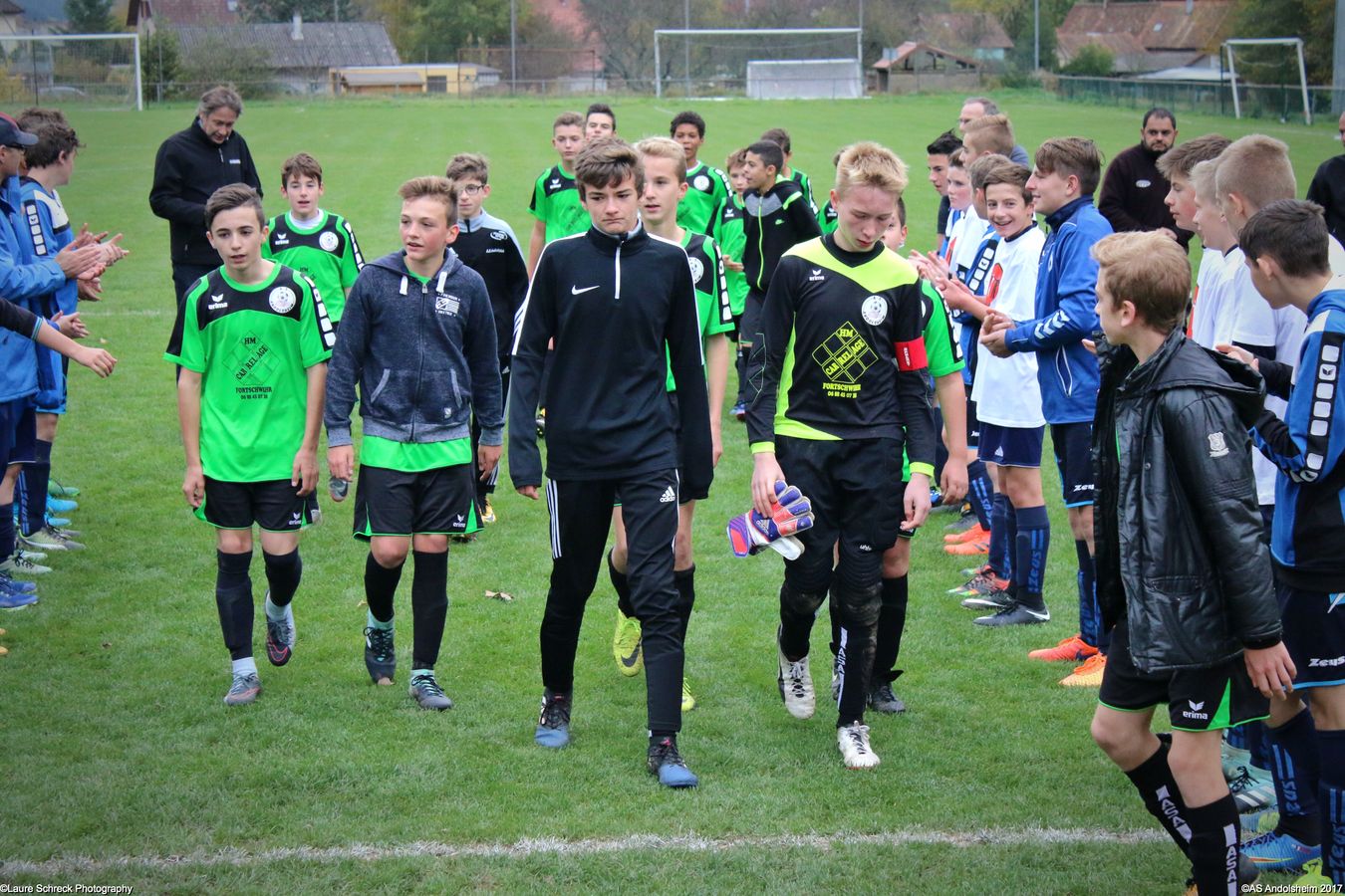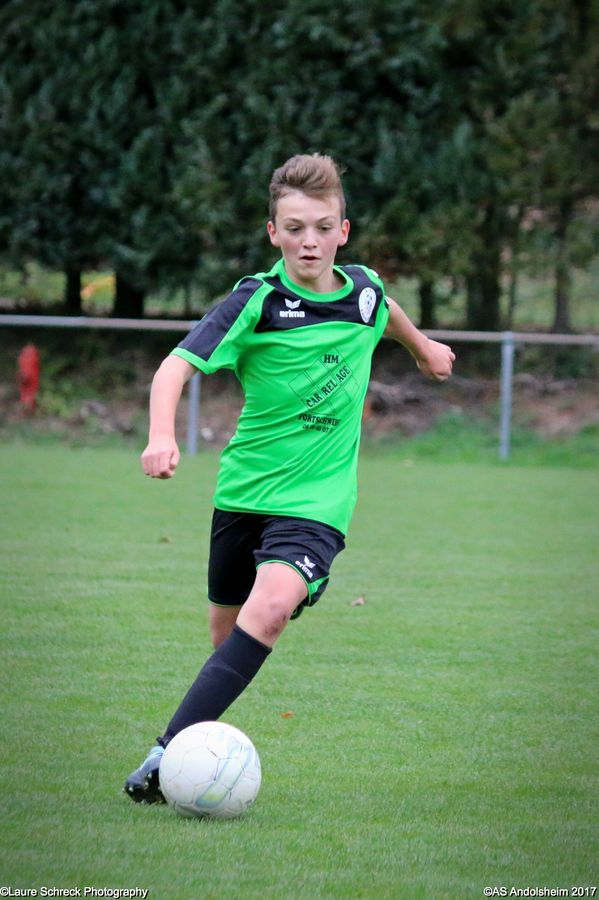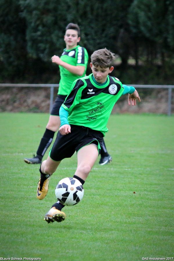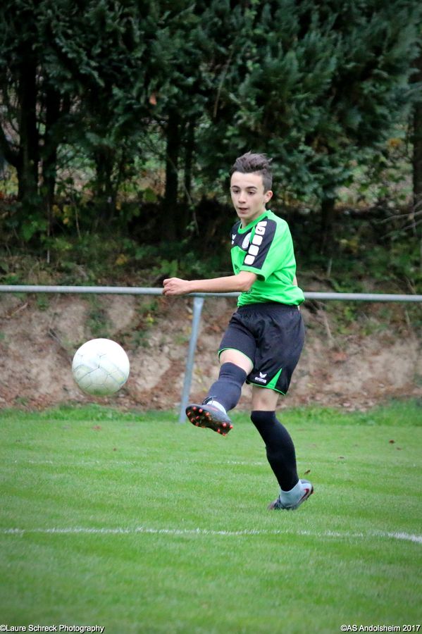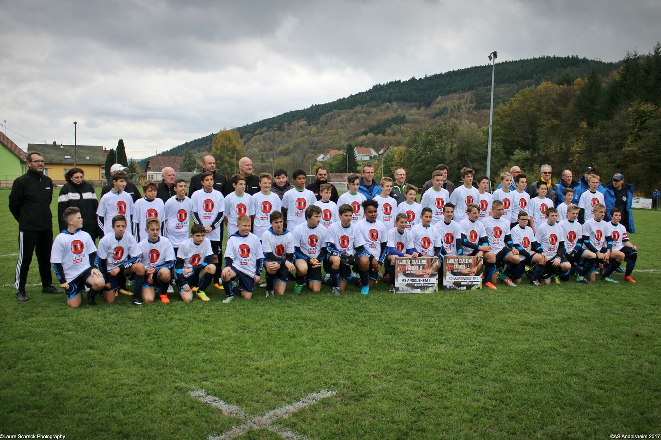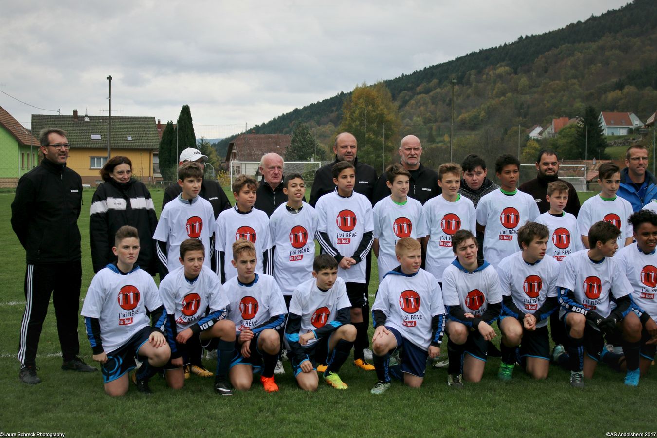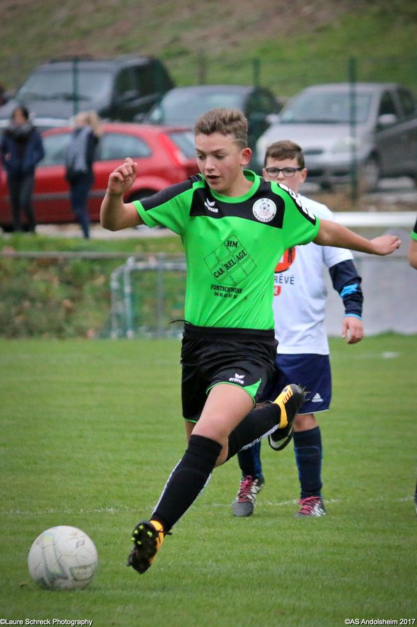 "Ce samedi 28 octobre, nos U15 ont rendu visite, pour un match amical, au SC Maisonsgoutte, au fond de la vallée de Villé. L'organisation de la rencontre est à mettre au crédit des coachs des 2 clubs qui ont fait connaissance lors de la remise des Trophées du Fair-Play au musée Würth à Erstein le 24 septembre dernier. L'idée était de faire se rencontrer les 2 lauréats départementaux saison 2016-2017 du Challenge U15 "J'ai Rêvé le Foot". L'initiative de ce match était soutenue par le District d'Alsace. Son Président en personne, Mr. René Marbach, s'est déplacé pour y assister. Il était accompagné du Président de l'AS Mundolsheim, club à l'origine du protocole "Haie d'Honneur" en Promotion 67 en début de saison et que le District aimerait généraliser.