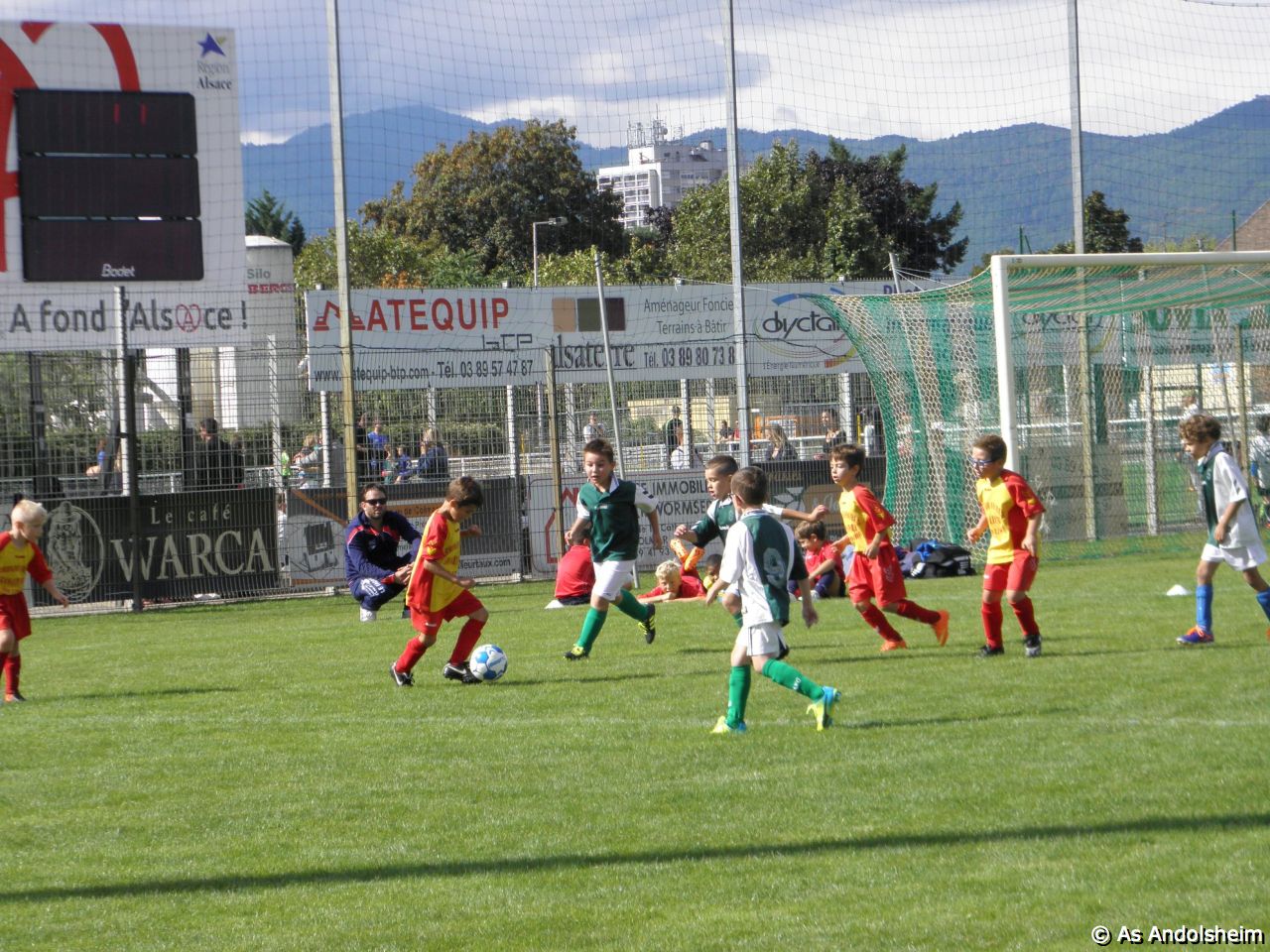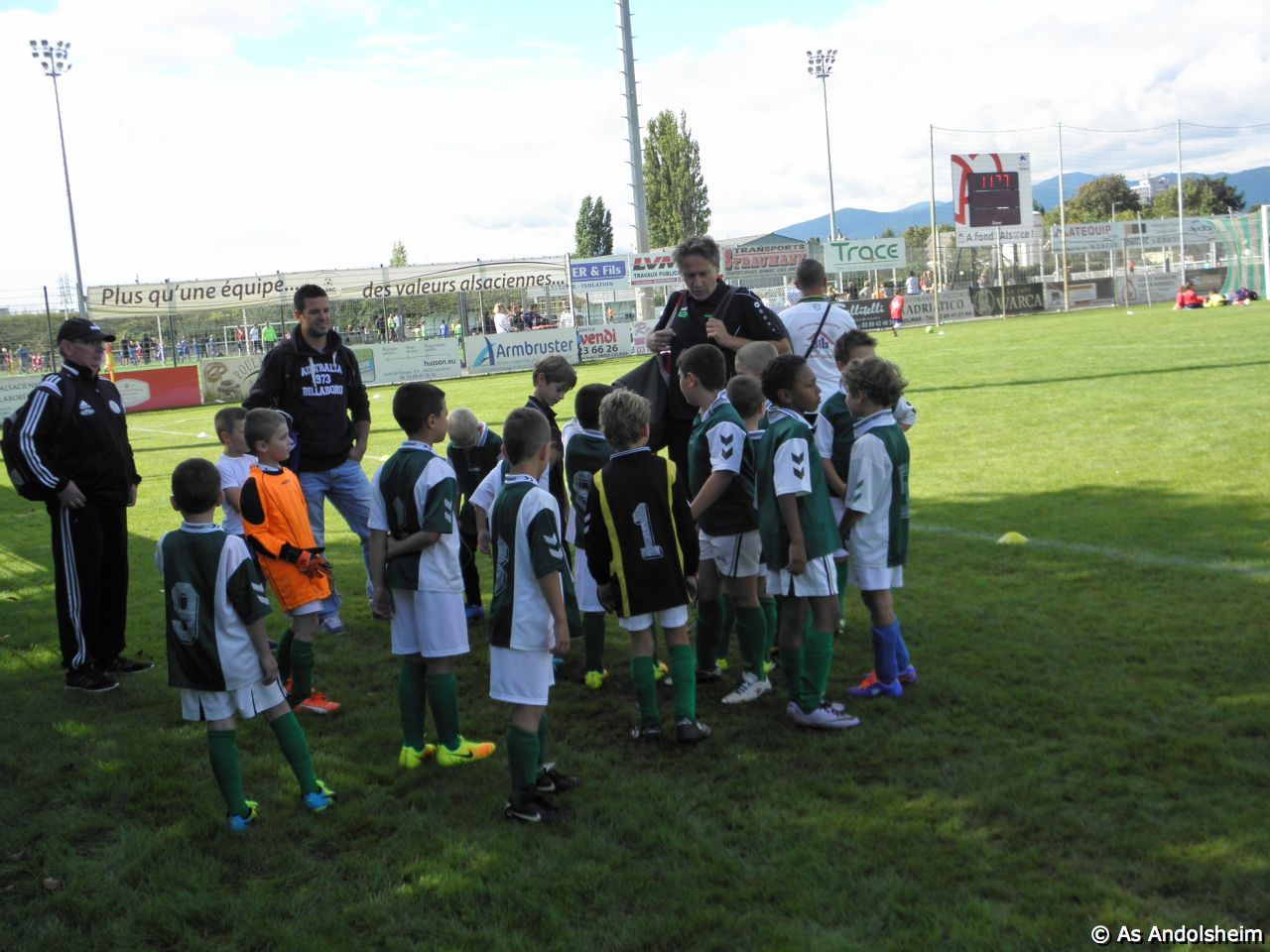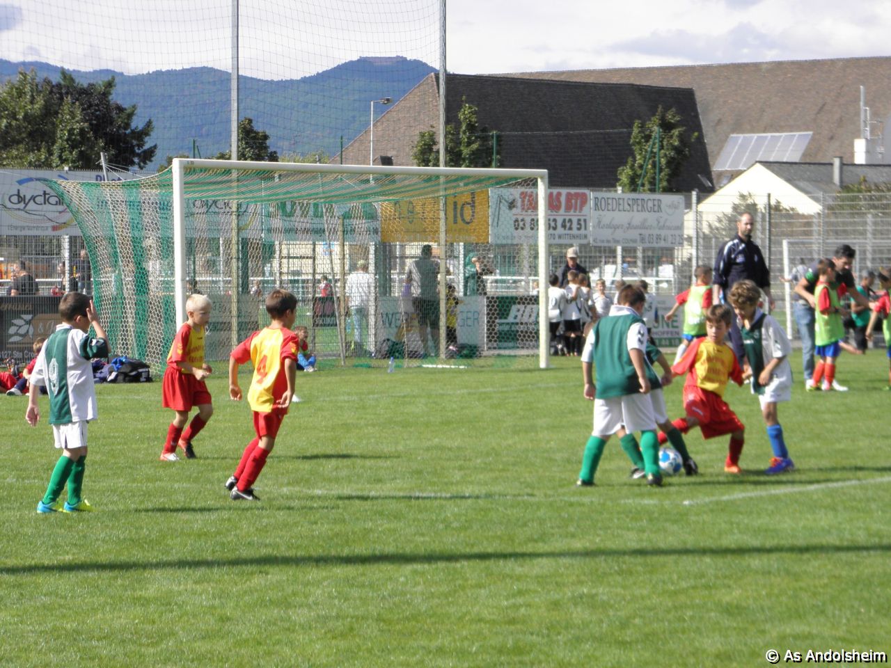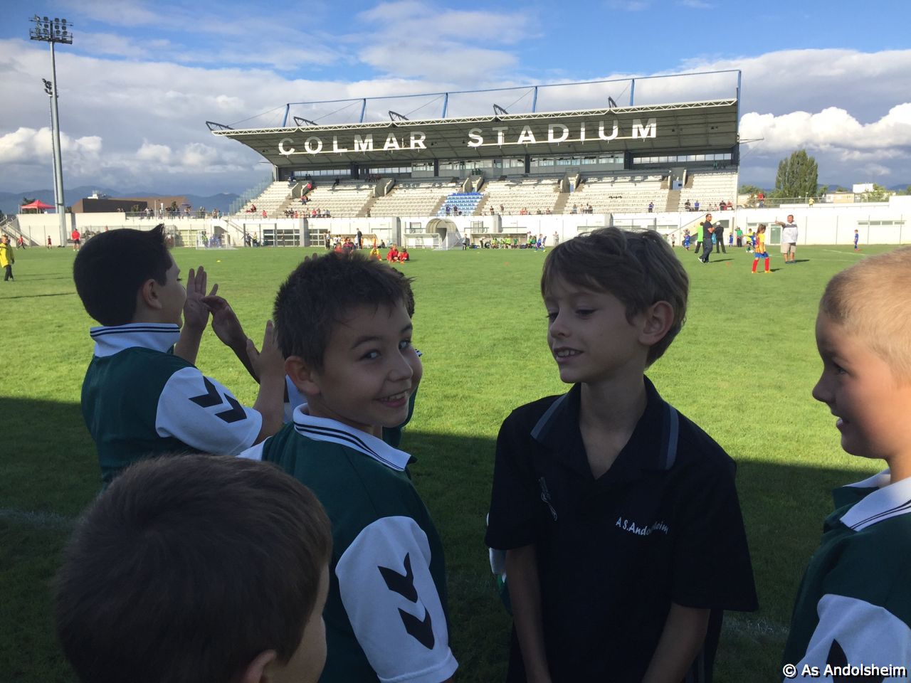 pour le coup d'envoi de la saison, lors de ce tournoi de rentrée qui réunissait environ une quarantaine d'équipes du secteur dont deux équipes de l'As Andolsheim avec pour les plus jeunes la découverte d'un premier match de football .. félicitons la parfaite organisation des Src ... 8 terrains dont 4 sur le terrain d'honneur aménagés avec des vrais buts aux normes et le plaisir de pouvoir faire trembler les filets (L'Asa avait pour l'occasion prêté quatre de ces buts aux Src ) ... ça y est la saison est lancé pour les jeunes pousses de l'Asa.