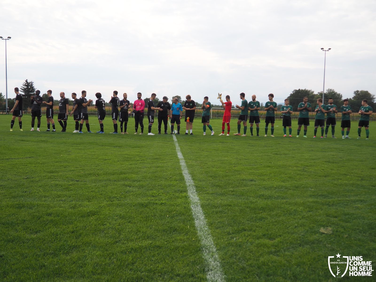 Bref, la rencontre débute à 16H02, et les visiteurs mènent déjà 0 – 2 à 16H16….Fort heureusement, Gabin réussit un magnifique coup de pied arrêté et l’AS ANDOLSHEIM n’a plus que un but de retard à la 19 -ème minute : tout est possible !... C’est oublier que, dans le monde du football, tout est possible mais aussi le contraire de tout…L’arbitre refuse une égalisation de l’ASA pour hors-jeu. Soit, ça peut arriver. Mais cette annulation intervient après une premiere validation, et après de très longues minutes d’hésitation. Ce long flottement, puis cette annulation, crée une tension qui perdurera tout le match.