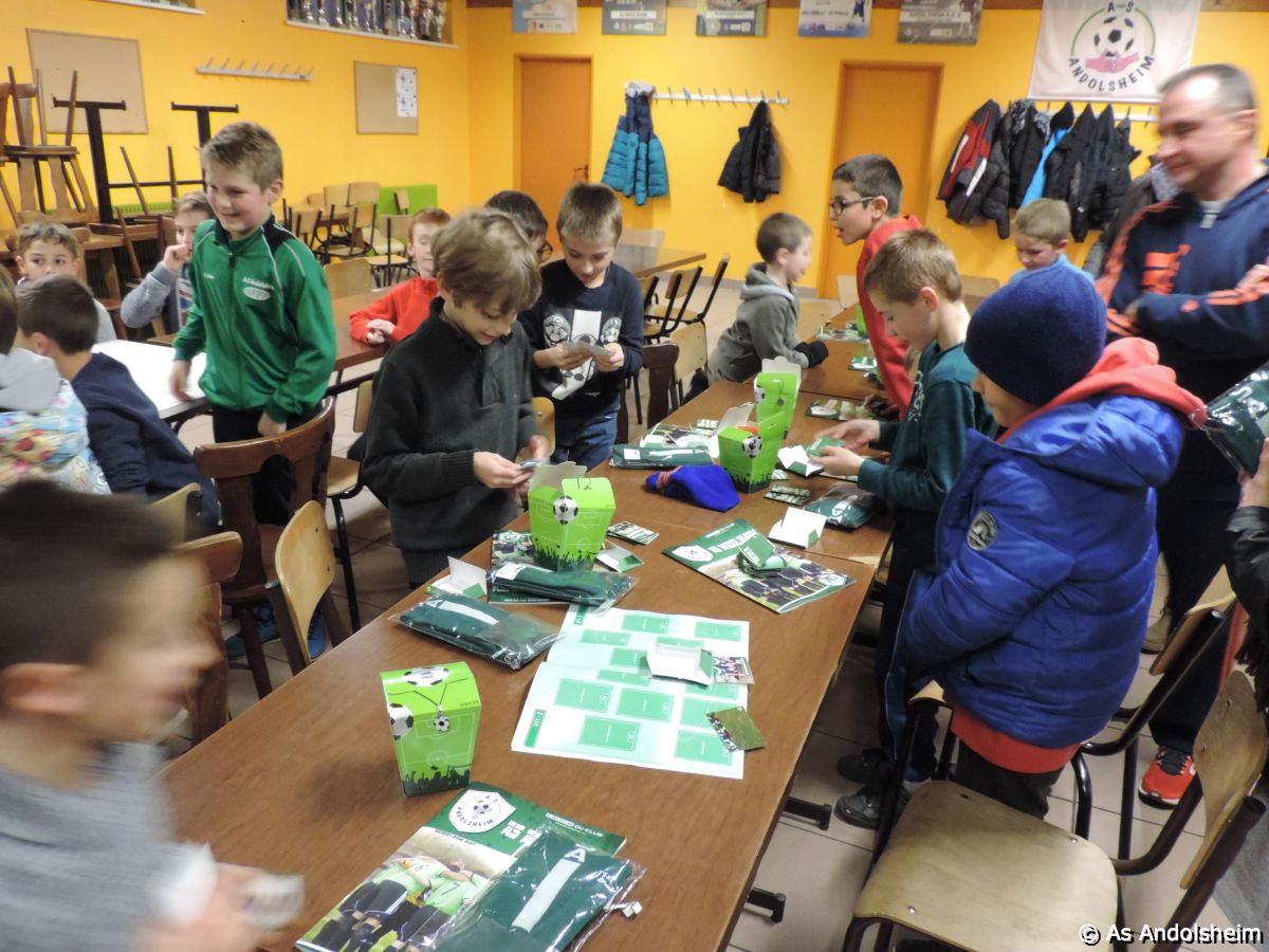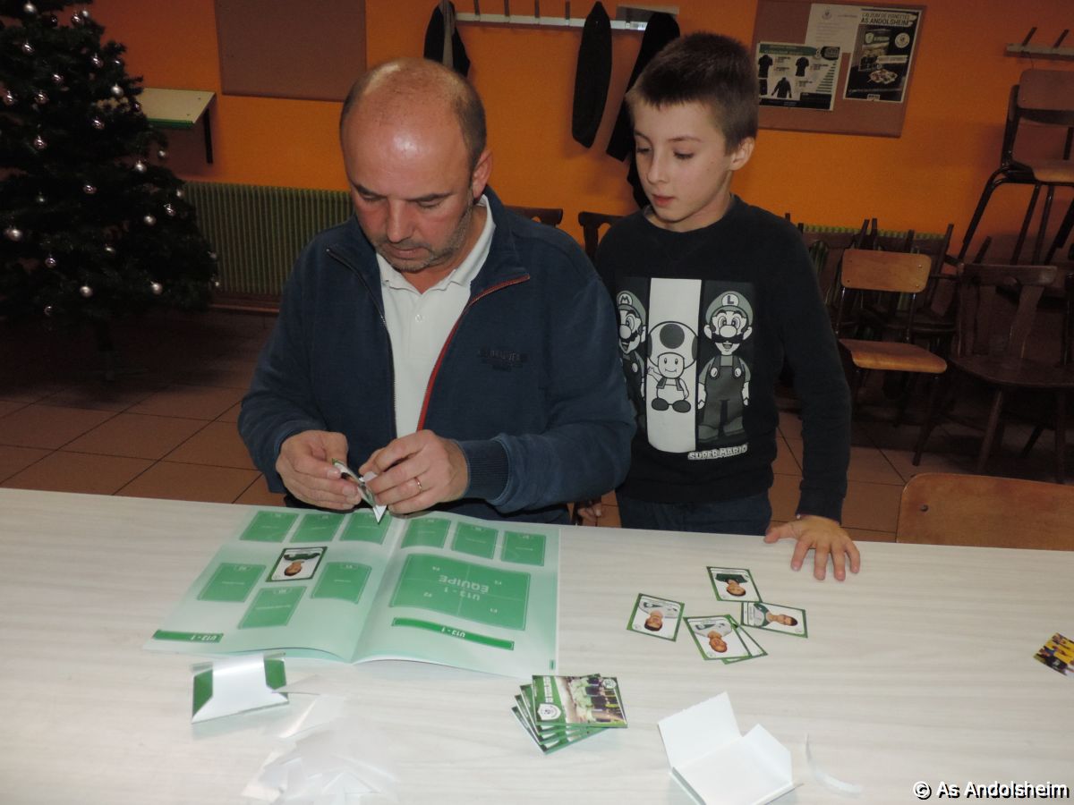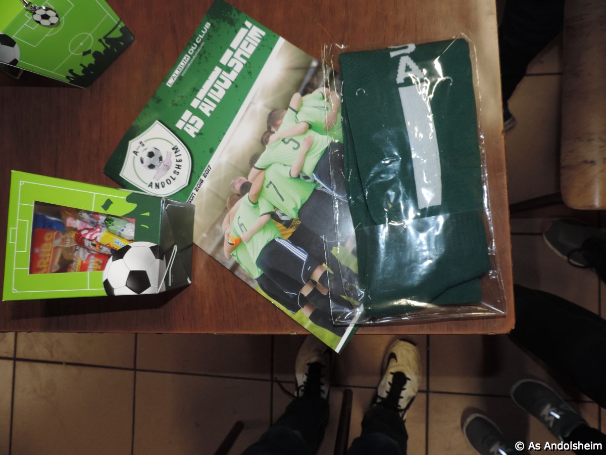Après le mot de Francis et les remerciements aux coachs, il distribue l'album panini, les 6 pochettes de vignettes ainsi que les chaussettes vertes au logo de l'ASA et un petit paquet de friandises de la part de Patrice et Sabrina à leurs joueurs.