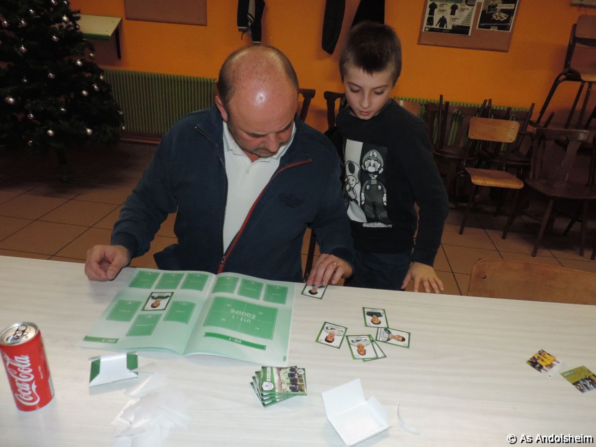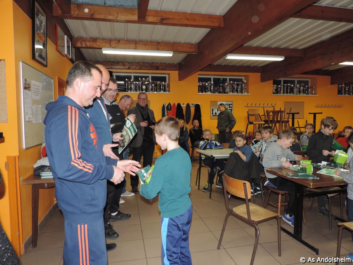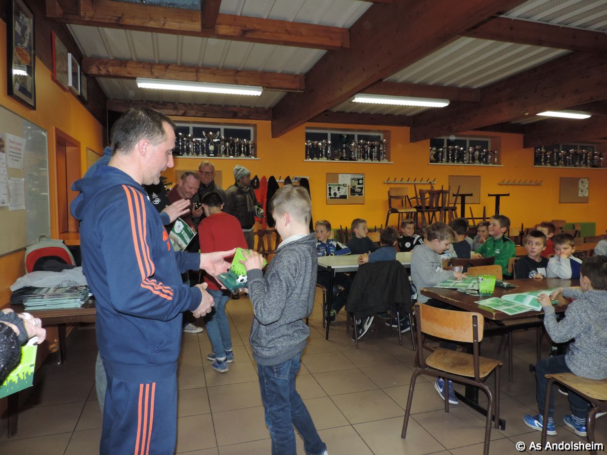 Après le mot de Francis et les remerciements aux coachs, il distribue l'album panini, les 6 pochettes de vignettes ainsi que les chaussettes vertes au logo de l'ASA et un petit paquet de friandises de la part de Patrice et Sabrina à leurs joueurs.