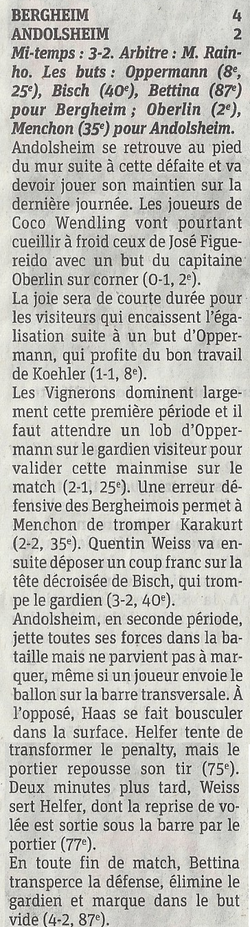 Météo orageuse et ambiance électrique samedi soir à Bergheim pour les verts venues sauver leur peau .. force est de constater que leur adversaire, qui n'avait plus rien à espérer de ce championnat , ne s'est pas présenté en touriste sur la pelouse et n'aura pas fausser ce championnat.