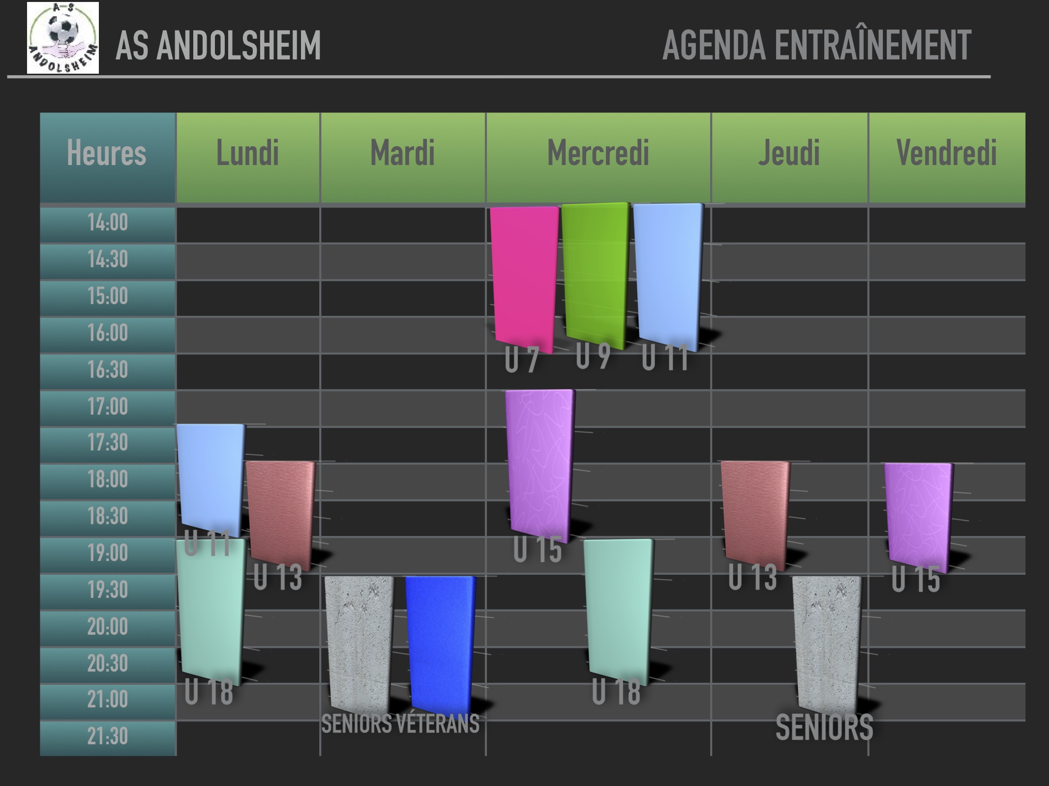 alors que la plupart des équipes de l'AS Andolsheim ont repris ou vont reprendre l'entraînement, voici le programme hebdomadaire par catégories pour la saison 2018/2019 PartagezTweetez