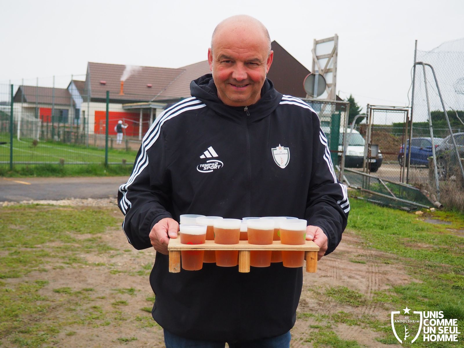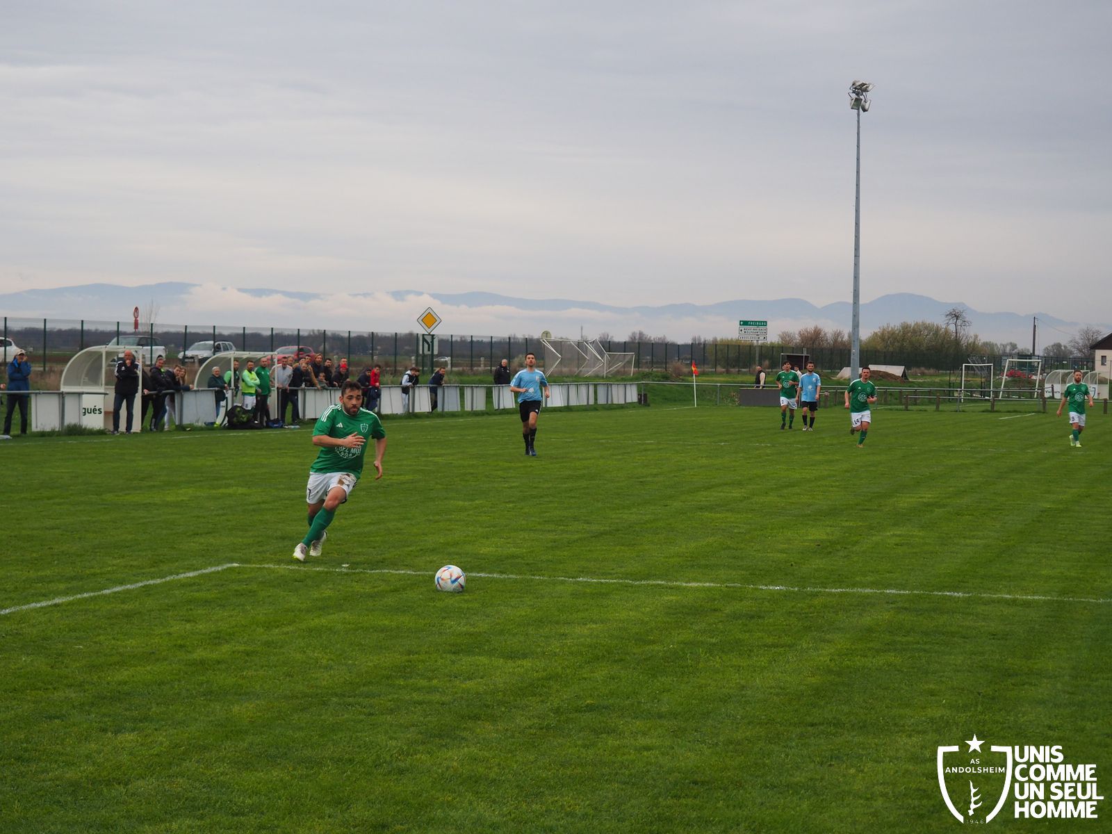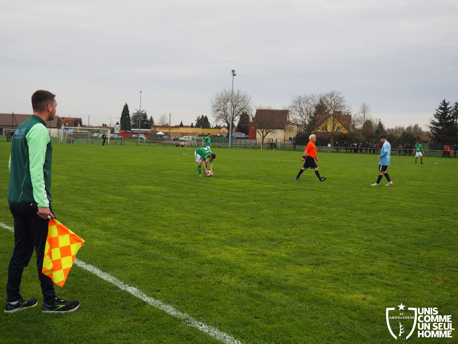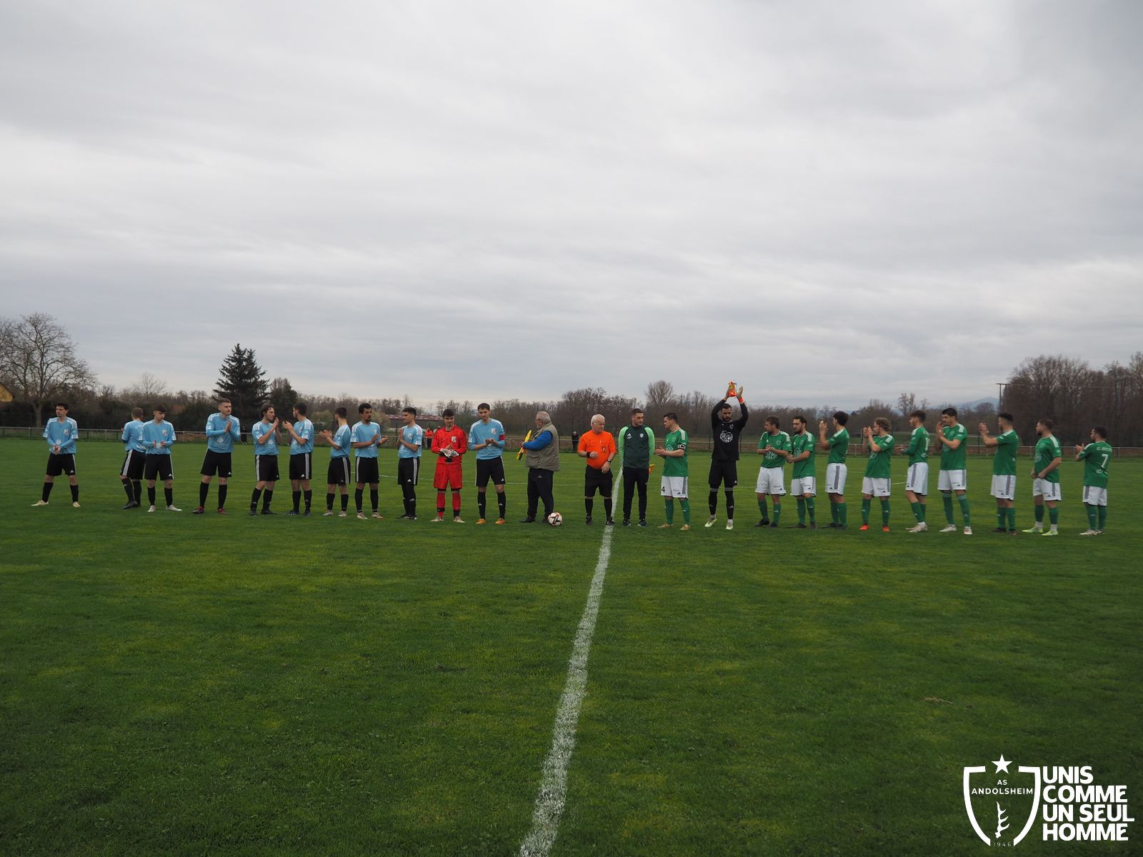 En ce dimanche grisâtre notre équipe fanion accueille l'AS Herrlisheim dans le cadre du championnat de D3. Le journal l’Alsace titrait récemment « L’ASA marche sur l’eau », et ce bel hommage rameute les foules. D’abord les officiels, Monsieur le Maire, Raymond, notre président, notre comité. Ensuite les VIP, notamment Monsieur Charles Platz, qui vient courageusement à bicyclette pour supporter son club de cœur, et qui est dignement accueilli par la présidence de l’ASA. Enfin le kop vert, venu en masse malgré la pluie. Notons que notre magnifique club house est inachevé mais déjà spectaculaire. Vestiaires utilisables, buvette encore organisée en extérieur, mais déjà le plaisir de rejouer, enfin, à la maison !
