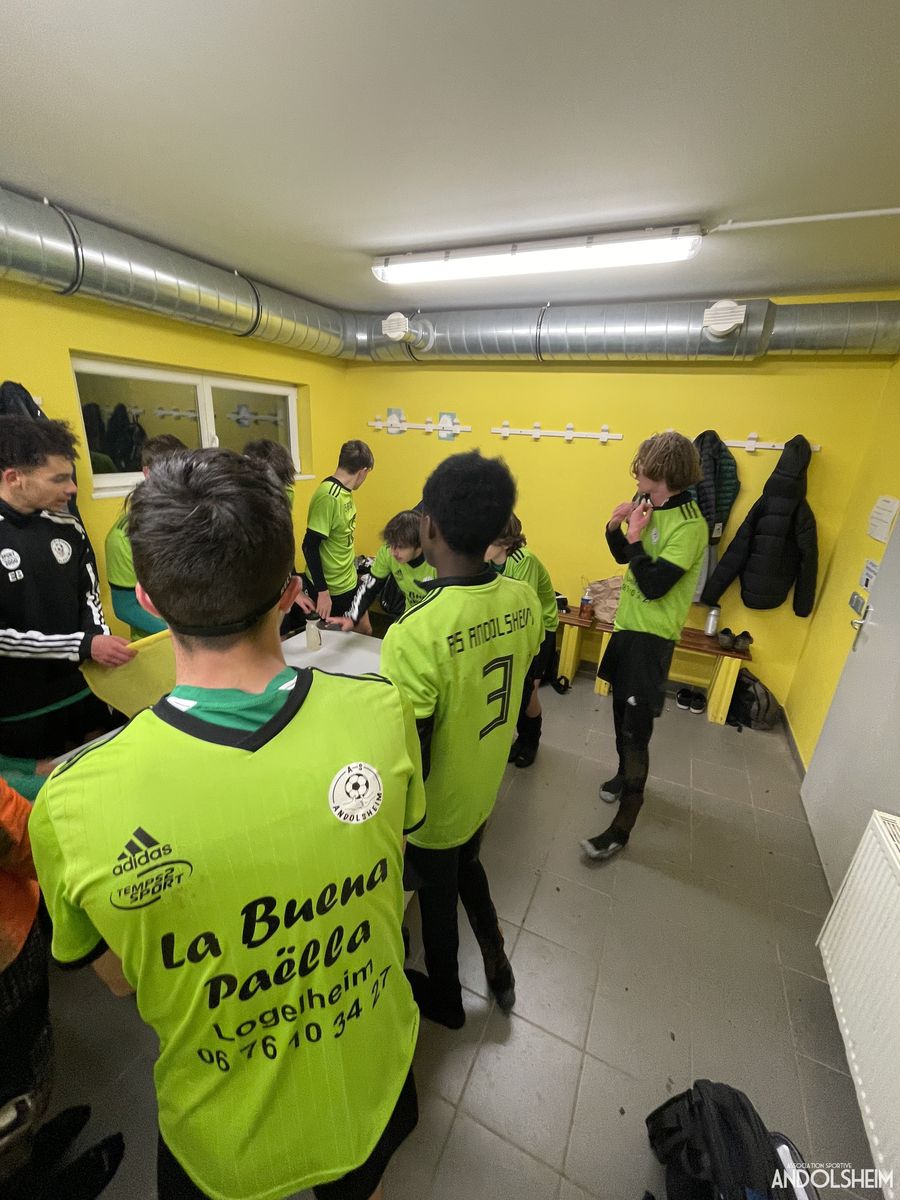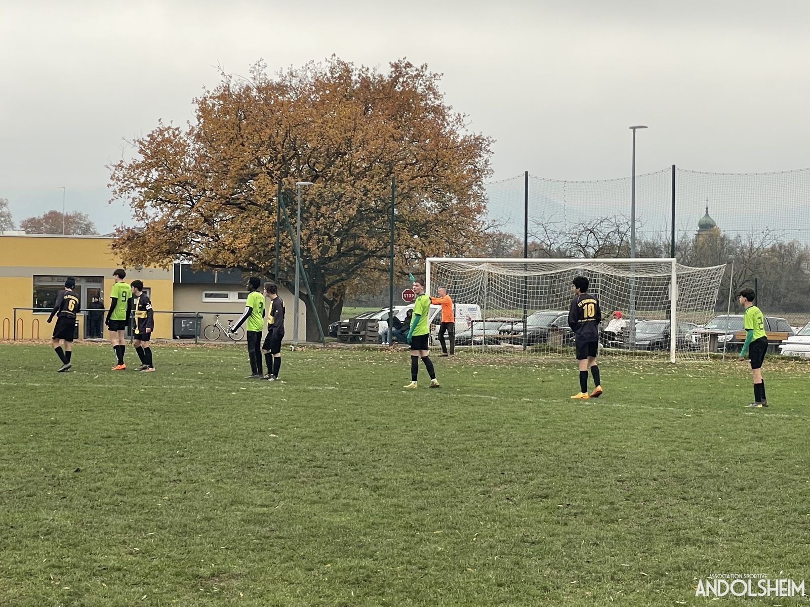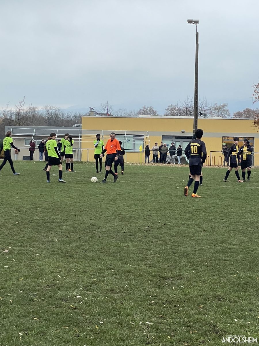 Et contre toute attente, c’est encore Kenan L qui nous sort d’un bien mauvais pas, suite à une passe lumineuse de Nathan qui se trouvait enfin à la bonne place qui lui avait été attribuée. Merci à Joris pour avoir tenu le rôle de juge de touche malgré ses mains gelées, et que cette victoire acquise d’une façon peu probable puisse être un déclic pour la suite. Ne boudons pas notre première et cela restera un joli cadeau d’anniversaire pour notre Masson qui a aussi eu le droit à sa biscotte jaune presque habituelle. Il a été gâté, nous un peu moins par le jeu mais retenons juste le résultat ; donc BRAVO à tous.