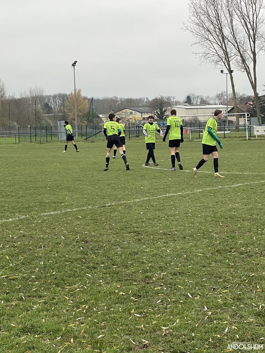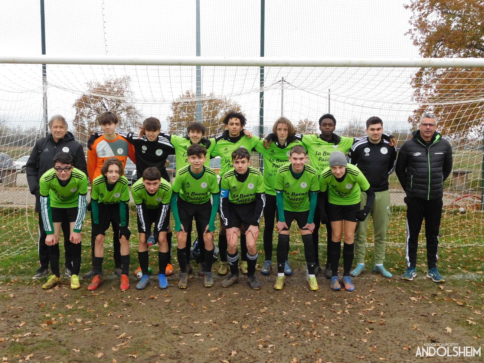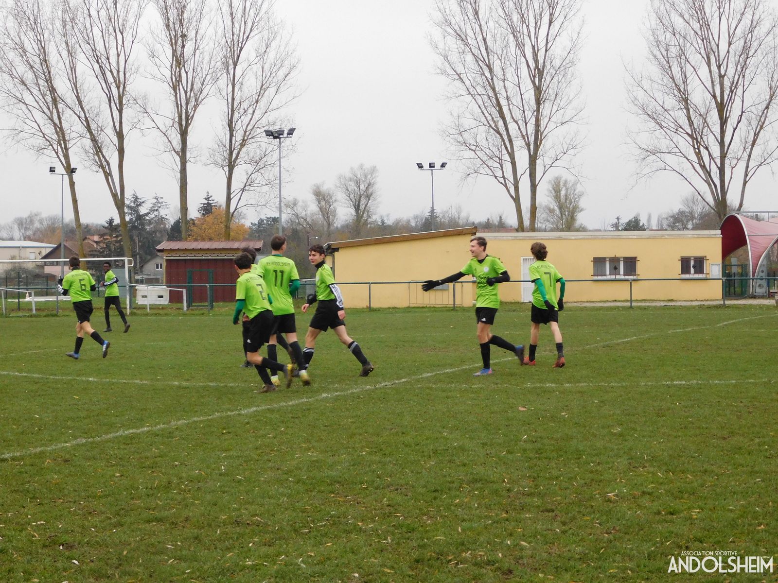 Et contre toute attente, c’est encore Kenan L qui nous sort d’un bien mauvais pas, suite à une passe lumineuse de Nathan qui se trouvait enfin à la bonne place qui lui avait été attribuée. Merci à Joris pour avoir tenu le rôle de juge de touche malgré ses mains gelées, et que cette victoire acquise d’une façon peu probable puisse être un déclic pour la suite. Ne boudons pas notre première et cela restera un joli cadeau d’anniversaire pour notre Masson qui a aussi eu le droit à sa biscotte jaune presque habituelle. Il a été gâté, nous un peu moins par le jeu mais retenons juste le résultat ; donc BRAVO à tous.