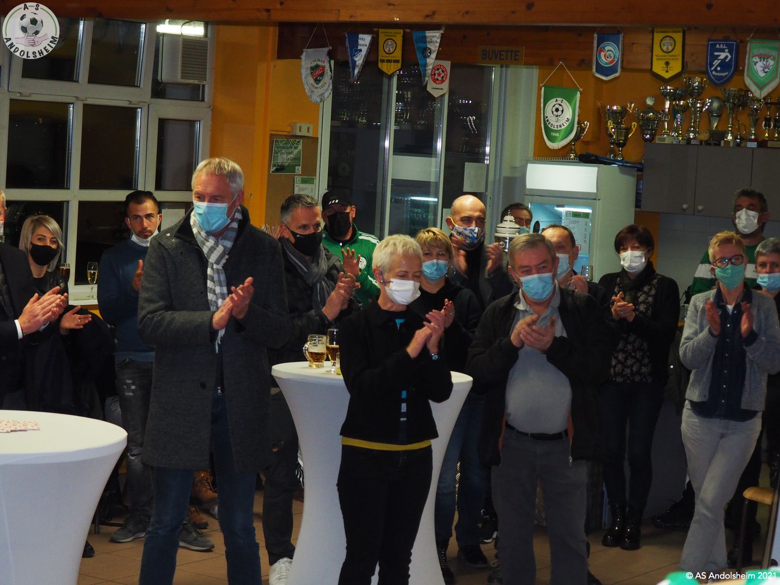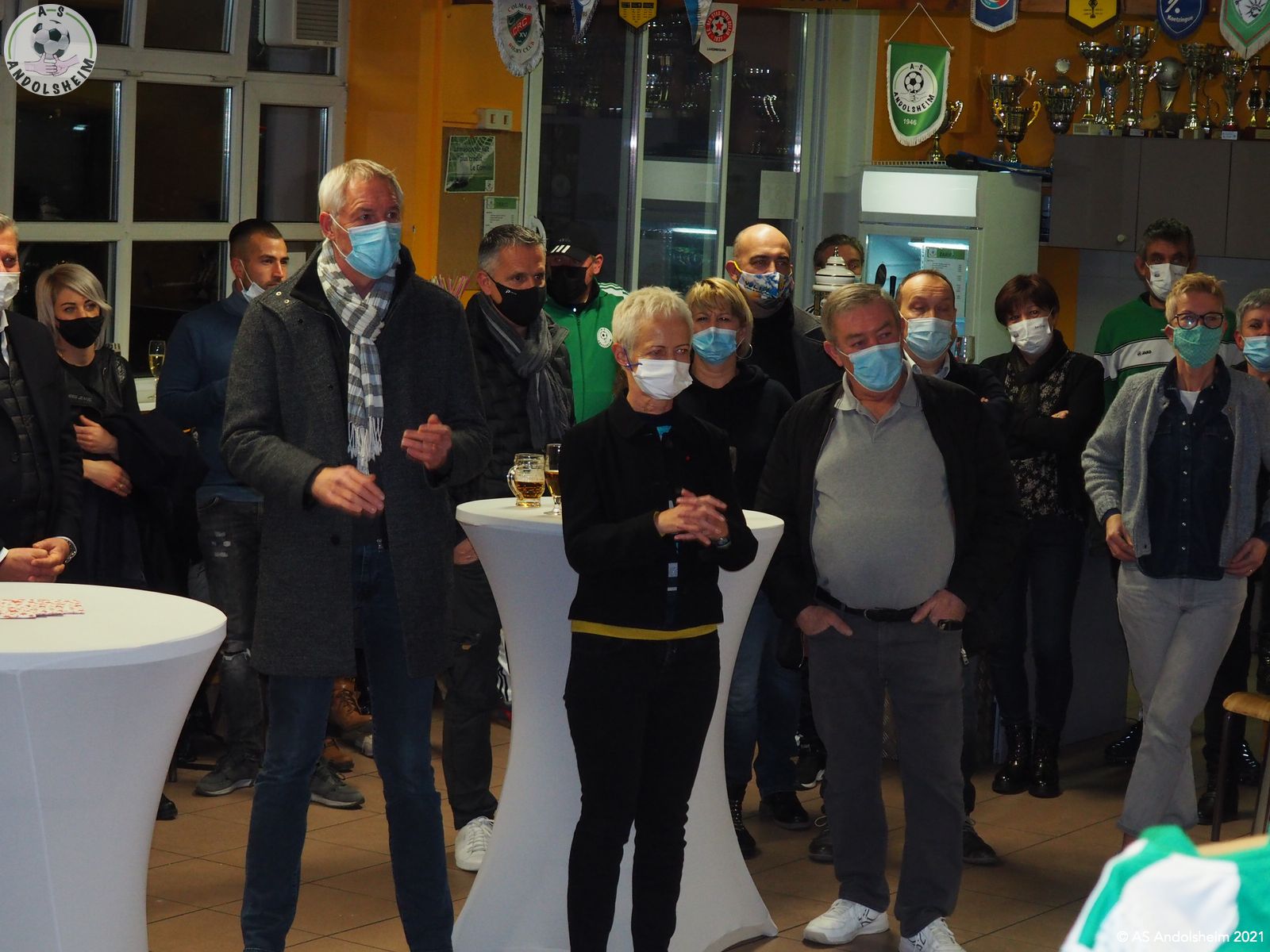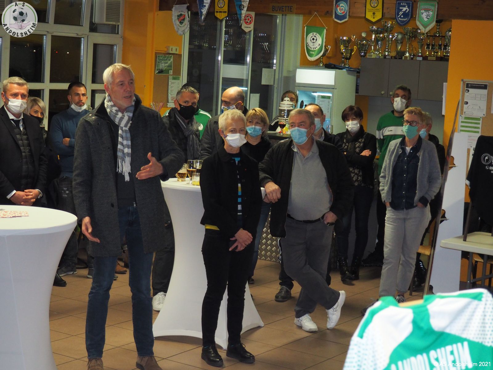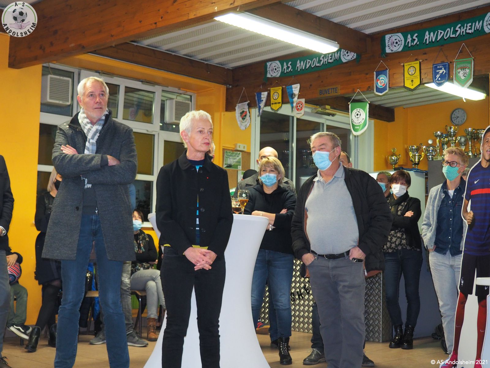 En ce Jeudi 9 décembre, l’ASA organisait sa grande soirée SPONSORS et PARTENAIRES. La première intervention est bien évidemment celle de notre Président Bonzon qui remercia les officiels présents, notamment M. le maire Christian REBERT et la ministre déléguée à l’Insertion Brigitte KLINKERT. Très chaleureux remerciements au premier magistrat de la ville et à notre chère ministre pour leur présence ce soir et leur soutien sans faille tout au long de l’année. Remerciements ensuite à tous nos partenaires pour leur soutien financier redoublé d’années en années. Monsieur le Maire s’exprime pour remercier également nos soutiens et pour évoquer également la collaboration permanente entre la ville d’Andolsheim et l’ASA. Notre maire rappelle que le chantier prochain du nouveau complexe d’accueil et de vestiaires s’inscrit dans ce partenariat de longue durée. Enfin notre ministre Brigitte Klinkert évoque avec notre président des possibilités de projet d’insertion par le sport, projets dans lesquels l’ASA a évidemment toute sa place. A ce sujet notre ministre alsacienne de l’insertion rencontre Roxana Maracineanu cette semaine, notre ministre alsacienne des sports, pour aborder ce sujet. Jean Baptiste Caillebotte , notre trésorier, prend ensuite la parole pour remercier encore une fois nos partenaires, puis, Gérard Abraham, qui est en charge du partenariat, présente également des remerciements chaleureux sous des applaudissements nourris. Remercions tous les bénévoles du club qui avaient préparé une petite restauration très bienvenue. Et, cerise sur le gâteau, ou plutôt sur la bretzel, notre président annonce qu’il y aura une surprise pour la soirée des bénévoles de l’ASA, le 25 février prochain. Citons pour finir, car ils le méritent, et par ordre alphabétique des communes, tous nos partenaires !
