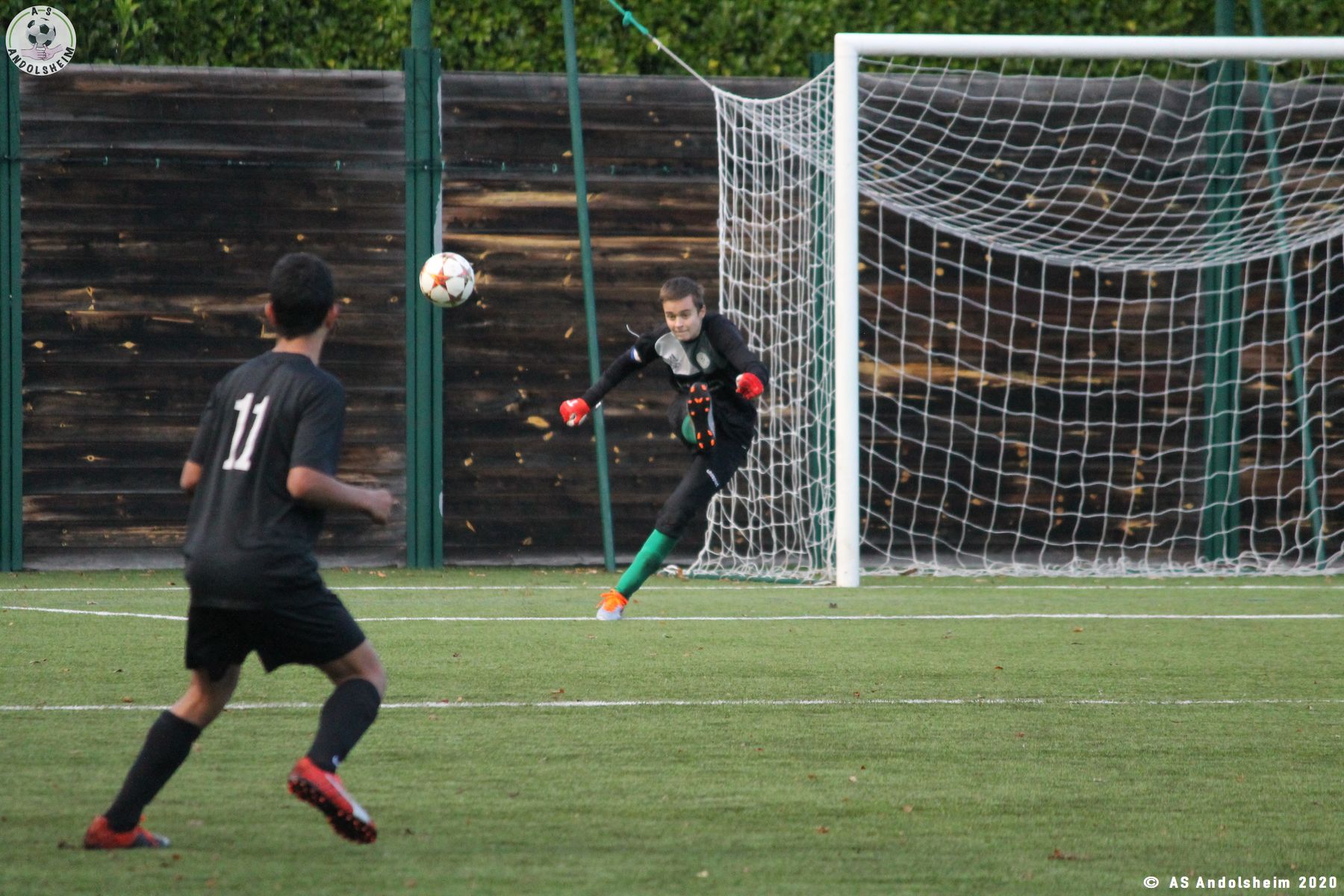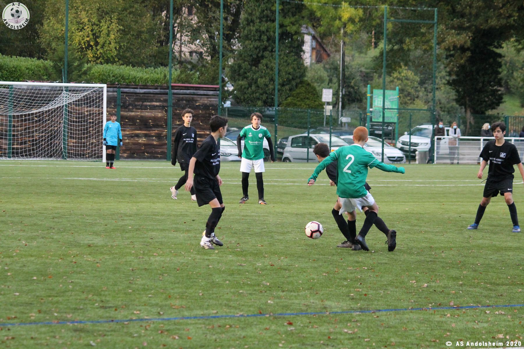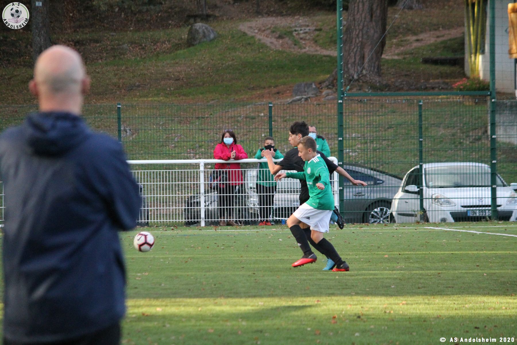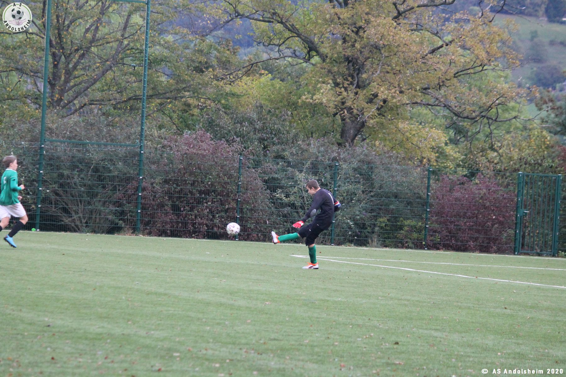 Début de match avec un gros pressing de la part de l'AS Andolsheim durant les 15 premières minutes. Un pressing qui aurait pu être payant dès la première minute, en effet le gardien étant surpris par le pressing effectué, a failli perdre le ballon devant son but grand ouvert. Le pressing effectué par le trio offensif IHLAN, MAXENCE et MATTEO FILOCHIO était très mal organisé et mal effectué, de plus le milieu de terrain composé de TOM, KILLIAN et AYMERIC ne semblait pas suivre le pressing lancé par l'attaque. Cela a eu donc comme conséquence un grand vide au milieu de terrain qui a permis à l'adversaire de progresser depuis sa défense. Cela va leurs porter préjudice car ils vont commencés à courir après le ballon jusqu'à la fin de la première mi-temps et encaisser le premier but vers la 20ème minute. On constate une anomalie au milieu de terrain ainsi qu'un gros manque d'agressivité, on remarque ce manque de présence par le retard qu'avaient les joueurs ďandolsheim sur chaque ballon ! Un petit mieux à partir de la 30ème minute avec la première occasion ďandolsheim et des attaques hésitantes jusqu'à la mi-temps. Reprise de la deuxième mi-temps avec d'autres intentions, en effet le discours du coach THOMAS leurs redonnent espoir. Les joueurs ne sont finalement toujours pas très convaincants et ne réagissent pas malgré les occasions créées notamment par l'intermédiaire de coup francs bien tirés de la part de ROBIN. Les joueurs de l'as andolsheim continuent de subir durant cette mi-temps avec le même problème que la première mi-temps : leurs manque de physique, d'impact et de combativité ! Ils encaissent ainsi un 2ème but sur une percée d'un joueur adverse qui transperce la défense et enfin ils encaissent le 3ème but sur frappe qui file entre les doigts du malheureux CLÉMENT. Une fin de match qui laisse perplexe mais qui laisse envisager un gros progrès de la part de l'équipe de l'As Andolsheim !!!