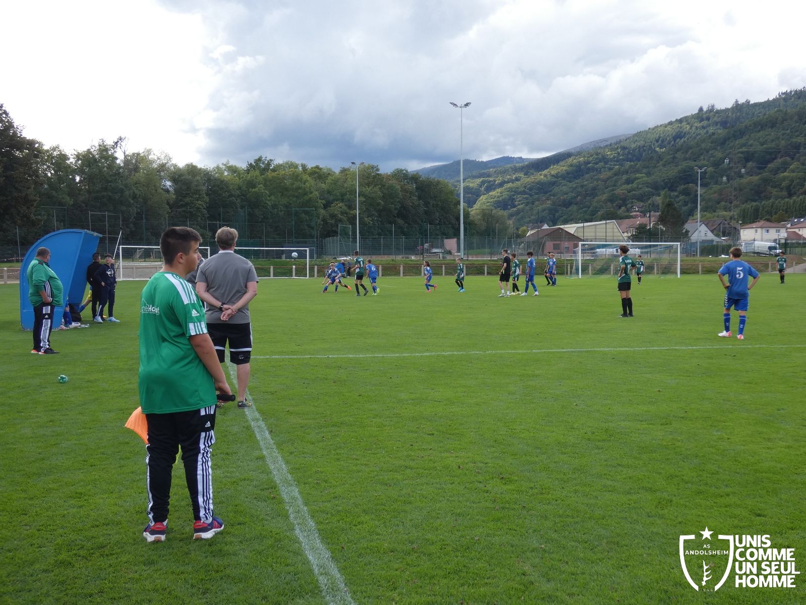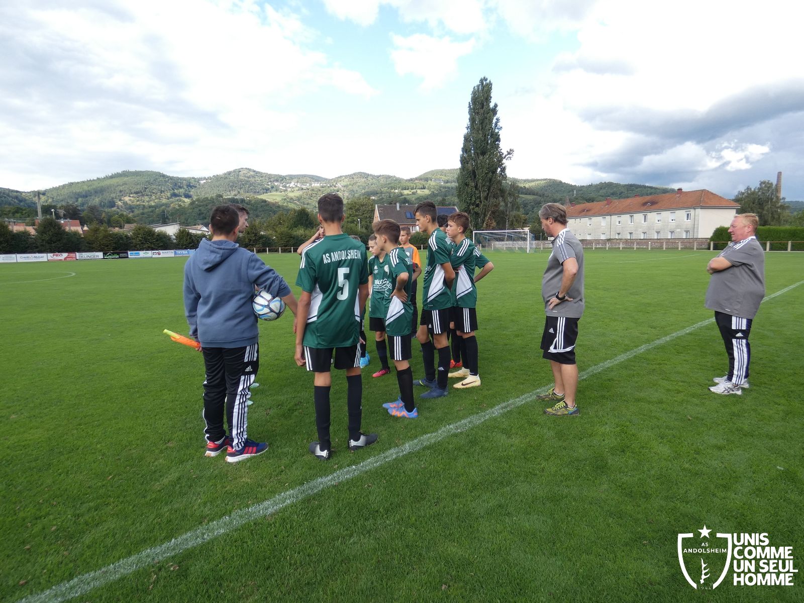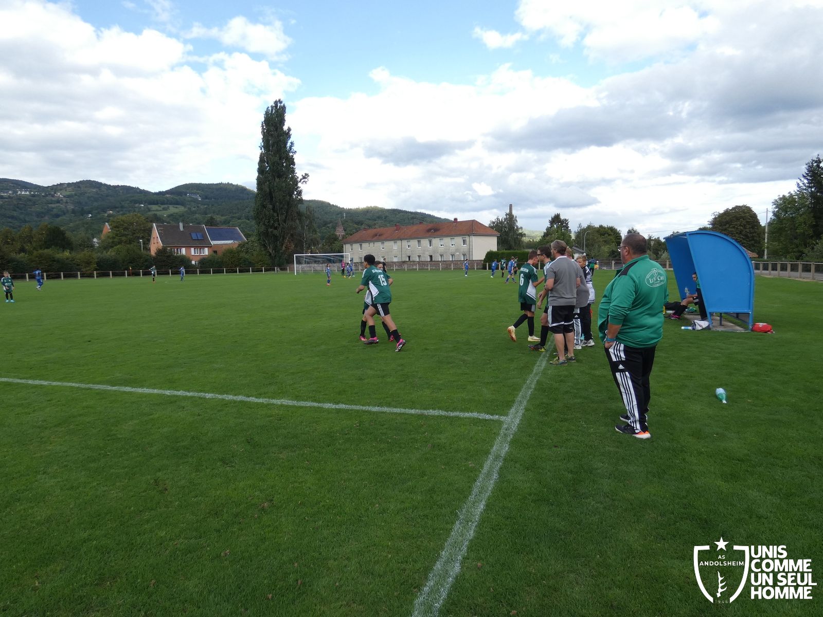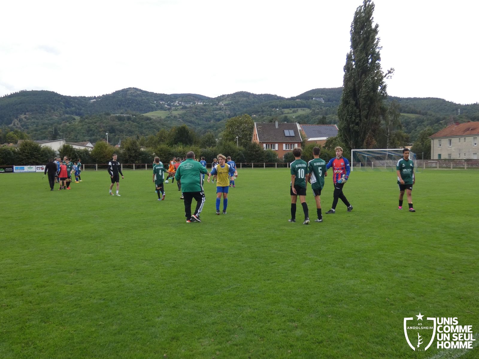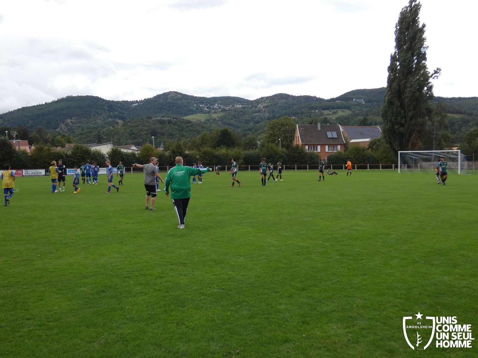Pour ce deuxième match du championnat, nos Verts se sont déplacés sur les terres de l’AS Munster samedi dernier. Marc et Stéphane étaient à la manœuvre pour le coaching. Après l’échauffement de rigueur, l’arbitre local siffle le rassemblement pour une entrée sur le terrain à la manière des seniors. Louis A les accompagne cet après-midi en tant que juge de touche.