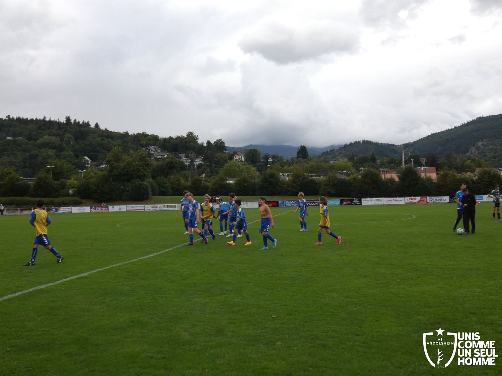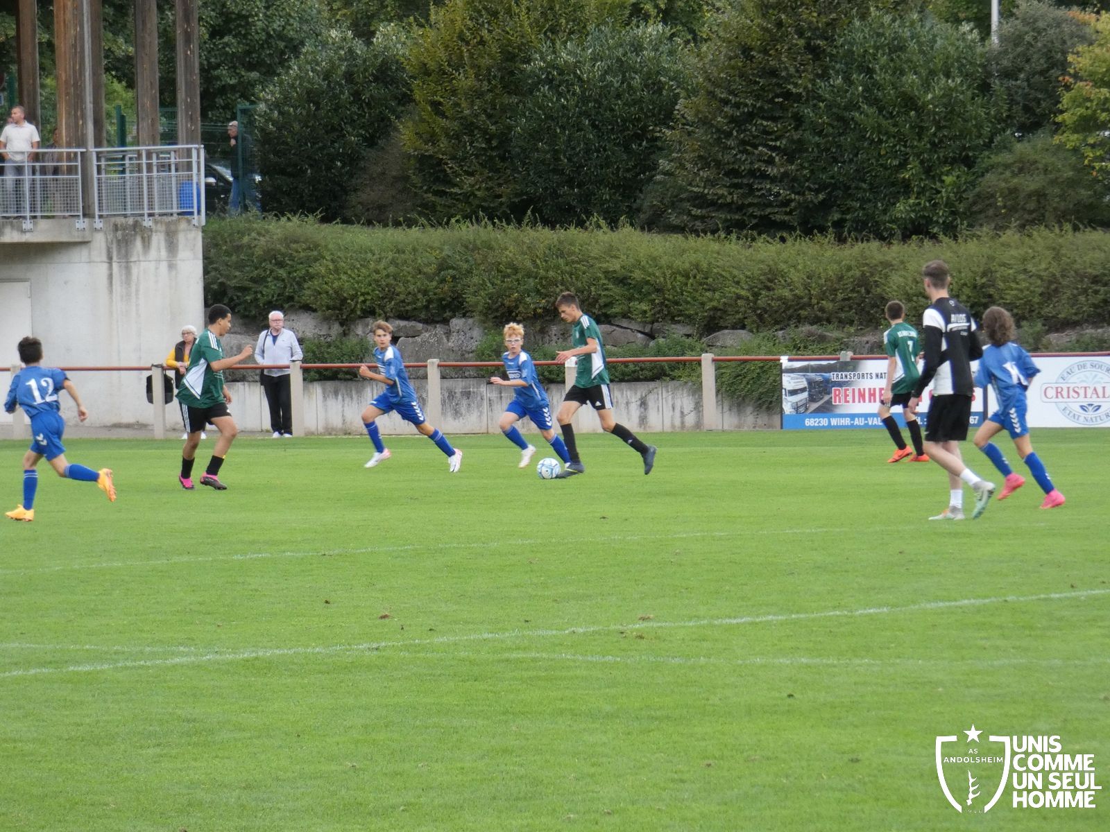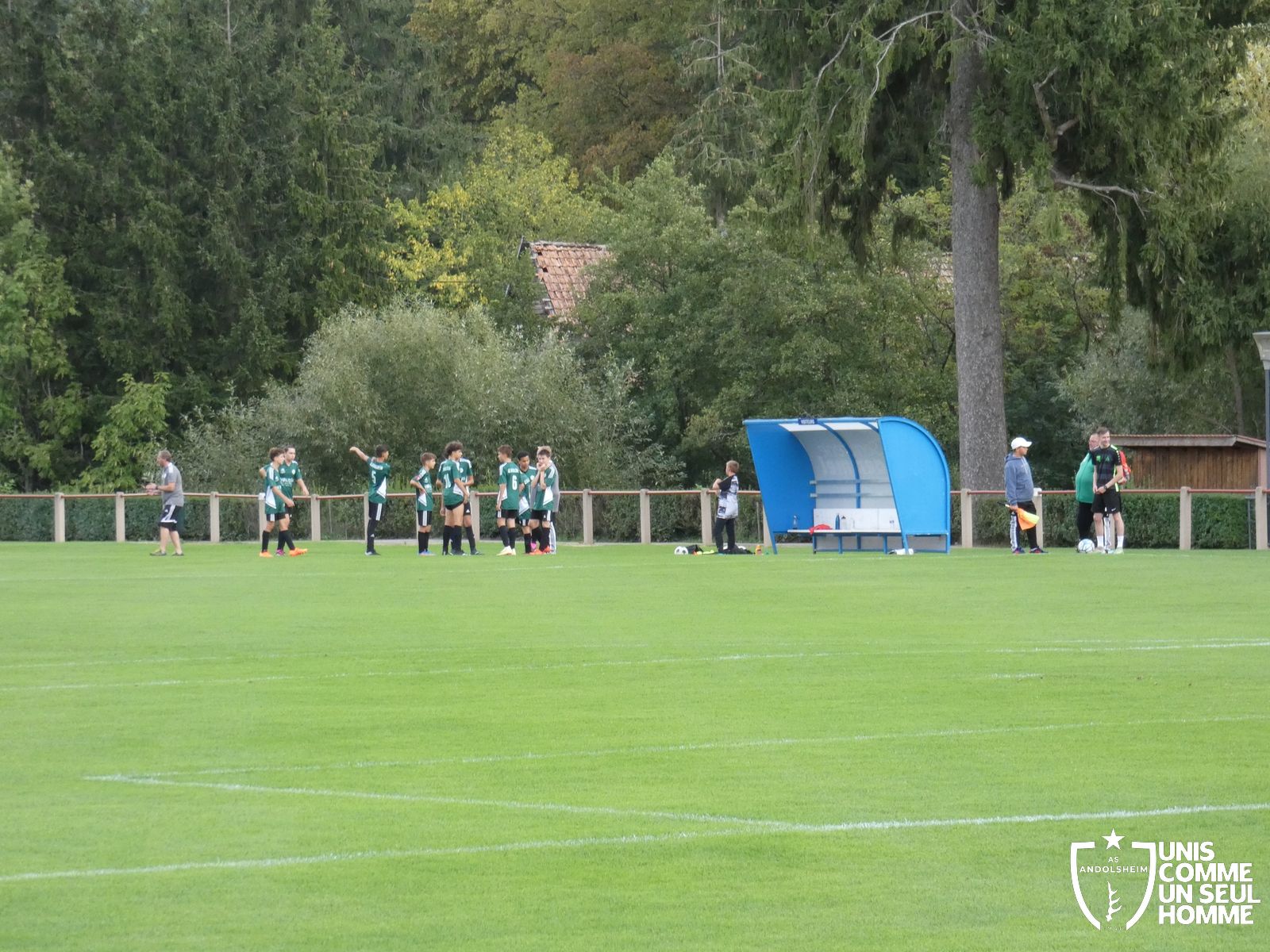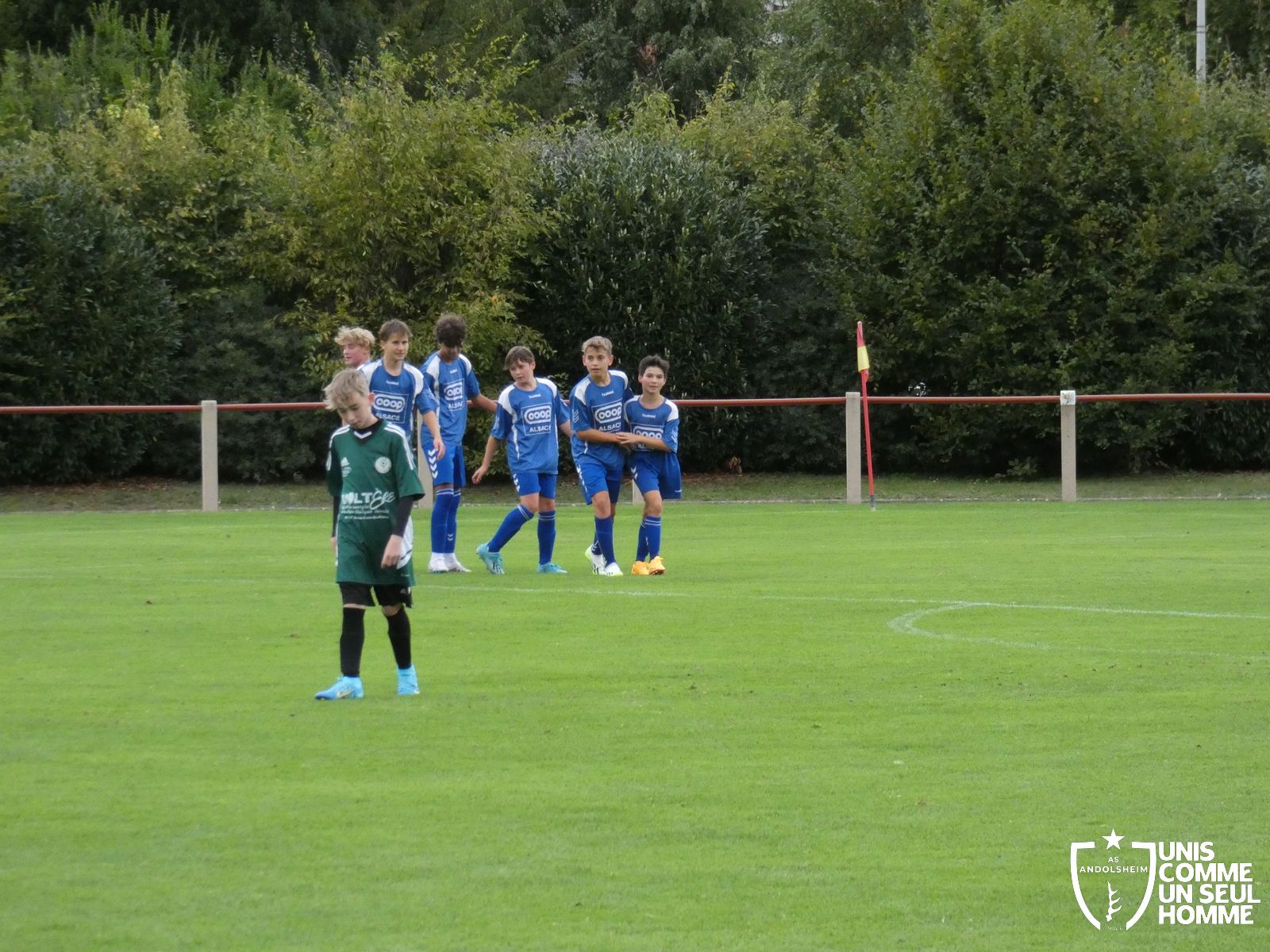 Pour ce deuxième match du championnat, nos Verts se sont déplacés sur les terres de l’AS Munster samedi dernier. Marc et Stéphane étaient à la manœuvre pour le coaching. Après l’échauffement de rigueur, l’arbitre local siffle le rassemblement pour une entrée sur le terrain à la manière des seniors. Louis A les accompagne cet après-midi en tant que juge de touche.
