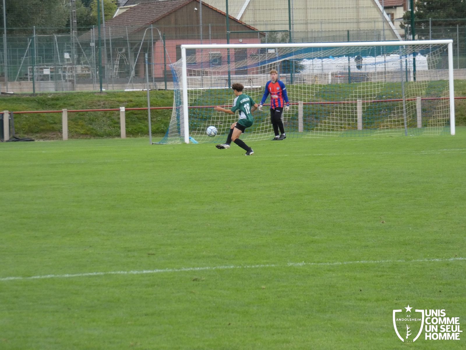 Une entame de match très timide pour nos Verts qui semblent ne pas vouloir prendre en main la possession de balle. Les premières alertes surviennent rapidement dans la surface d’Enguerrand. Dès la cinquième, les Bleus ouvrent donc le score grâce à leur attaquant de pointe qui se joue de notre portier sur sa sortie. On n’arrive toujours pas à poser le ballon et aligner deux passes correctes. Sur une incursion dans la surface adverse, Gabin L obtient un pénalty pour une main du défenseur. Thibaut se charge de tirer celui-ci dans le petit filet.
