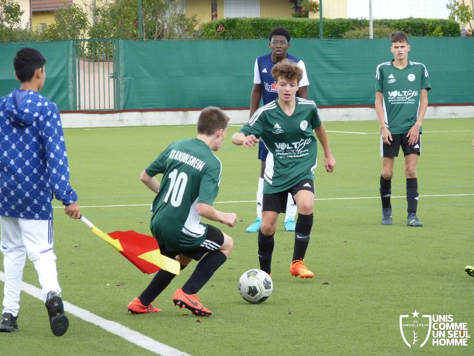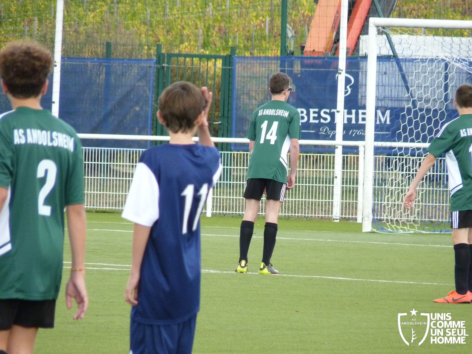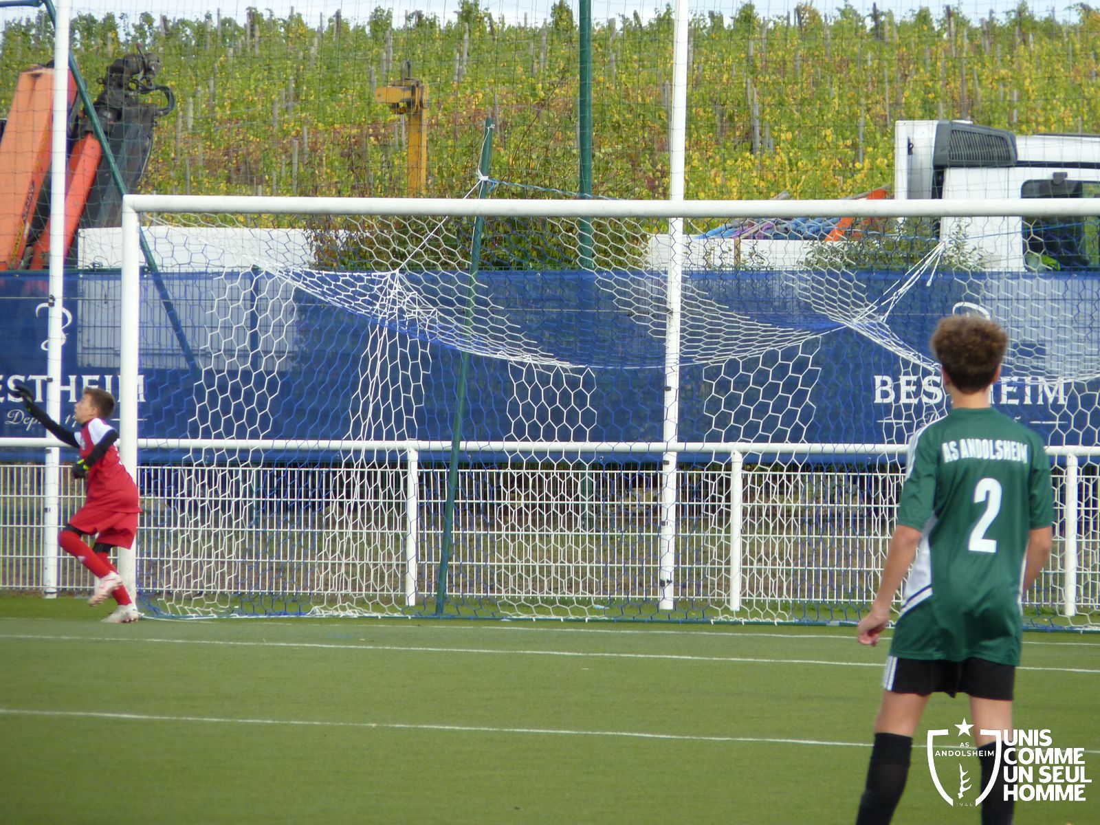Bennwihr obtient un coup franc, Louis place son mur, le joueur adverse se lance et Louis détourne la balle au ras du poteau droit au corner.