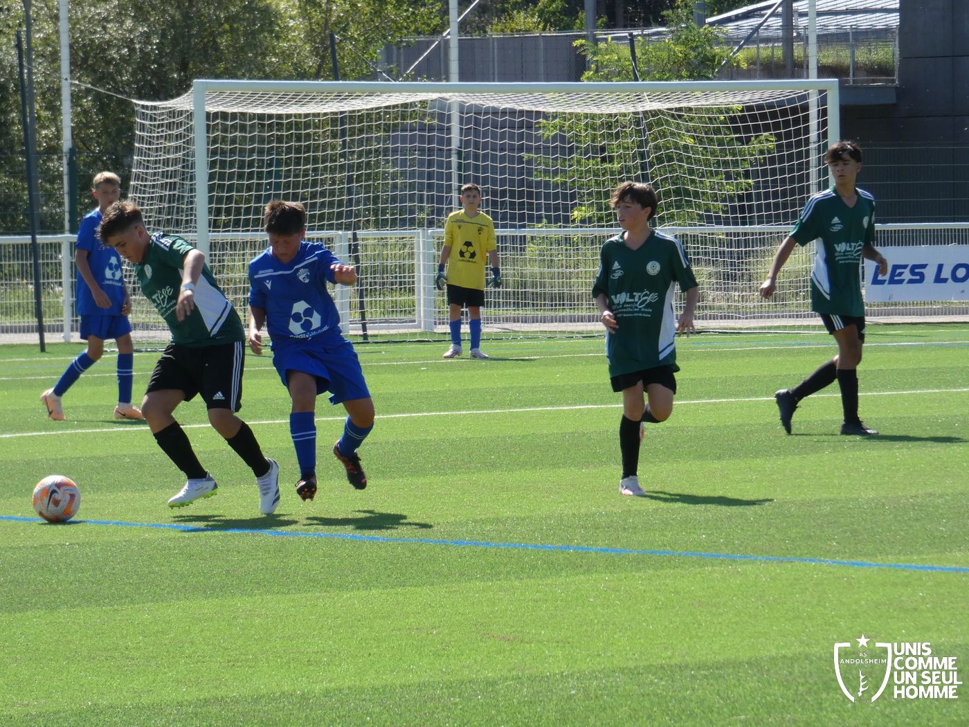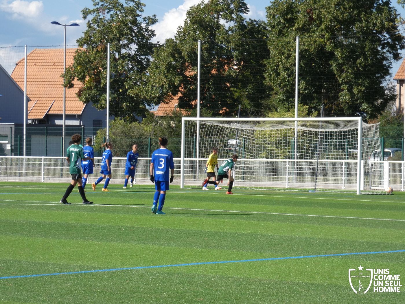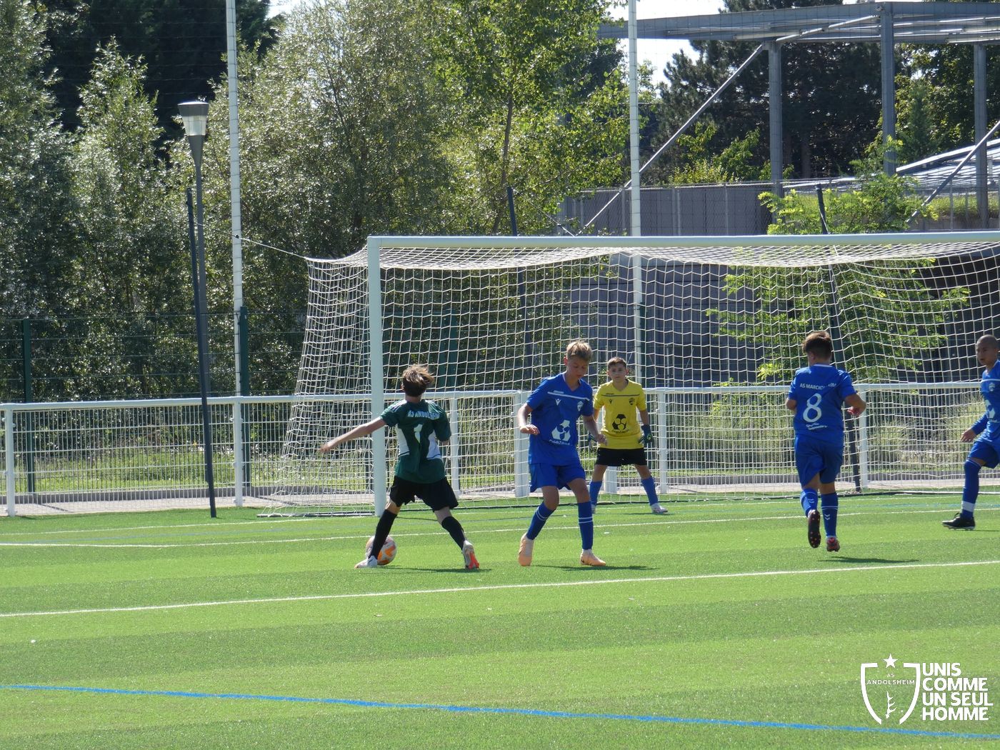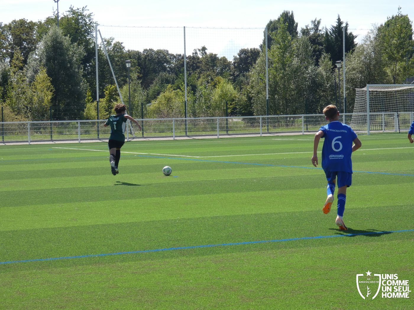 L’heure de la reprise sonne, nos Verts sont toujours présents sur les duels et continuent dans l’effort. Cela paie rapidement ! Alexis ajuste cette fois-ci une magnifique frappe des dix-huit mètres sous la barre. Nos jeunes pousses prennent enfin l’avantage. 1-2. Nous mettons toujours la pression sur la défense bleue et l’arbitre siffle un coup franc. Alexis réalise une belle frappe mais manque la lucarne de peu. Le jeu s’améliore chez nos jeunes et ils commencent à comprendre qu’il faut utiliser les couloirs pour provoquer des décalages dû fait de la transmission en triangle. Jules nous gratifie d’une belle transversale sur le côté droit de Gabin L, qui part dans la profondeur pour centrer sur Marwan. Celui-ci s’offre son doublé. Une belle phase de jeu à renouveler et qui a été bien appréciée par les coachs ! 1-3 pour l’ASA et rapidement 1-4 car Marwan est à la fête et semble être libéré en cette fin de rencontre. Il marque sur une très belle frappe des 20 mètres en lucarne.