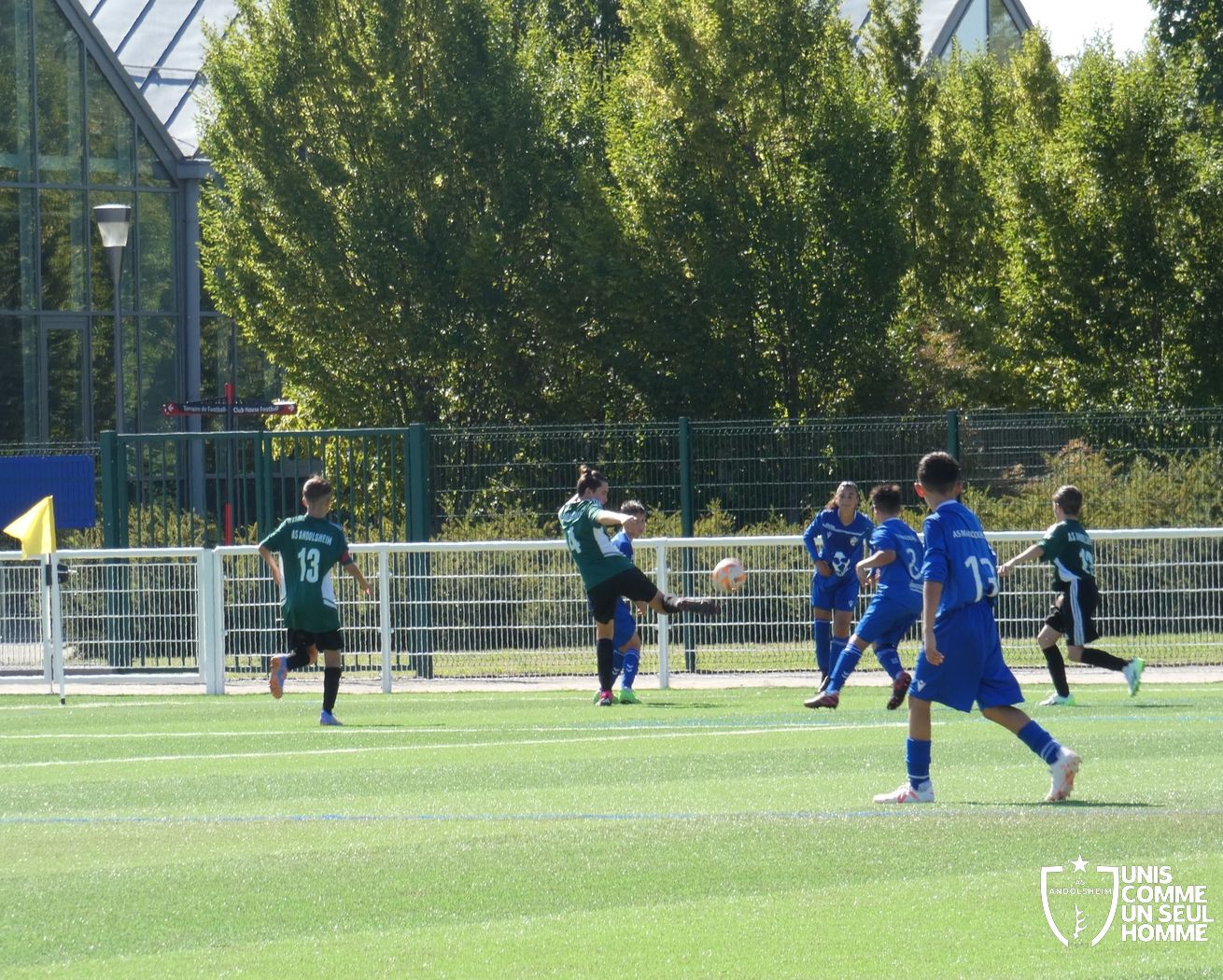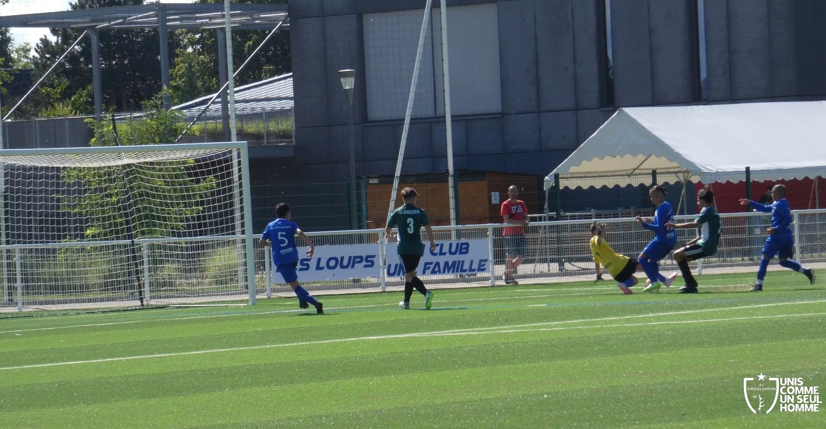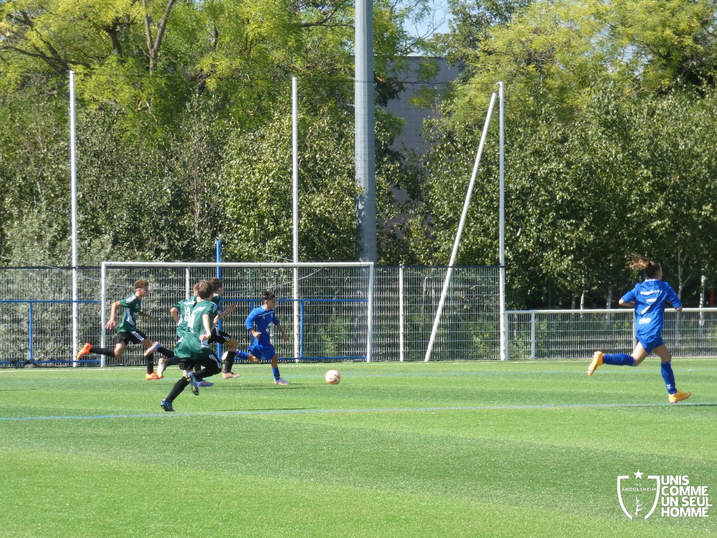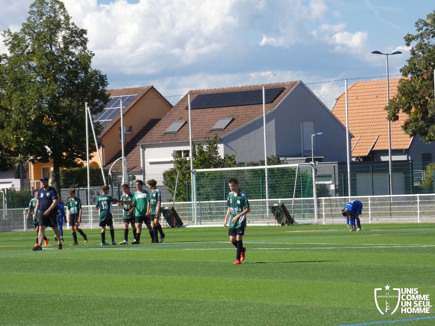 L’heure de la reprise sonne, nos Verts sont toujours présents sur les duels et continuent dans l’effort. Cela paie rapidement ! Alexis ajuste cette fois-ci une magnifique frappe des dix-huit mètres sous la barre. Nos jeunes pousses prennent enfin l’avantage. 1-2. Nous mettons toujours la pression sur la défense bleue et l’arbitre siffle un coup franc. Alexis réalise une belle frappe mais manque la lucarne de peu. Le jeu s’améliore chez nos jeunes et ils commencent à comprendre qu’il faut utiliser les couloirs pour provoquer des décalages dû fait de la transmission en triangle. Jules nous gratifie d’une belle transversale sur le côté droit de Gabin L, qui part dans la profondeur pour centrer sur Marwan. Celui-ci s’offre son doublé. Une belle phase de jeu à renouveler et qui a été bien appréciée par les coachs ! 1-3 pour l’ASA et rapidement 1-4 car Marwan est à la fête et semble être libéré en cette fin de rencontre. Il marque sur une très belle frappe des 20 mètres en lucarne.
